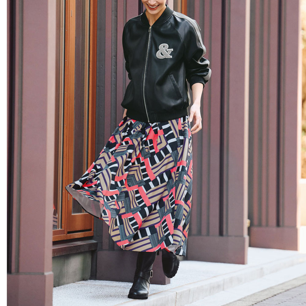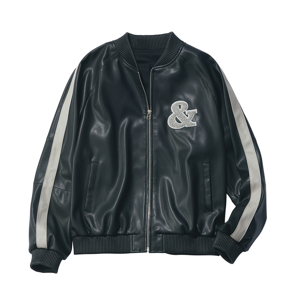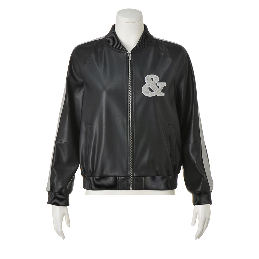 異素材合わせで魅せる大人の甘×辛スタイル扱いやすく、気軽に取り入れられる合成皮革ながら、レザー専門の縫製工場で仕立てた上質感あふれる見た目はまるで本物のラムレザーブルゾンのよう。袖のラインや左胸の「&」ワッペンで、スポーティなテイストをトッピングしました。着やすいベーシックな形は、スカートはもちろん、ワイドパンツなどにも好相性。