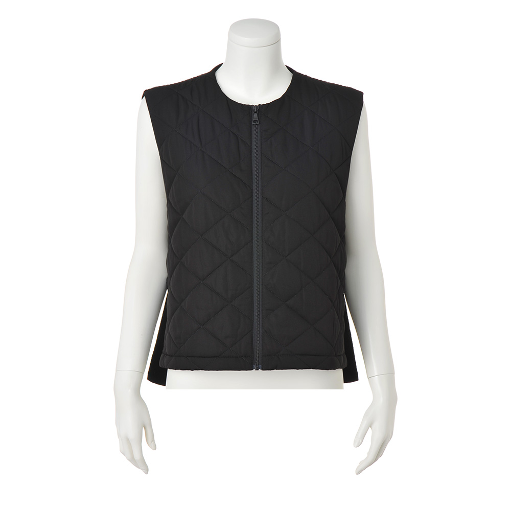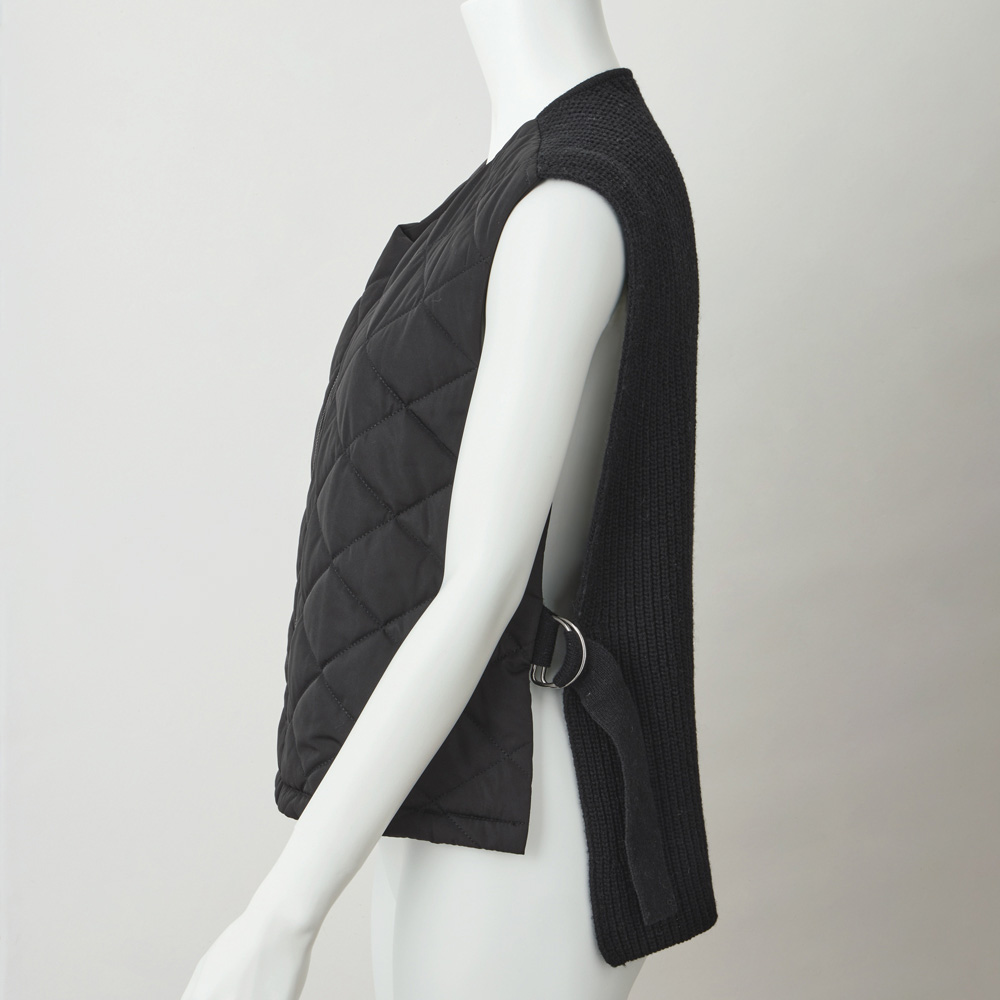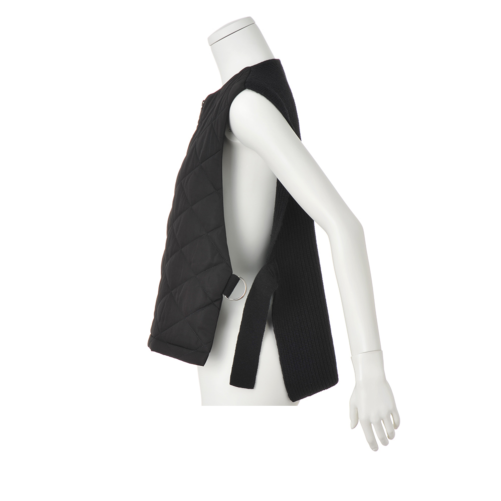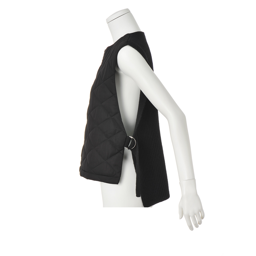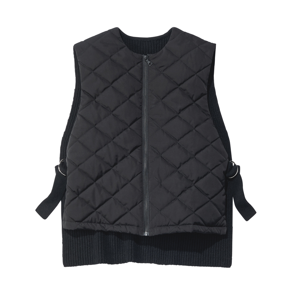 纏えばモード顔になるオシャレな防寒ベスト一点で装いの鮮度が上がる、異素材コンビのあったかベスト。前身頃は中わた入りキルト、後ろは畦編みのニットで、着膨れを抑える作りにしています。また前身頃をショート丈にすることでスタイルアップ効果を誘発。両脇はDカン付きニットベルトでスマートに繋ぎました。コーデの主役としても、コートインにしても、ロングシーズン活躍。
