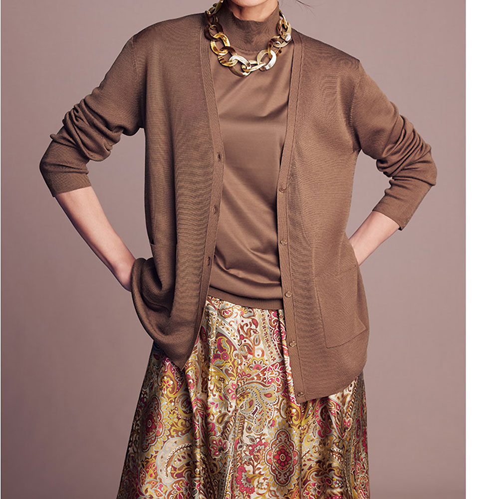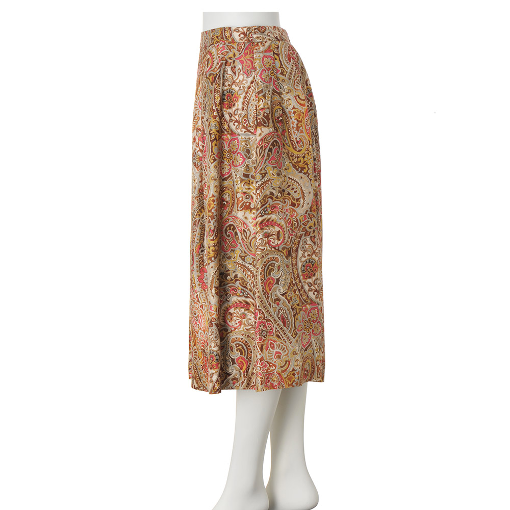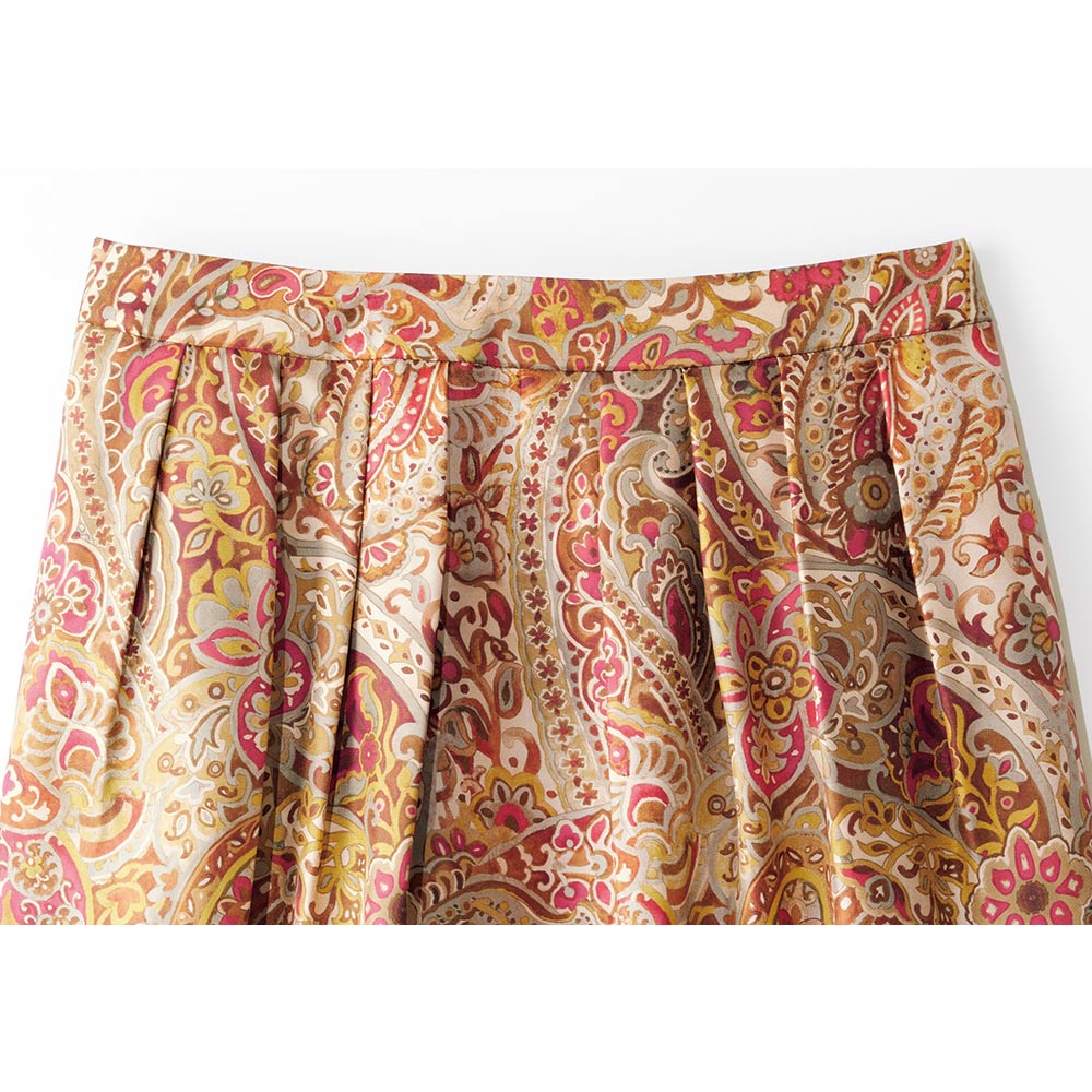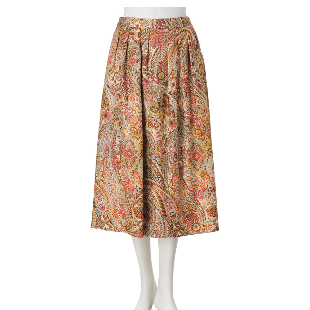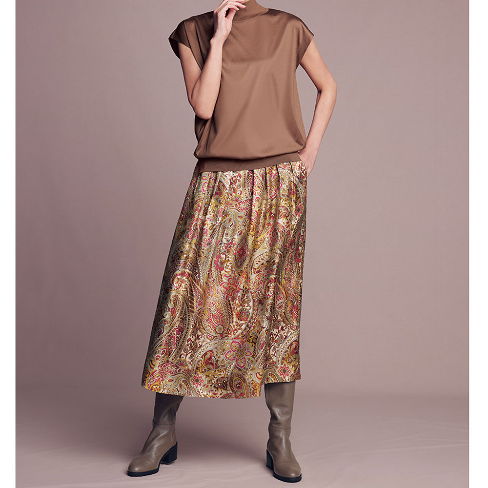 街に映えるのは、この艶やかな洗練エレガンス。イタリア「ERICA」社に特注したシルクツイル素材のオリジナルプリントスカート。ブラウン濃淡やピンクの手描き風ペイズリー柄が艶めきながら流れる、タックフレアーラインの美しさは必見です。しかもウエスト部分はカーブベルト仕様でフィット感も申し分なし!