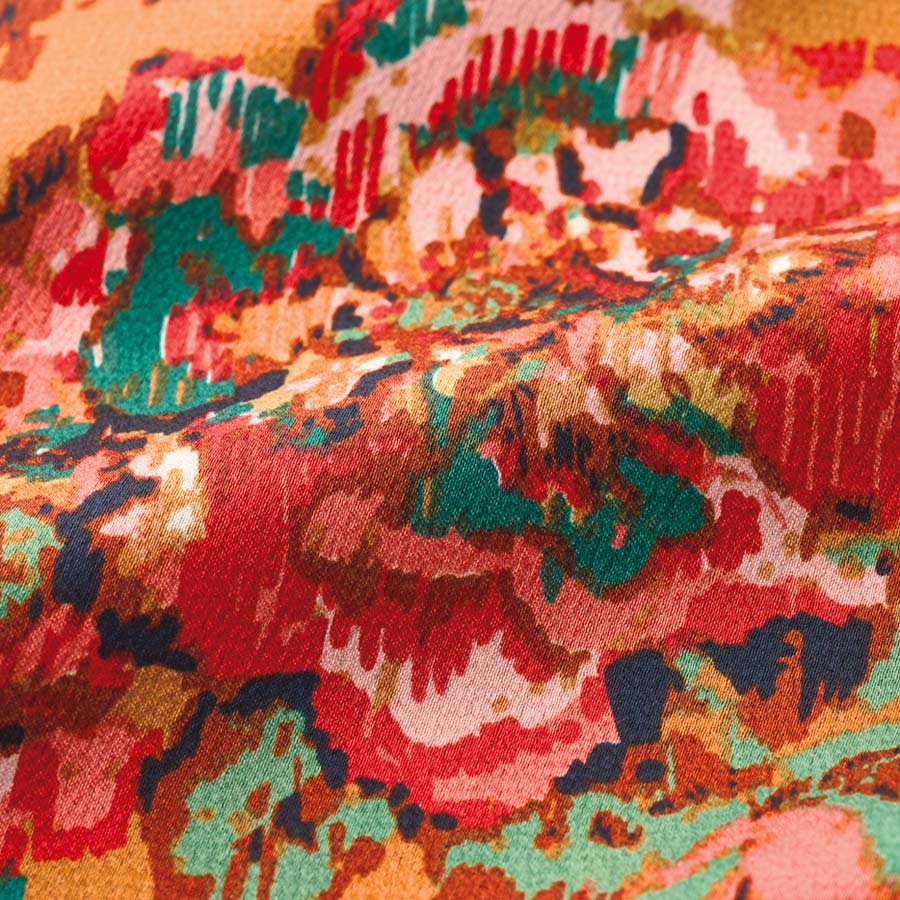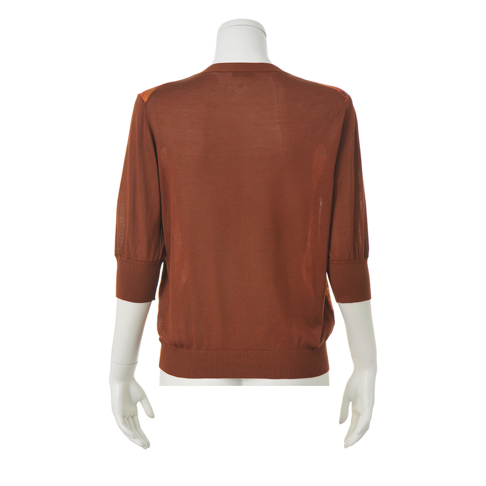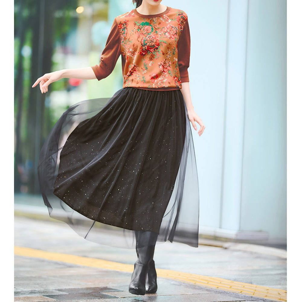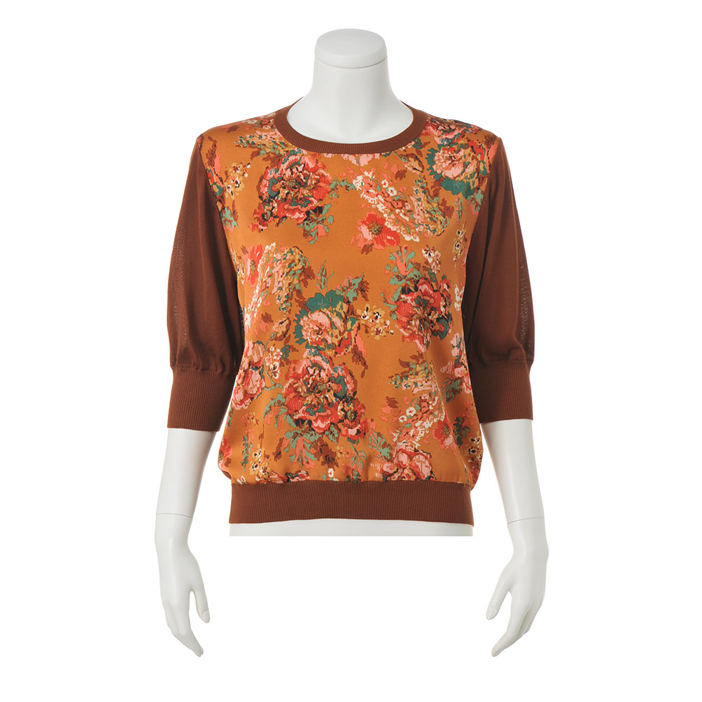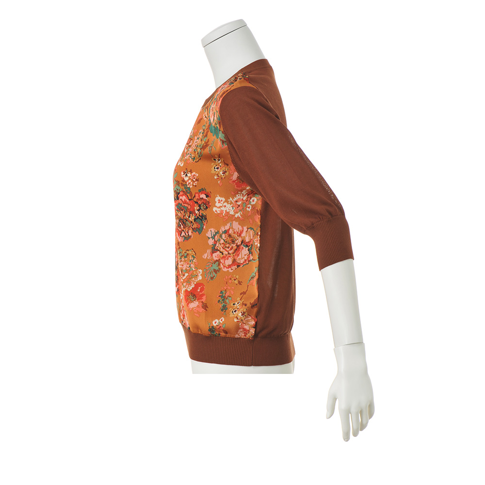 前身頃のサテン生地には抽象化した花や葉の柄をプリント。ハイゲージのニットとドッキングさせた、主役感のあるプルオーバーです。オレンジブラウン系のカラーも美しく、シンプルなコーディネートに華やかさをプラスしてくれるアーティスティックな一着。≫ POINTフラワーモチーフをプリントしたサテン生地を前身頃に配し、軽やかなハイゲージニットをドッキング。さらりとした着心地です。