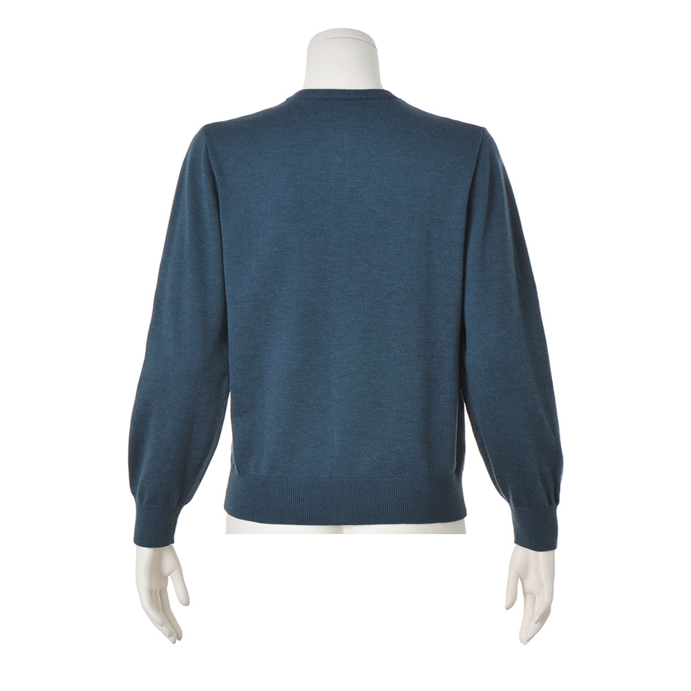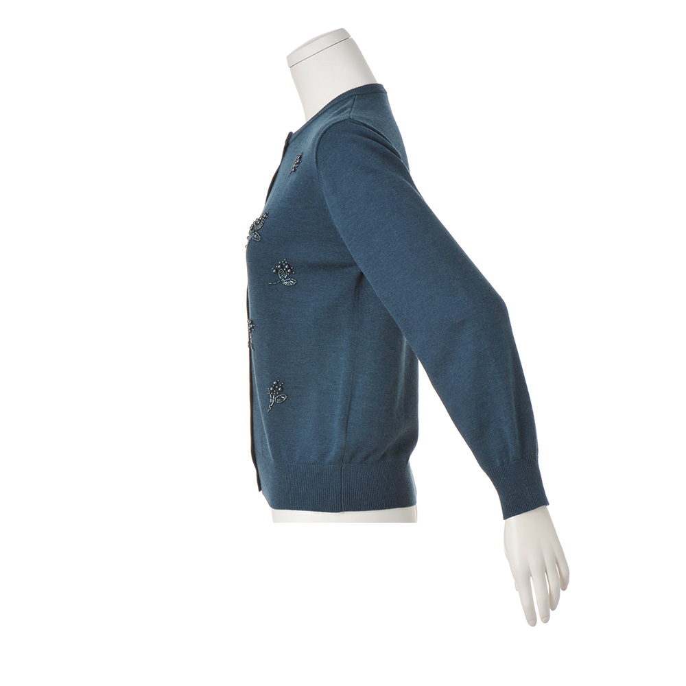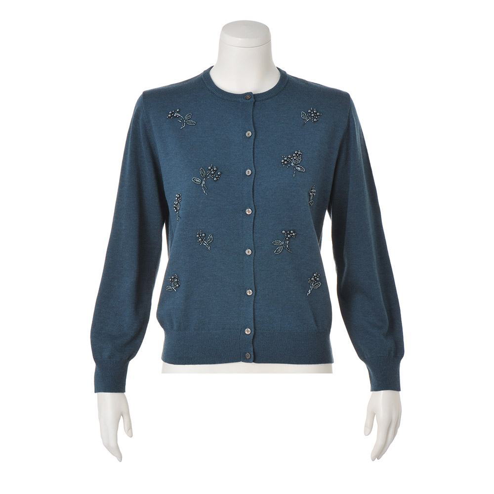 さりげない煌めきを纏って印象的なムードを手に入れるシンプルなクルーネックのカーディガンに、華やかなビーズ刺しゅうをプラスすることでロマンチックな一着に。深みのあるブルーグリーンがスタイリングのアクセントに。ふくらみがあり軽く、あたたかな着心地は、シーズンレスでワードローブの味方になるアイテムです。