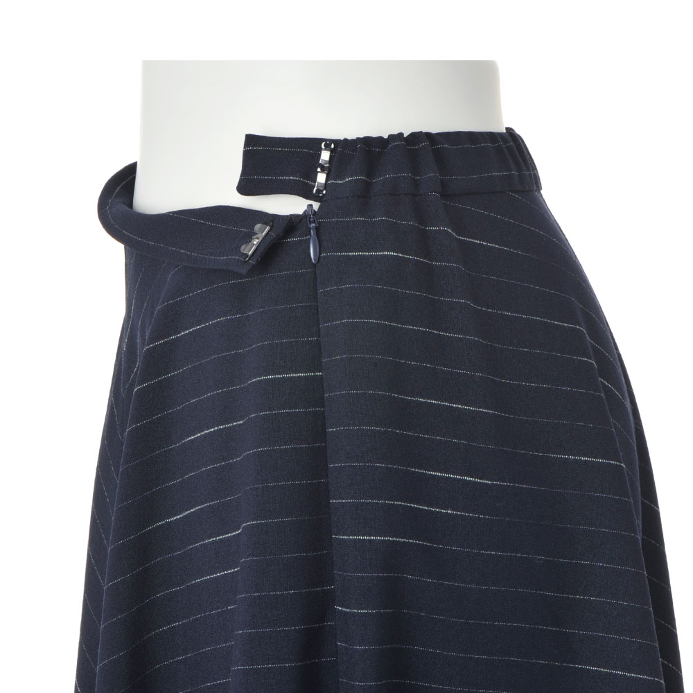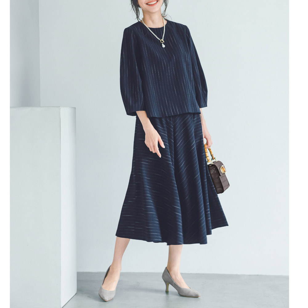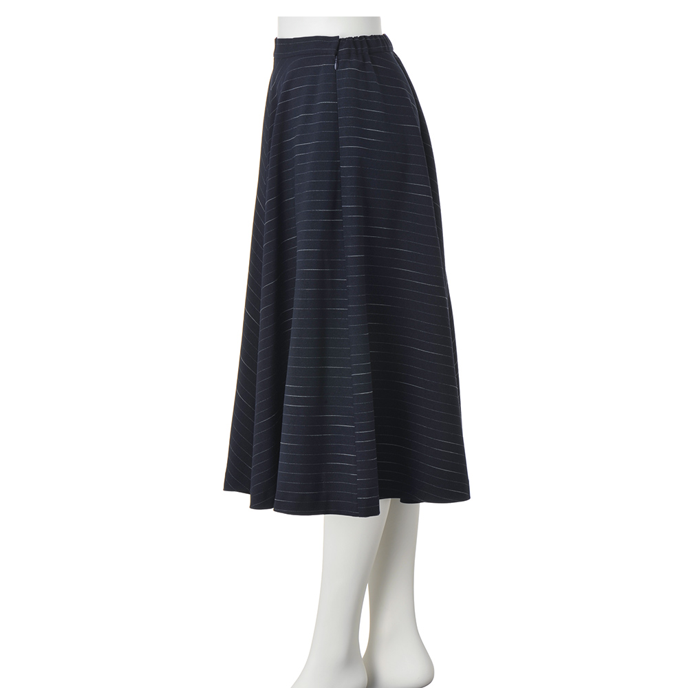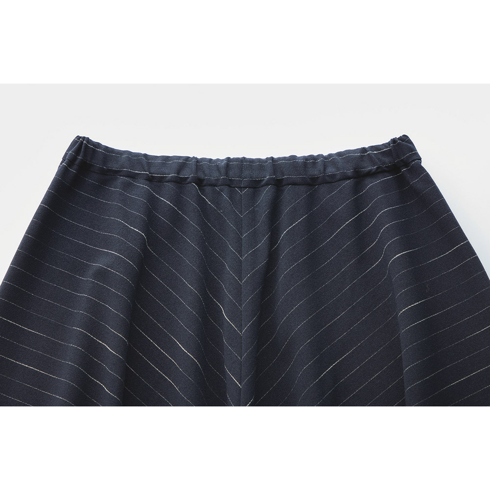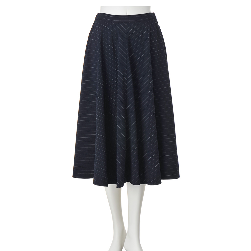 洗練されたシルエットでシックなムードと女性らしさを兼備ピンストライプ柄のスカートは、分量感のあるフレア、ニュアンスのある柄の出方がシャープな雰囲気を和らげ女性らしく。中央に向けて柄をバイアス使いにし、上品なフレアラインを演出。オンオフ問わず楽しめます。