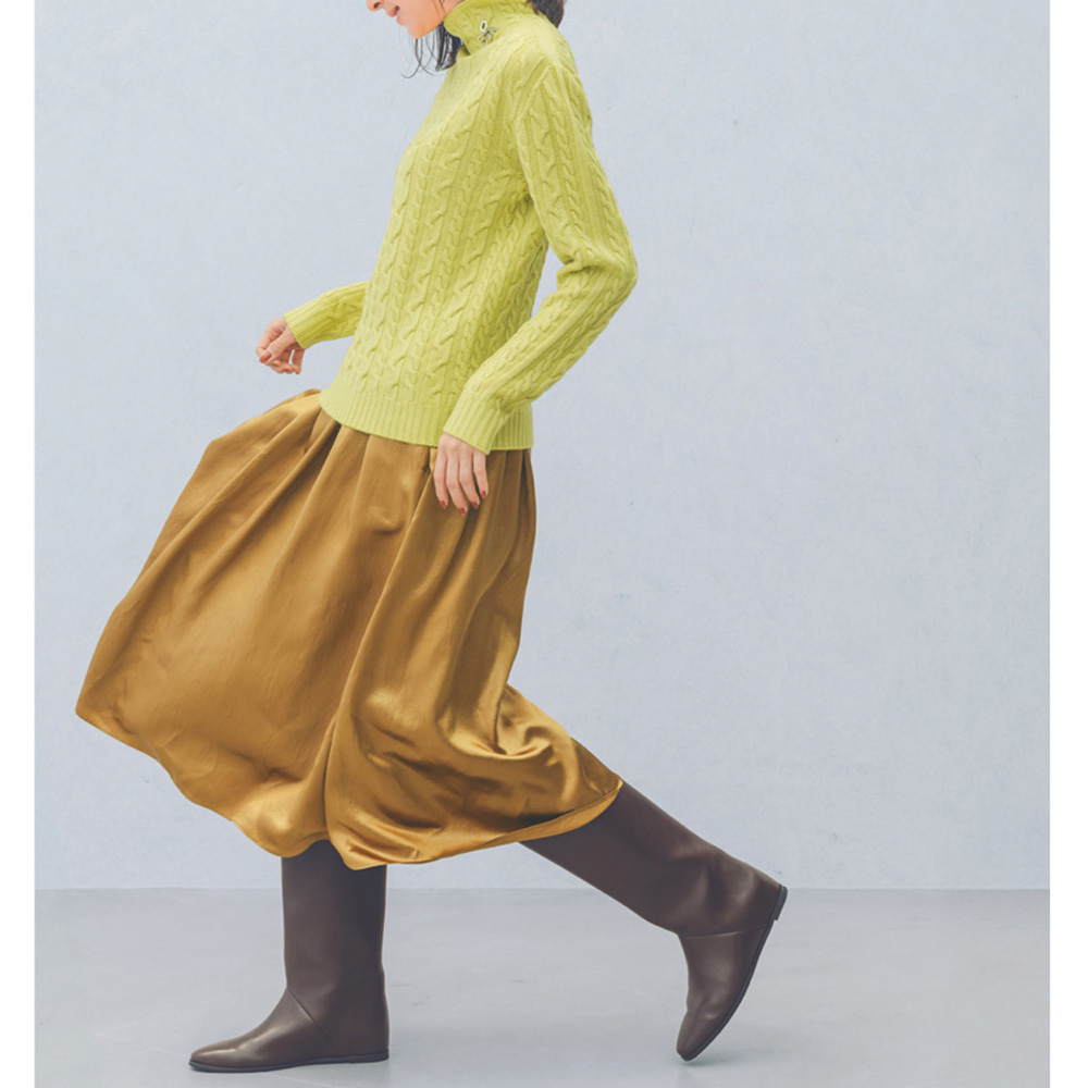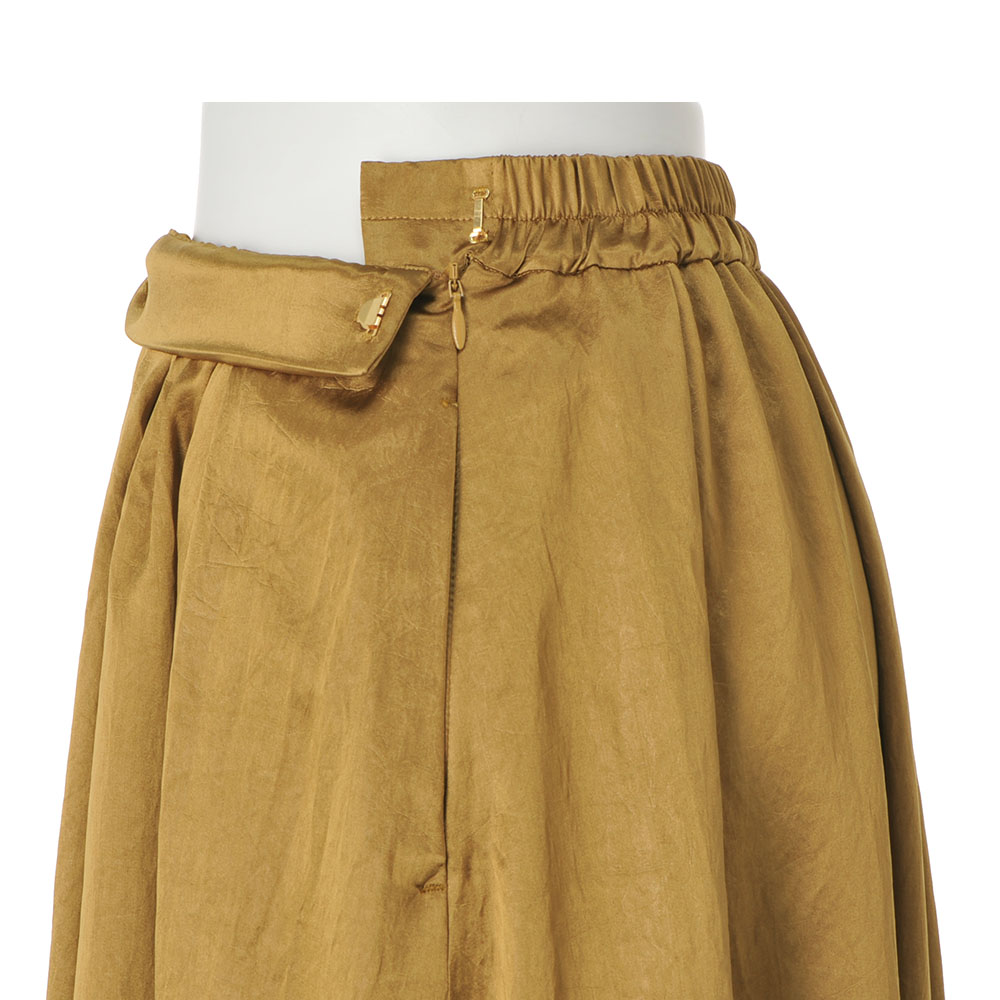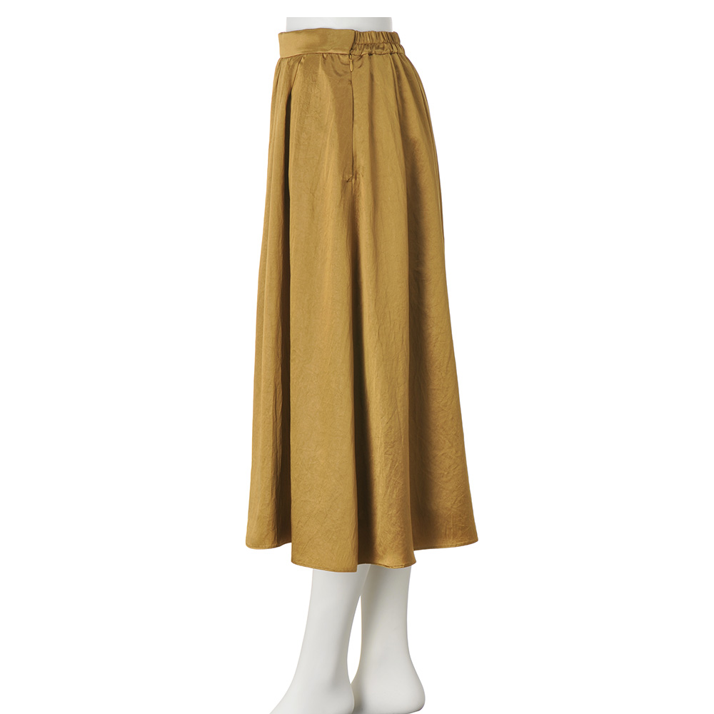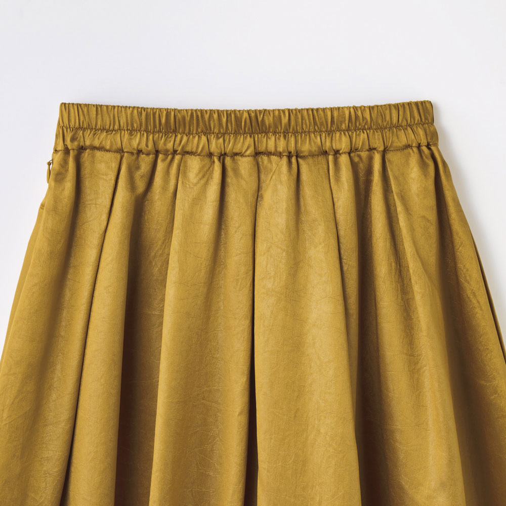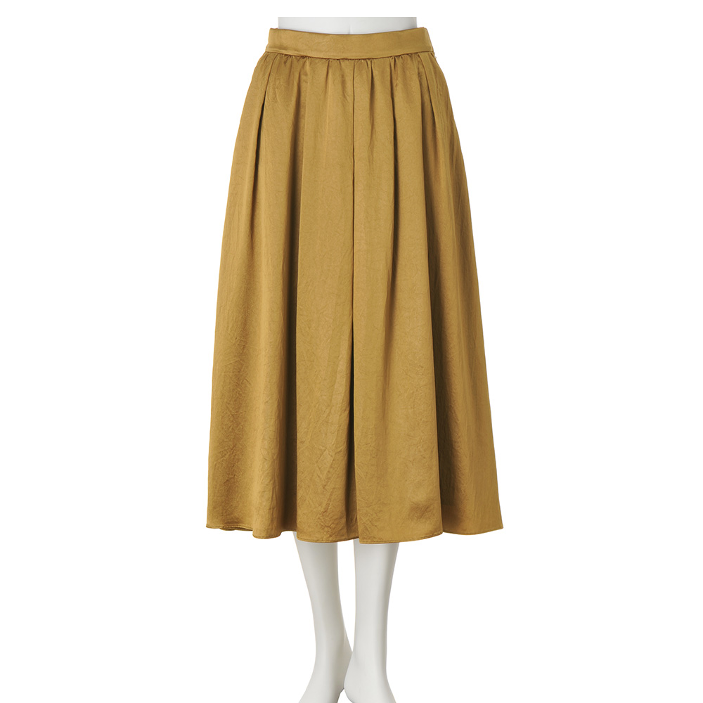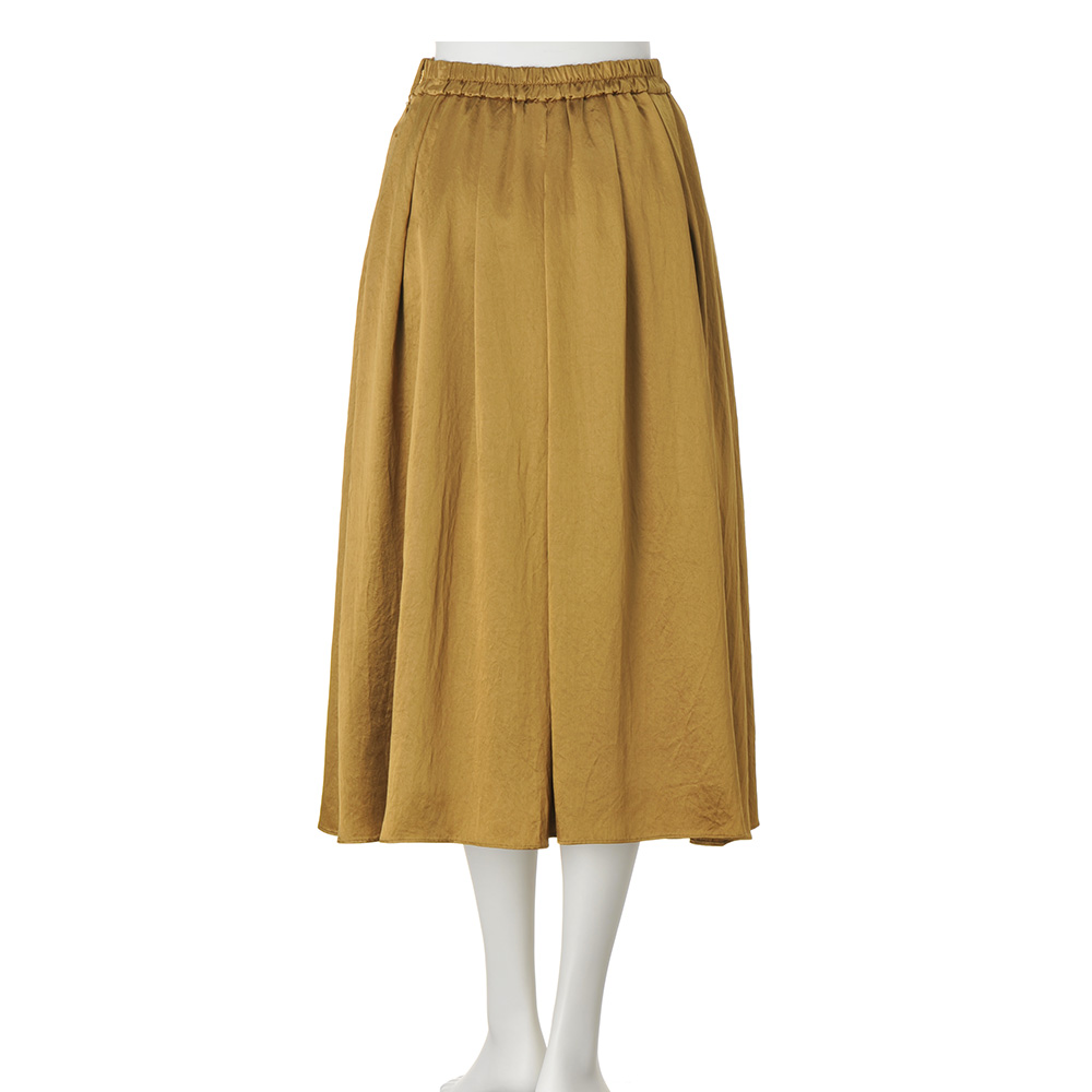 纏うだけで自信が持てる 私を輝かせる毎日服上品な艶が魅力のアセテートサテン生地を使用した、ドラマティックなスカート。シワ加工をほどこし、奥行きのある表面感を楽しめます。ギャザーとタックをたっぷり入れた、ふんわり広がるエレガントなフォルムが美しく、動くたびに揺れて印象的です。POINT後ろウエストはゴム仕様で、楽な着心地なのも嬉しい。適度なシャリ感と軽やかな風合い、美しい発色が魅力。