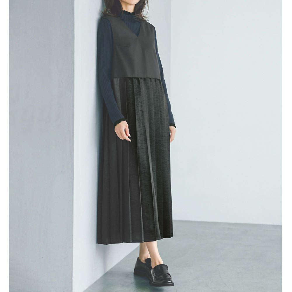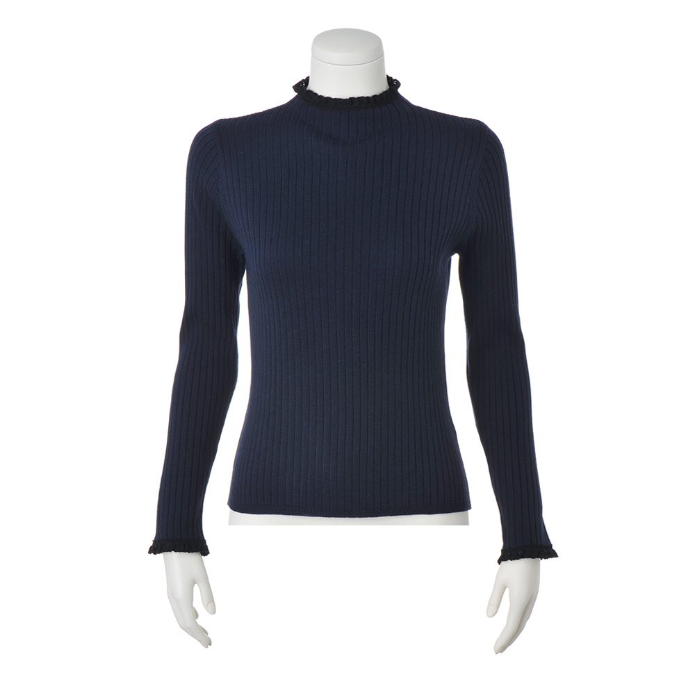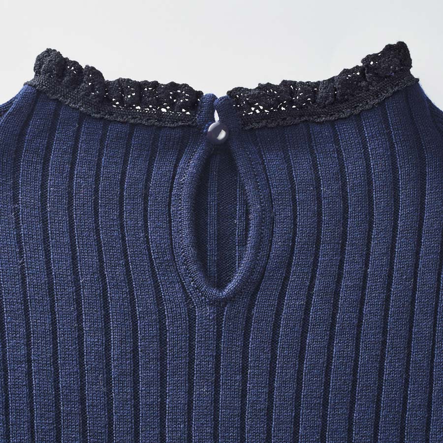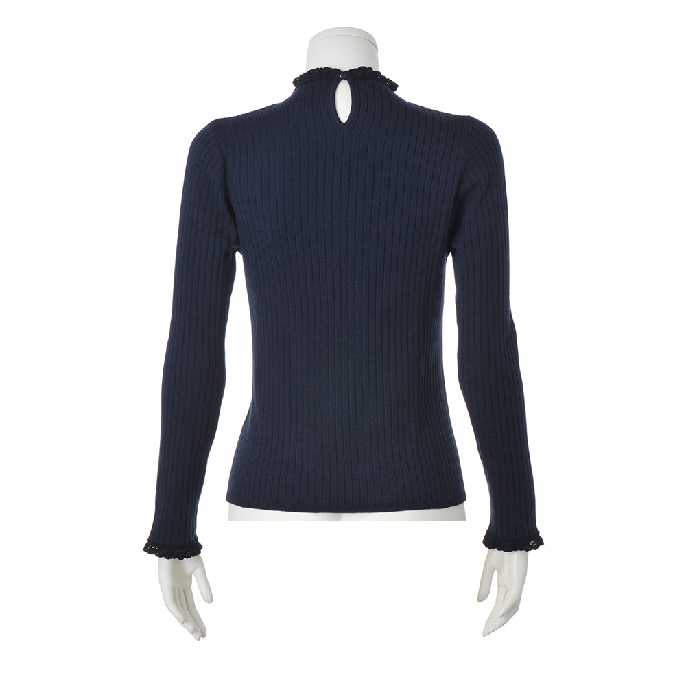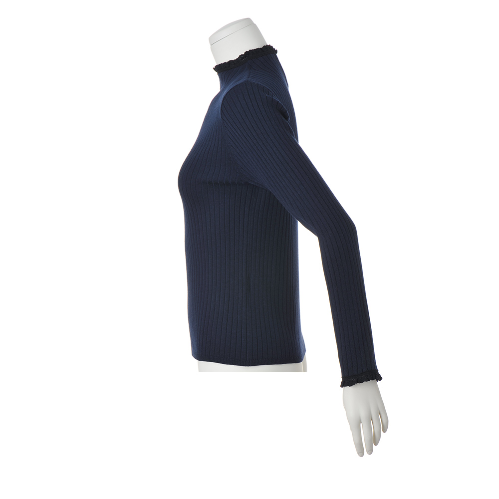 奥行きを生む配色レースがさりげないアクセントにネイビーのボトルネックニットの襟端と袖口に繊細なブラックのレースを配色であしらった、クラシカルなデザイン。ボディはワイドリブで、からだのラインを拾いにくいのが嬉しいポイントです。さらりとした風合いでロングシーズン重宝します。家庭での手洗いが可能。
