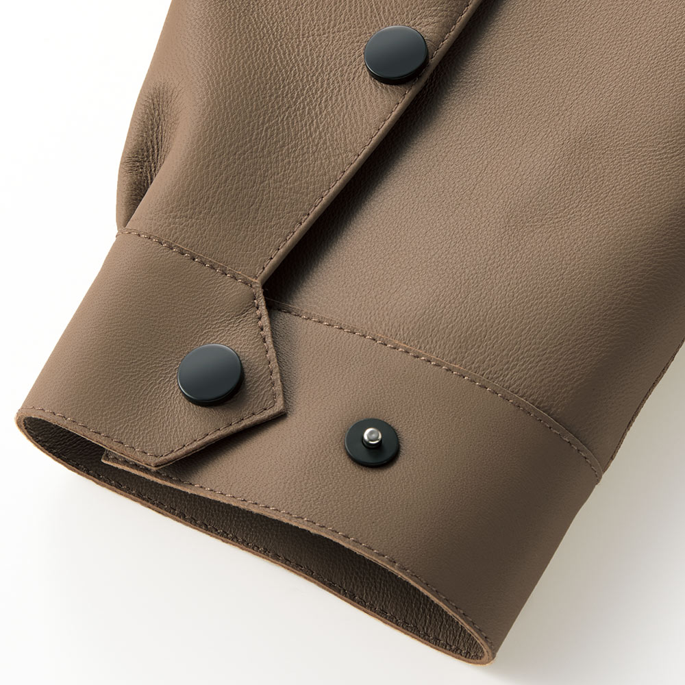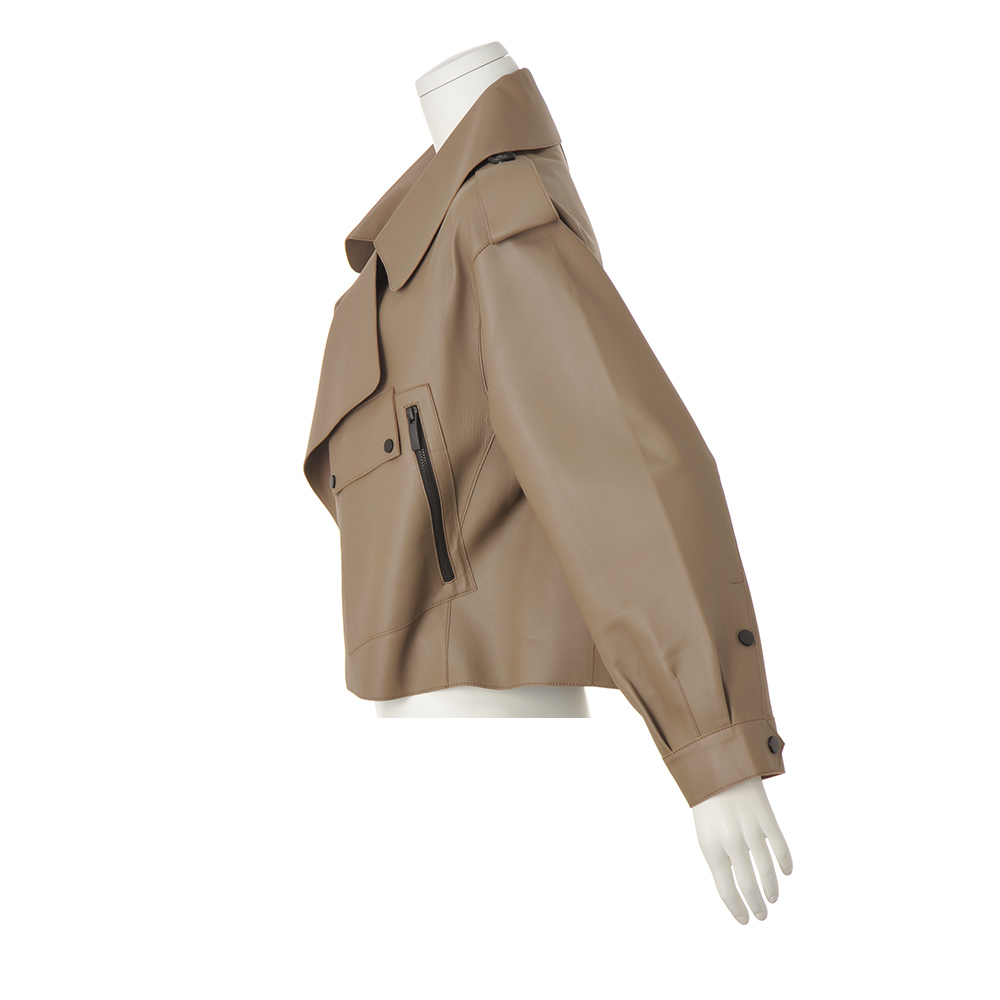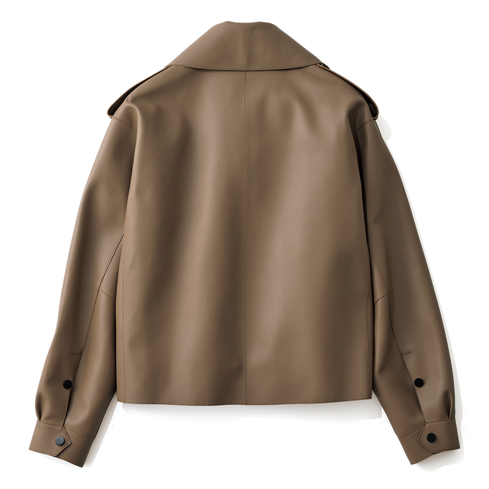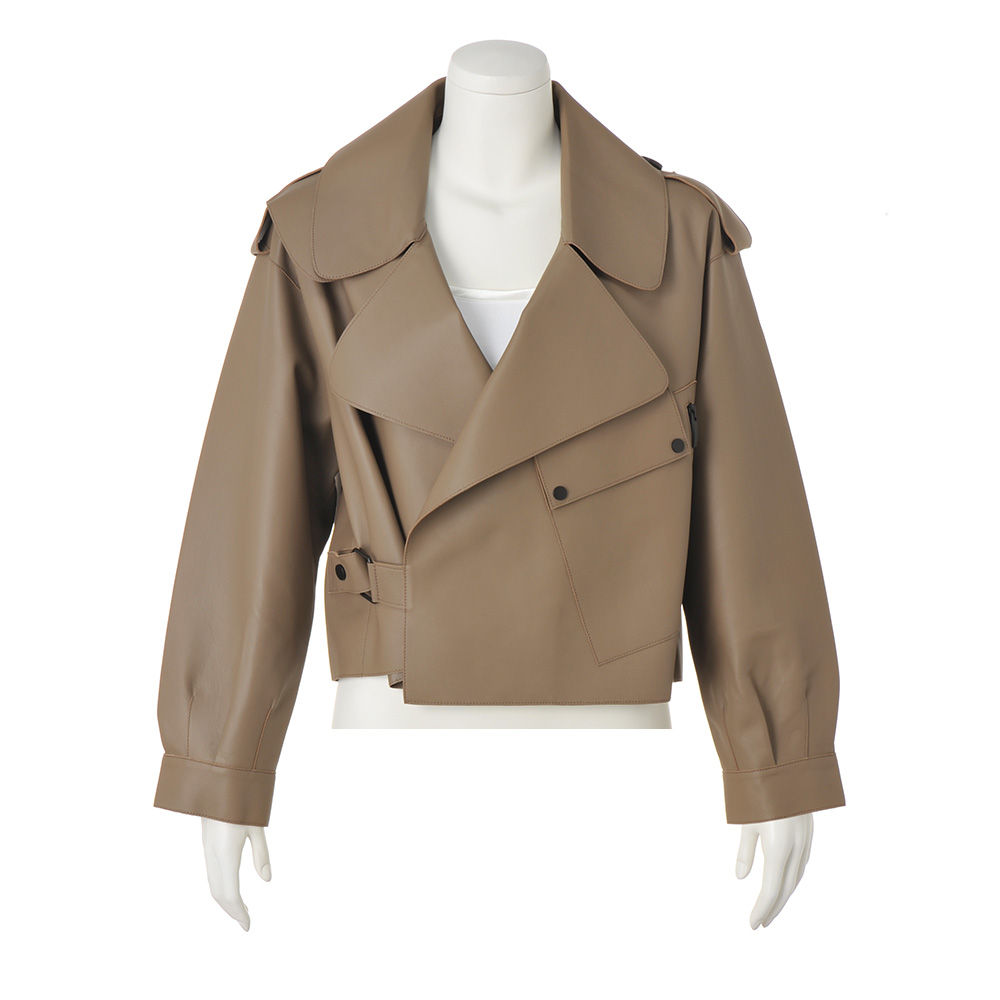 ラフに着られるレザージャケットは、問答無用の格好良さ。季節の狭間、定番のトレンチやライダースの代わりになる鮮度の高いアウターを求めて、遊び心のあるレザージャケットを作りました。デザインの基調はショートトレンチですが、ゆったりフォルムに大きな襟と肩章、左前身頃の斜めポケット、右脇で留めるタブベルトなど、個性的なディテールで程良くモード。タックとダーツでふんわりさせた袖で女性らしさも添えました。素材は厳選したイタリアンラムスキンを両面加工した、艶やかな光沢、ふっくらとした厚みのダブルフェイス。一枚仕立ての端はカットオフ仕様で、すっきり軽やかな着心地に仕立てました。POINT左前身頃のポケットはスナップボタン付きのフラップとファスナーで開閉できる凝ったデザイン。斜めに配されているのもポイントです。金具は大人のクールな表情をアピールするマットブラック。袖口のカフスはスナップボタンを2個配したアジャストタイプ。スクエアカンを右脇のタブに通して留める仕様。あえて前をきちんと閉じないラフな雰囲気が今っぽい。