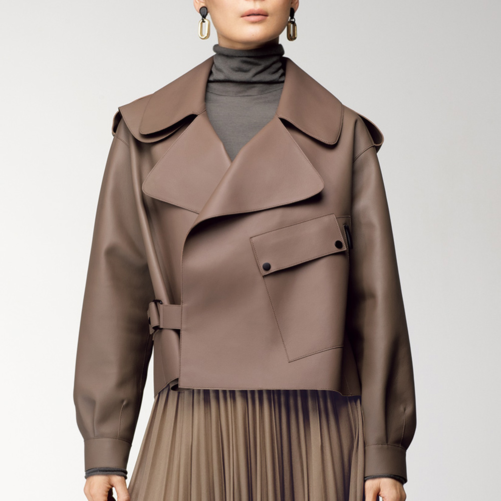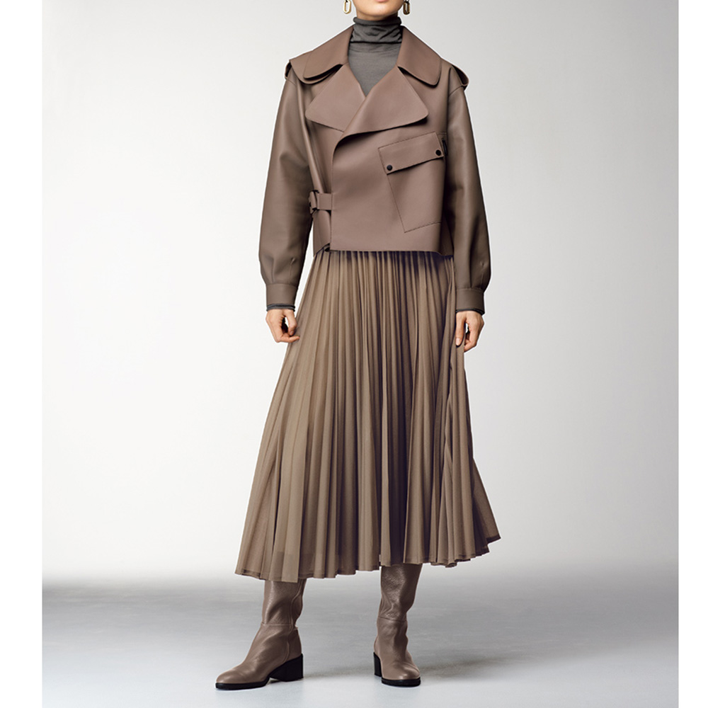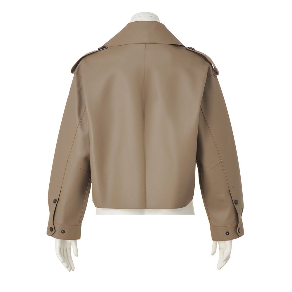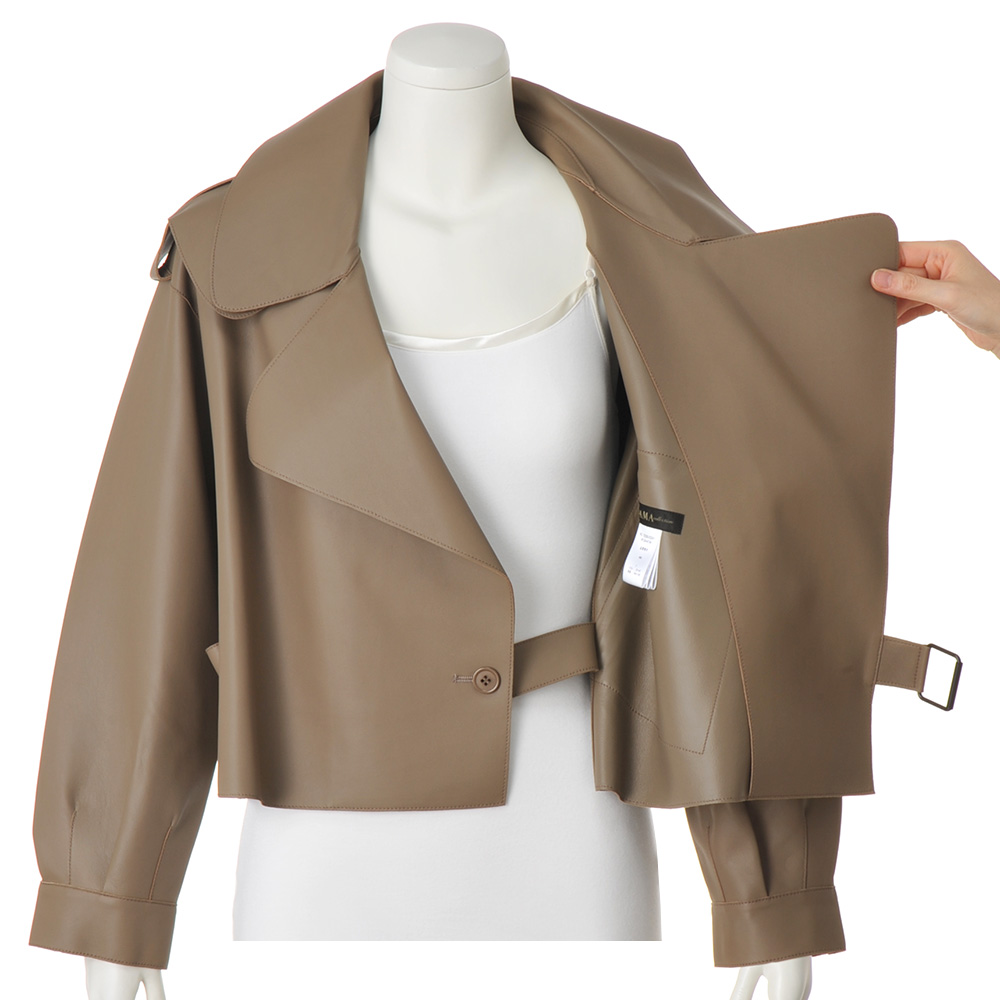 ラフに着られるレザージャケットは、問答無用の格好良さ。季節の狭間、定番のトレンチやライダースの代わりになる鮮度の高いアウターを求めて、遊び心のあるレザージャケットを作りました。デザインの基調はショートトレンチですが、ゆったりフォルムに大きな襟と肩章、左前身頃の斜めポケット、右脇で留めるタブベルトなど、個性的なディテールで程良くモード。タックとダーツでふんわりさせた袖で女性らしさも添えました。素材は厳選したイタリアンラムスキンを両面加工した、艶やかな光沢、ふっくらとした厚みのダブルフェイス。一枚仕立ての端はカットオフ仕様で、すっきり軽やかな着心地に仕立てました。POINT左前身頃のポケットはスナップボタン付きのフラップとファスナーで開閉できる凝ったデザイン。斜めに配されているのもポイントです。金具は大人のクールな表情をアピールするマットブラック。袖口のカフスはスナップボタンを2個配したアジャストタイプ。スクエアカンを右脇のタブに通して留める仕様。あえて前をきちんと閉じないラフな雰囲気が今っぽい。