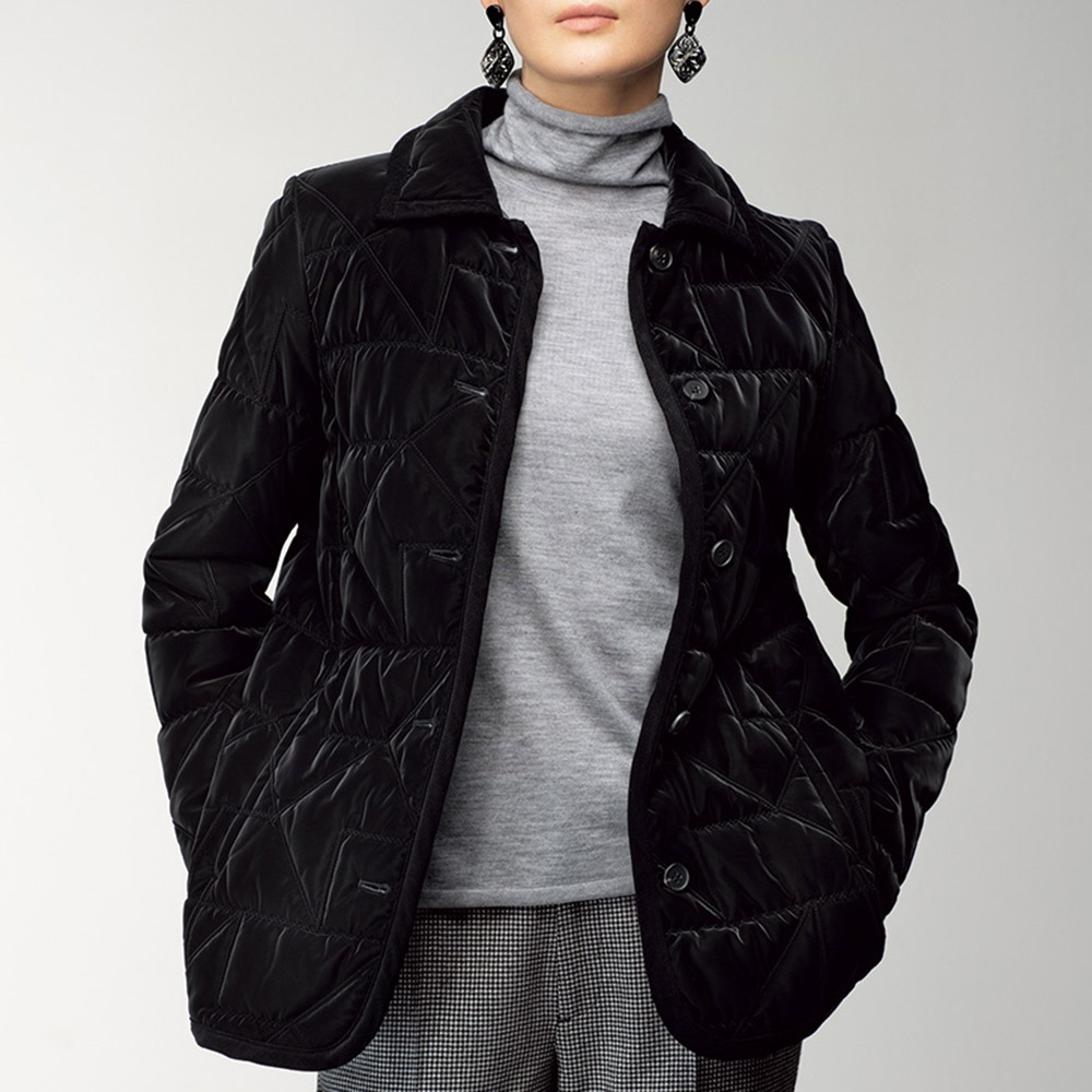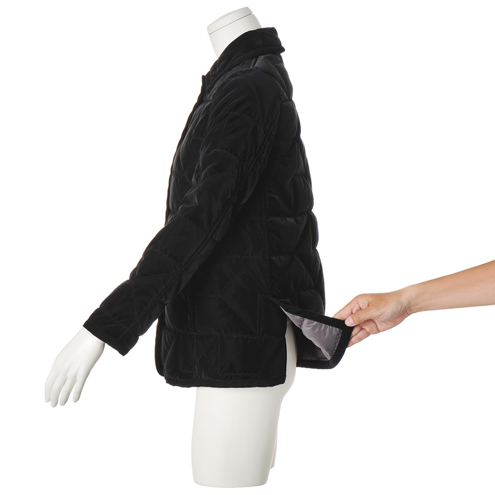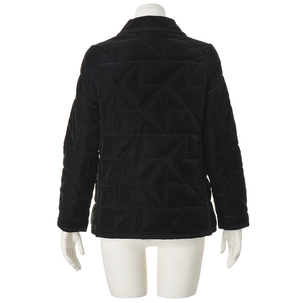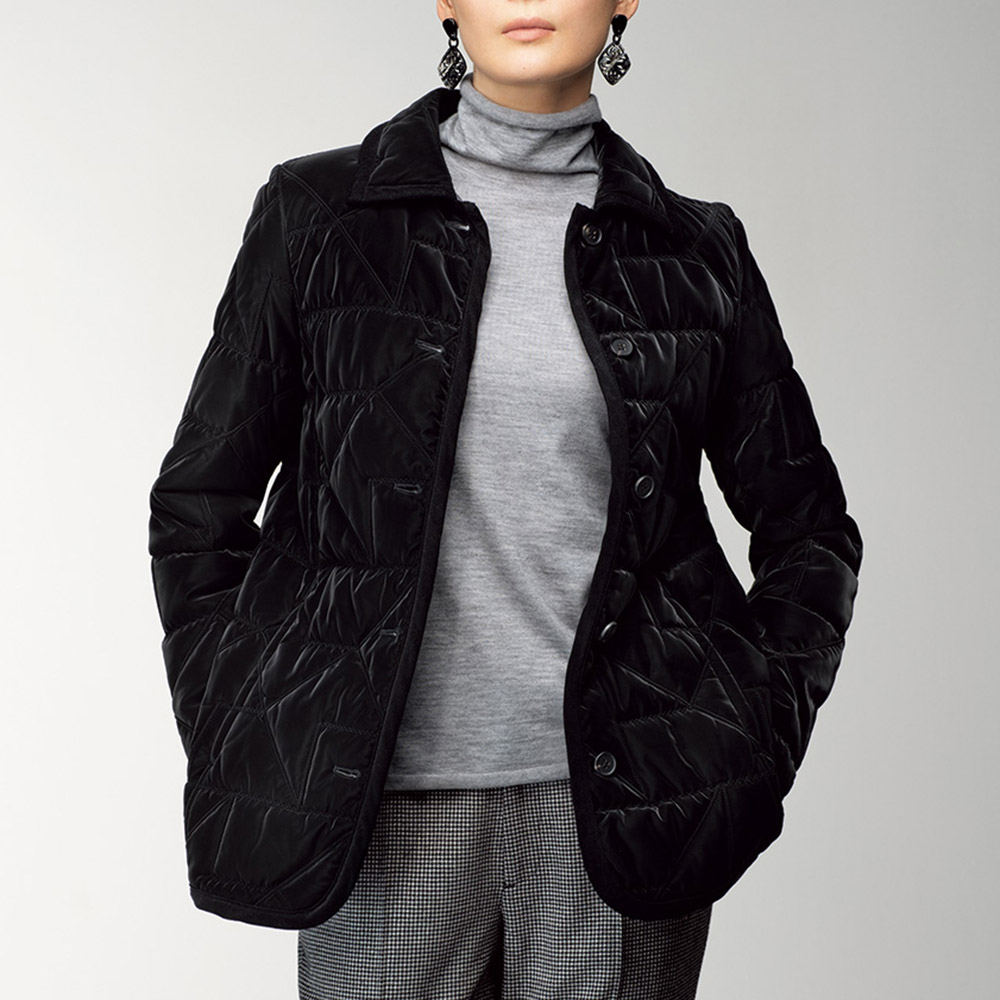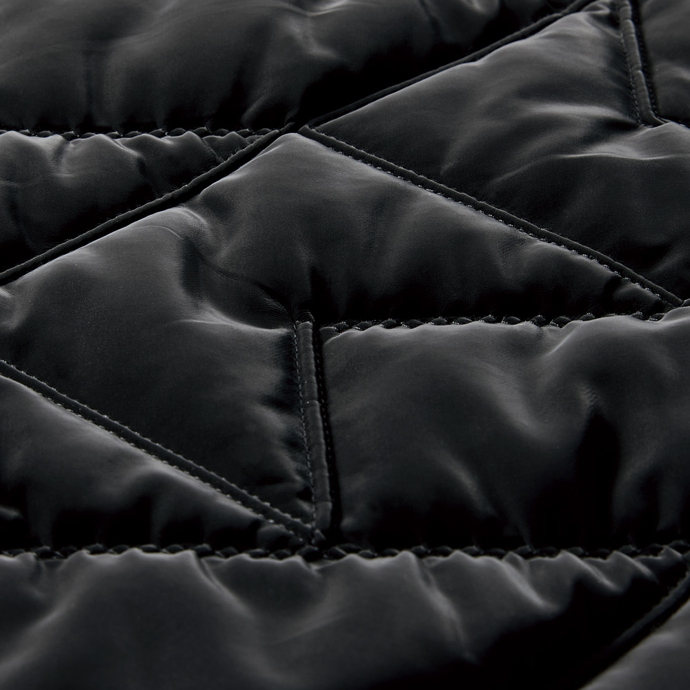 カジュアルなジャケットを大人目線で取り入れて。ご好評いただいたキルティングジャケットが、生地をツイードから合皮素材に変えて登場です。光沢感があり滑らかでパウダータッチな表情に、軽量の中わたを挟んで幾何学柄キルトステッチを掛けた、シンプル・モダンなマテリアルです。襟はステンカラー、身頃はパネルラインで切り替えて立体的に。フォルムや柄を崩さない切り替え線利用のポケット、端をコーデュロイでパイピングした丁寧な作りも踏襲しました。裏側はグレーの配色使いで重くならないようにしました。POINT後ろ裾にはサイドベントを入れて動きやすく。黒のコーデュロイでパイピングされているのも、さりげないアクセントです。
