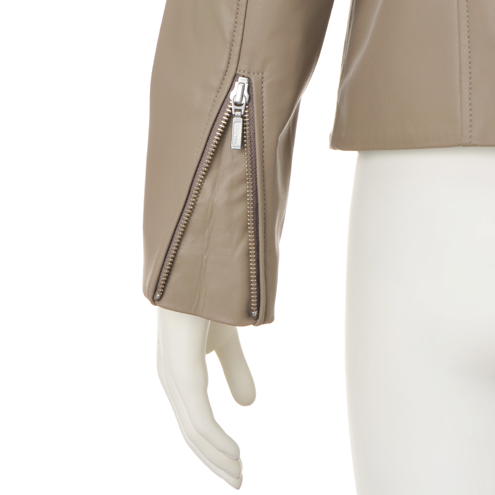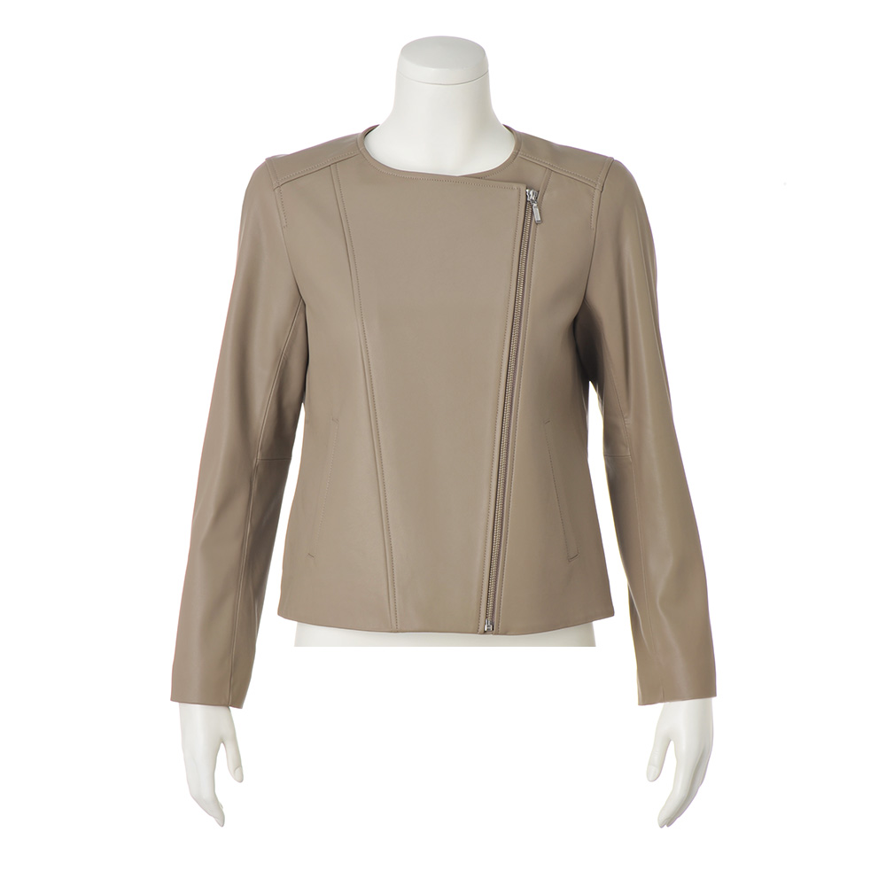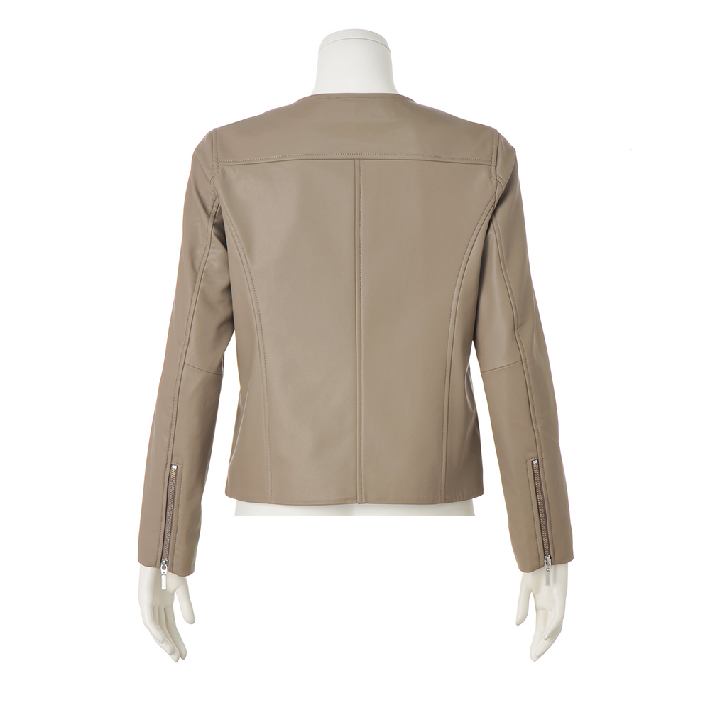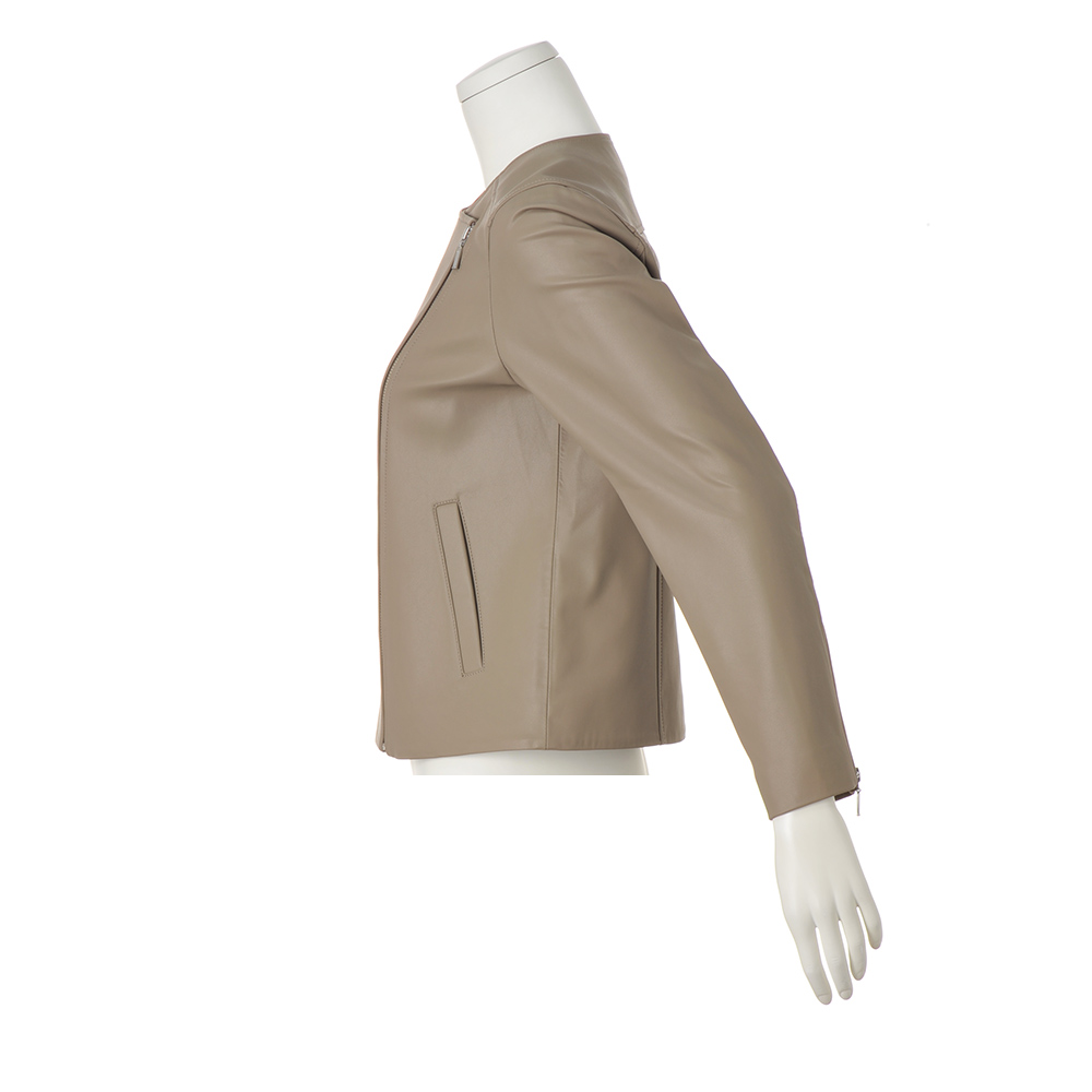 本格的なライダースを女性らしく昇華したデザインラムレザー表面に薄くボンディング加工をほどこし、レザーの柔らかな質感はそのままに、均一で美しい表面感を実現した素材で仕立てたジャケット。パターンや切り替えにこだわった本格的なライダースデザインながら、シンプルなノーカラー&優しげなモカベージュの色味にすることでエレガントにも着られる一着に。