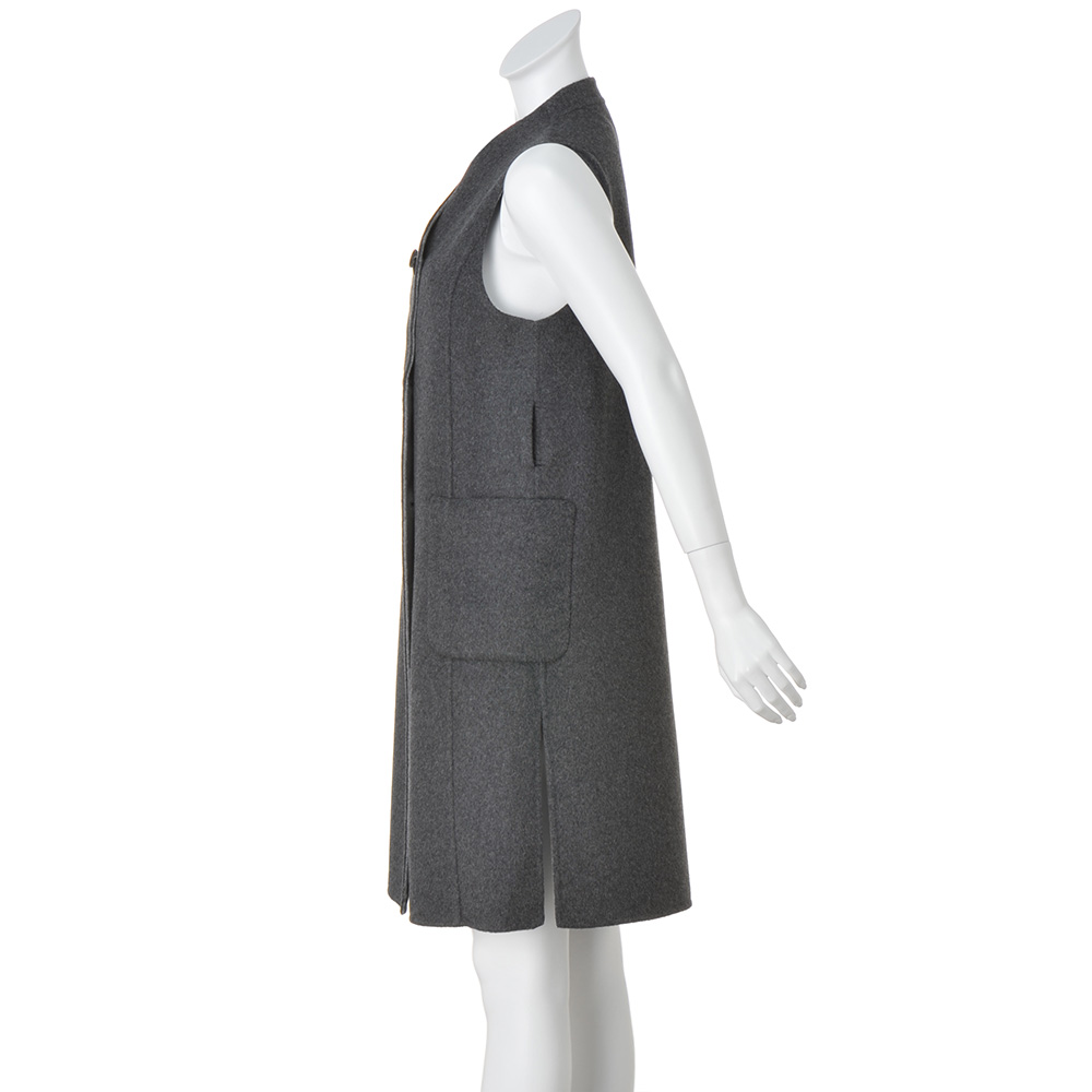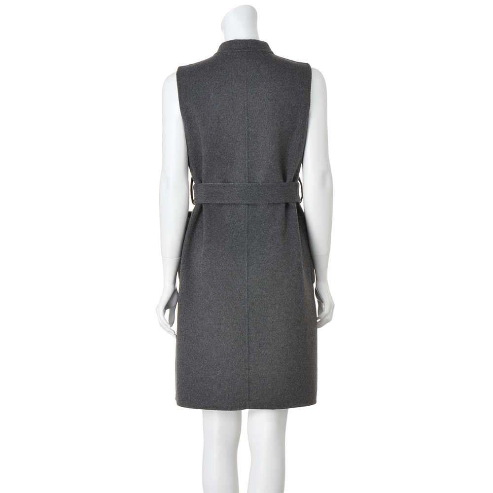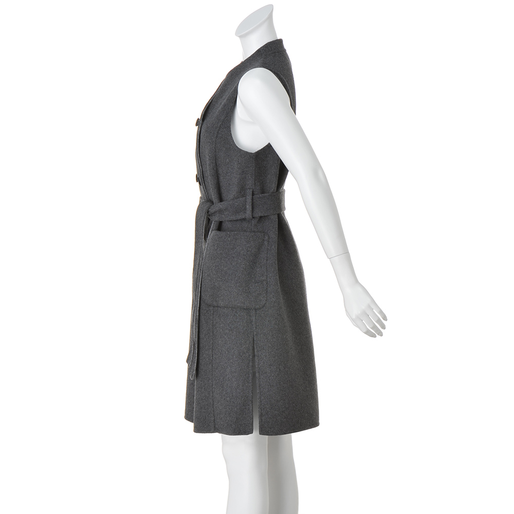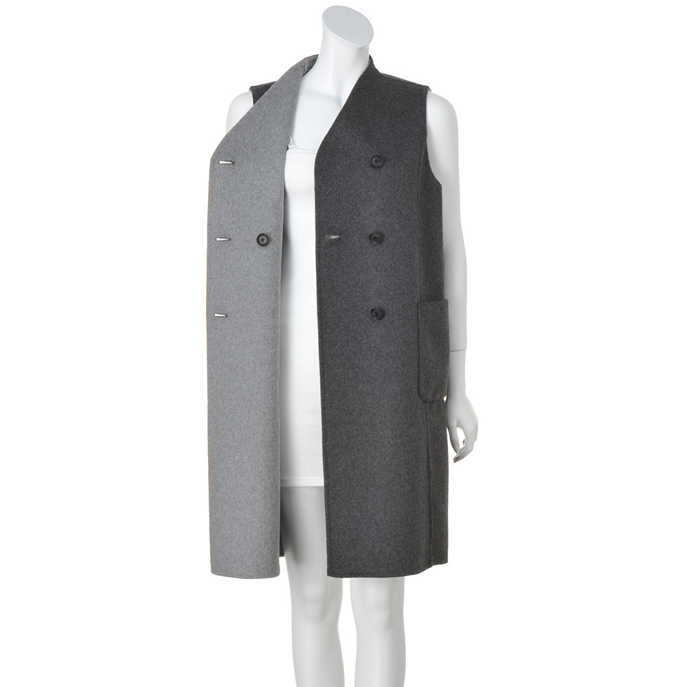 チャコールとライトグレーの2枚の生地を丁寧な手作業で一重仕立てにした、ダブルフェイス素材を使用。生地の裏と裏を縫い合わせるため、両面外側は表地となり肌に触れる部分は触り心地がよいのが特徴です。ウール高混率ならではのしなやかさも魅力。両面でボタン位置を変え、異なるムードのリバーシブル仕様に。ベルトもダブルフェイスで着こなしのアクセントに。Iラインを強調するシルエットがスタイルよく見せてくれます。長め丈ながら両サイドスリット入りで足さばきも◎。同シリーズのスカート(商品番号:PC5935)とのセットアップとしても着られます。