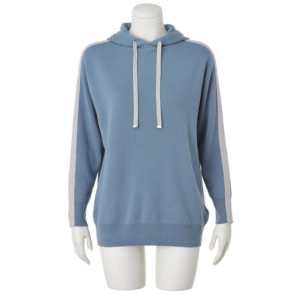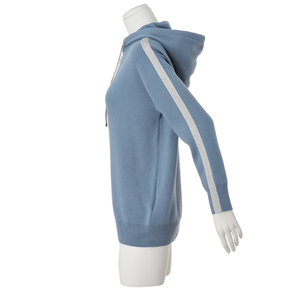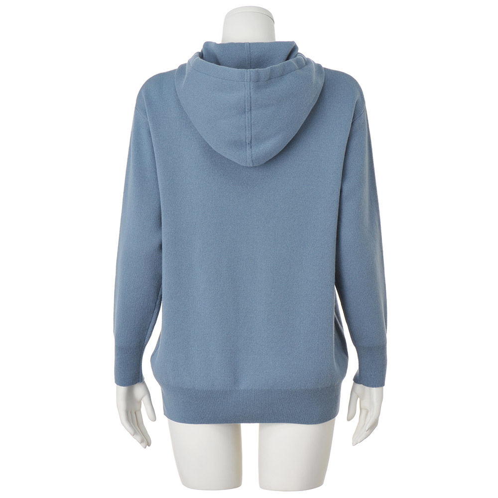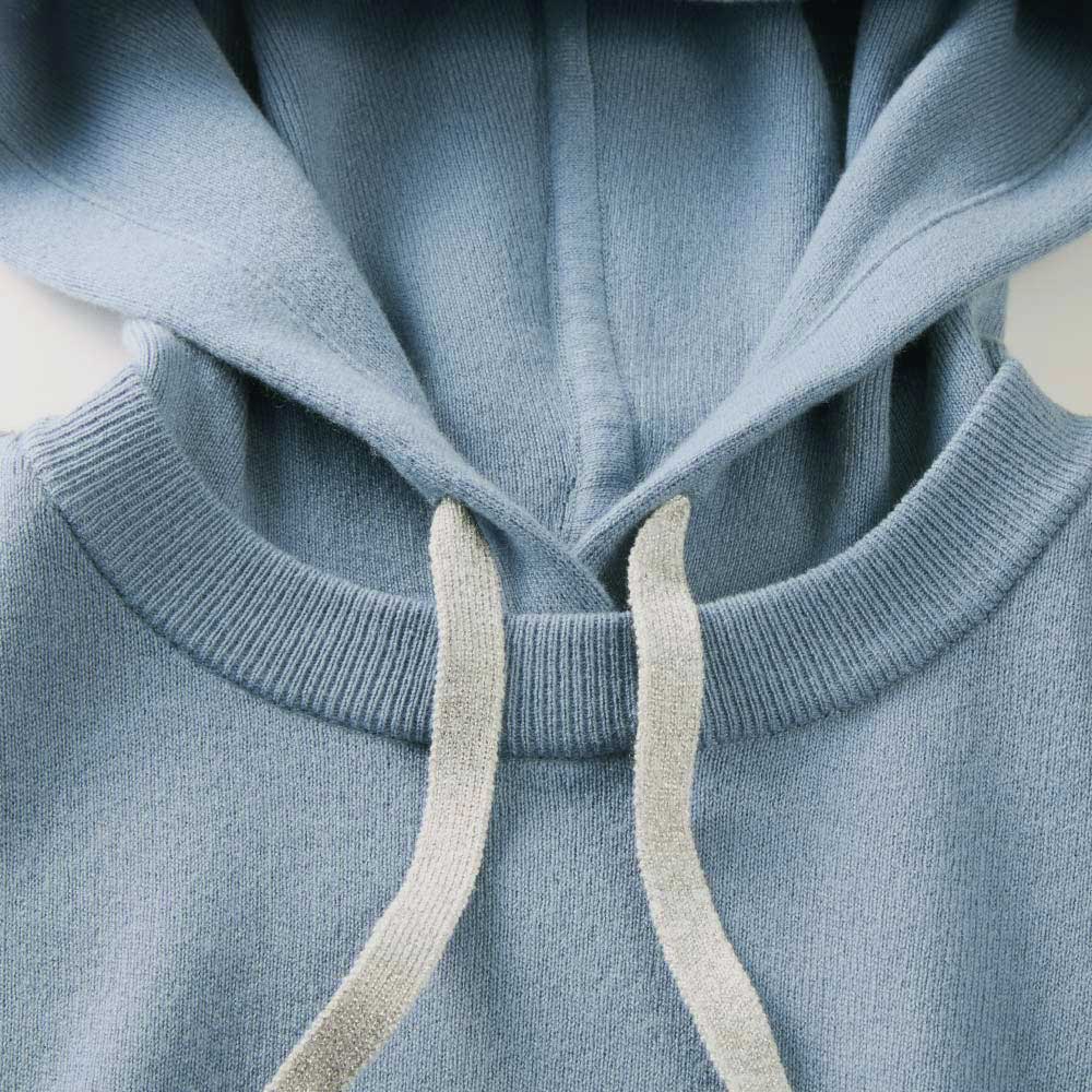 上質カシミヤで満喫するアクティブ&リュクス気ままな散歩に出かける日にも忘れたくないのが、快適さとファッション性の両立です。自信をもっておすすめするのが、イタリア「カリアッジ」社が開発した46番双糸のカシミヤを使用した、ニュアンスブルーのフーデッドプルオーバーです。両面とも表に見えるスムース編みを採用し、程良い厚みと伸縮性の両立、型崩れしにくさを実現させました。遊び心が光る重ね着風フーデッドデザイン。ライン状に配したシルバーラメ入りのカシミヤ配色テープと、フードに通したお揃いのコードがリッチ感の決め手です。同シリーズのパンツ(商品番号:PC5963)とお揃いの配色テープが上下で着た時のすっきり感を後押しするだけでなく、一枚でも着こなしが決まるポイントです。