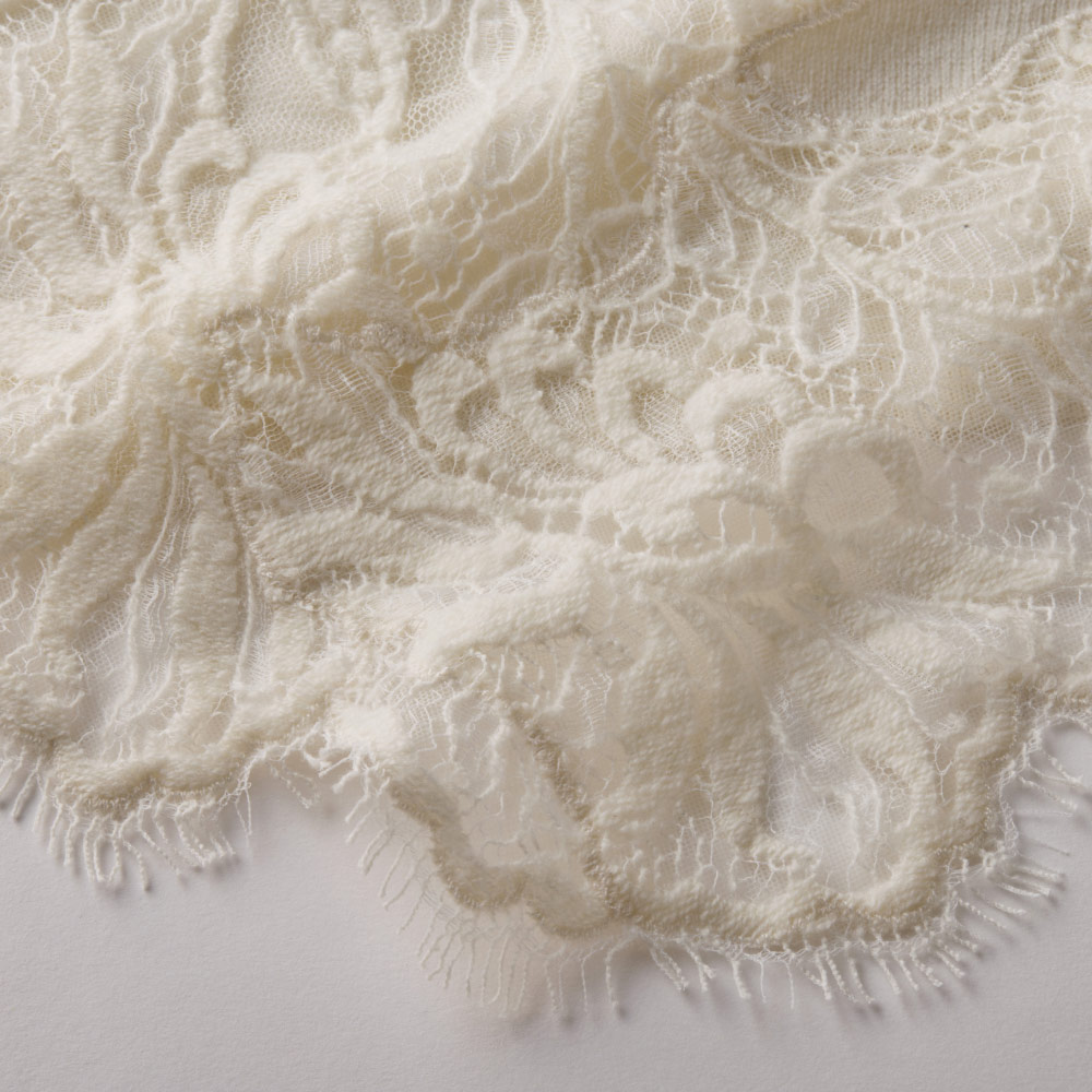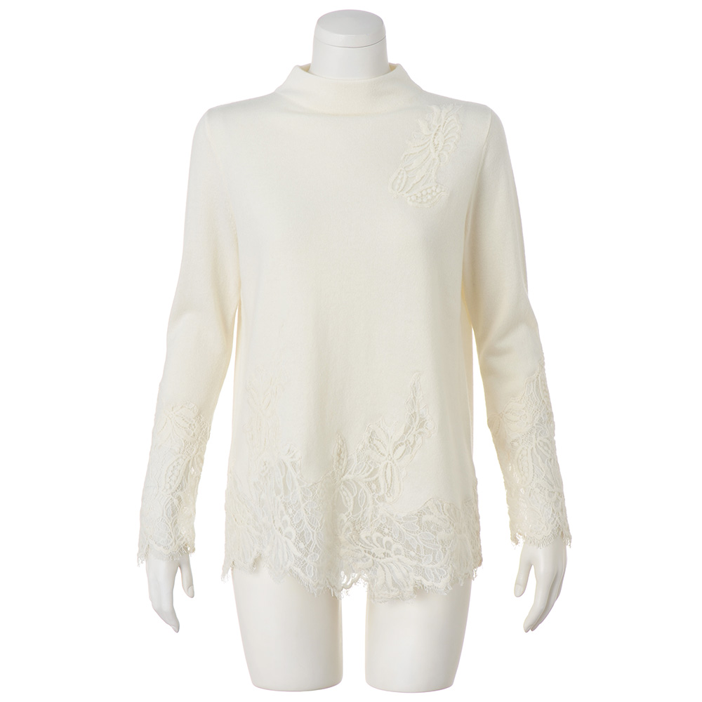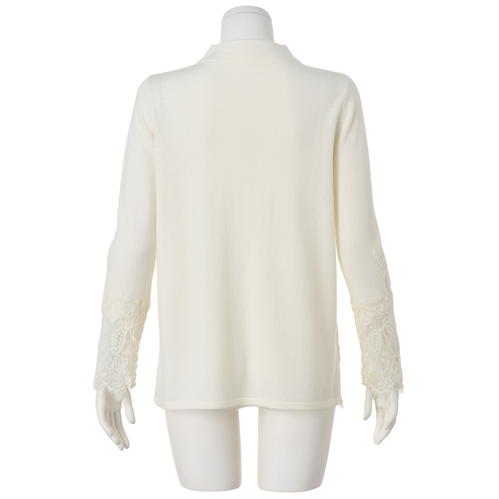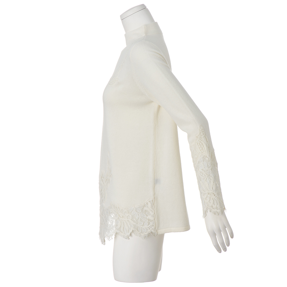 上質な週末時間を彩る心地よさと美しさの両立エレガンスを習慣にした大人の週末にふさわしい一着を…。その思いを叶えるのが、フランス「ソフィ・アレット」社のレースを贅沢に使ったウールカシミヤの一着です。身頃続きのボトルネックとAラインのシルエットをベースとしたプルオーバーに、温かみのあるウール糸でエキゾチックな植物を表現したレースモチーフをカットアウトし、表情豊かにちりばめています。たとえば、イレギュラーに配した前身頃の裾、レース端のスカラップを活かした袖口は、部分的にニットを切り取り、チュールを裏打ちしてセンシュアルな透け感を演出。左胸にはレースモチーフを直接のせて程よい凹凸感を活かしてポイント使い。凝ったデザインもアイボリーのトーンonトーンだからどこまでも優しい雰囲気…。澄んだラグジュアリー感が香るリラックススタイルを楽しんでいただけます。