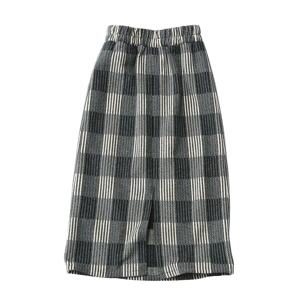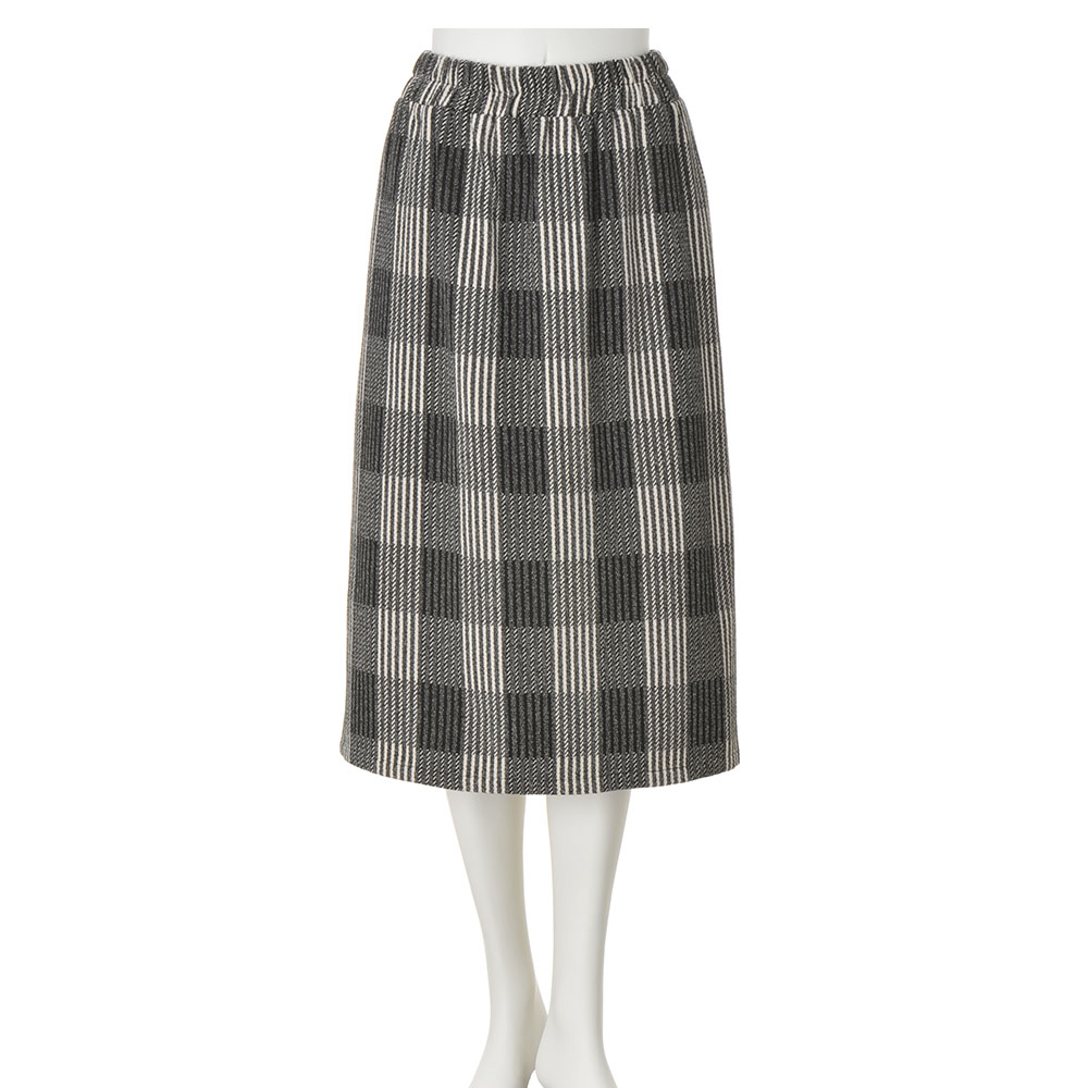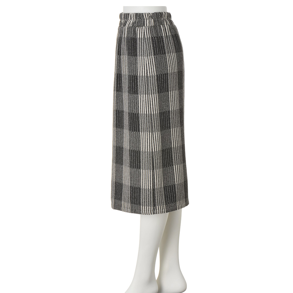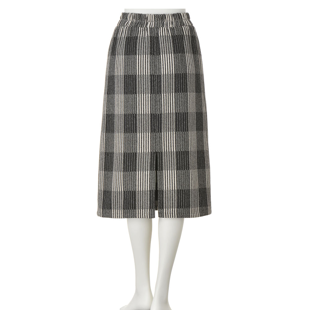 ジャカードで凹凸のある表面感に仕上げた、トレンド素材のブロックチェック柄が印象的。モノトーンベースで、合わせを選ばず着こなしのアクセントに。Iラインシルエットですっきり見えが叶い、後ろスリット入りで足さばきの良さも。ウエストは幅広の総ゴム仕様で安定感も◎。