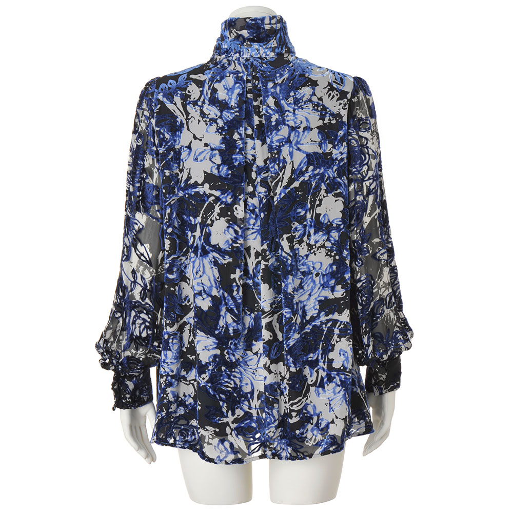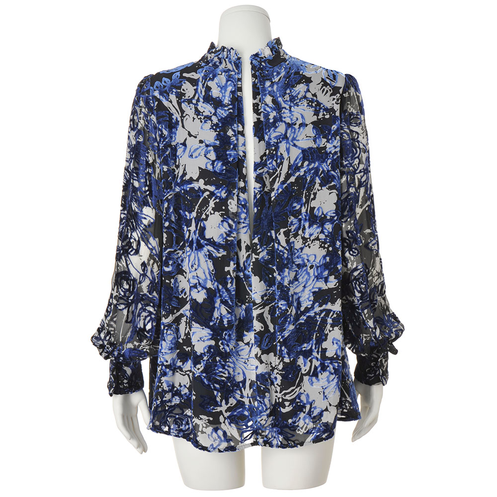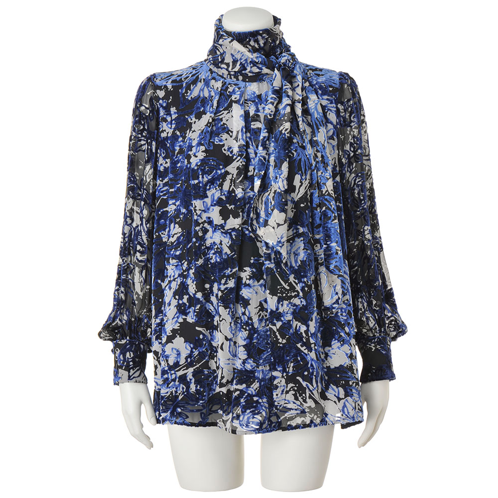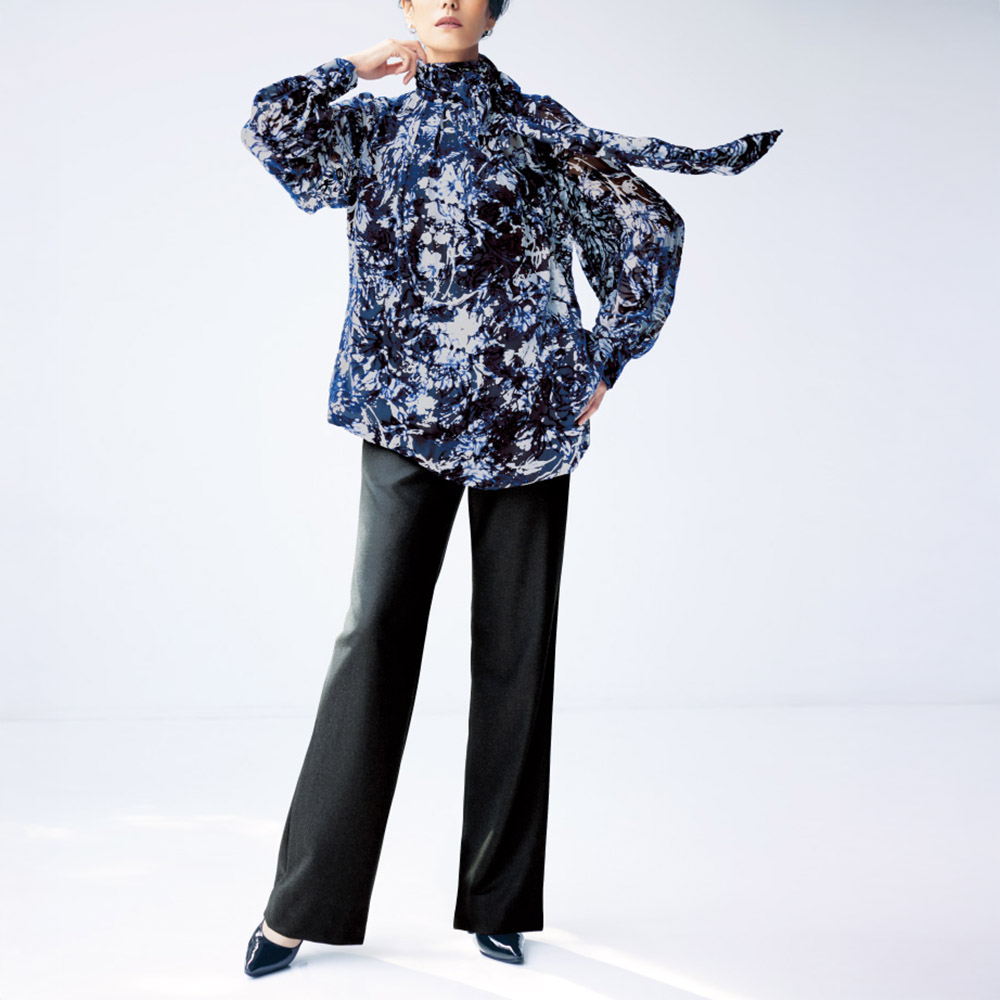 「一着」の存在感が、装いの完成度を高める高品質とラグジュアリー感を大切にするDAMAの視点が光るリアルクローズをご紹介しましょう。ブラウスのために選んだのは、イタリア「ビンダ」社のテキスタイル。ブルーのシルク混ベルベットにオパール加工で透け感のある花柄を表現し、さらに裏面から手捺染で白い花柄をプリント。シックトーンに浮かび上がるようなフラワーオンフラワーが格別な個性を放ちます。この麗しい生地を気負いなく着こなしていただけるように、身頃部分にだけ裏地を付けた着丈長めのブラウスを完成。透け感を活かしたいパフスリーブは生地を一枚仕立てに、バンドカラーの上部に配したフリルやたっぷりと長さをとったボウは二重仕立てにして程よいボリューム感を演出。高度な縫製技術でメリハリをつけたデザインが、着こなしの印象を高めます。Message from「 BINDA(ビンダ)」【Mr. Michele Binda 】「BINDA」President「ビンダ」社の矜持は、伝統的なスクリーンプリントの手捺染を大切に受け継いでいること。他にはない表現力にご注目ください。