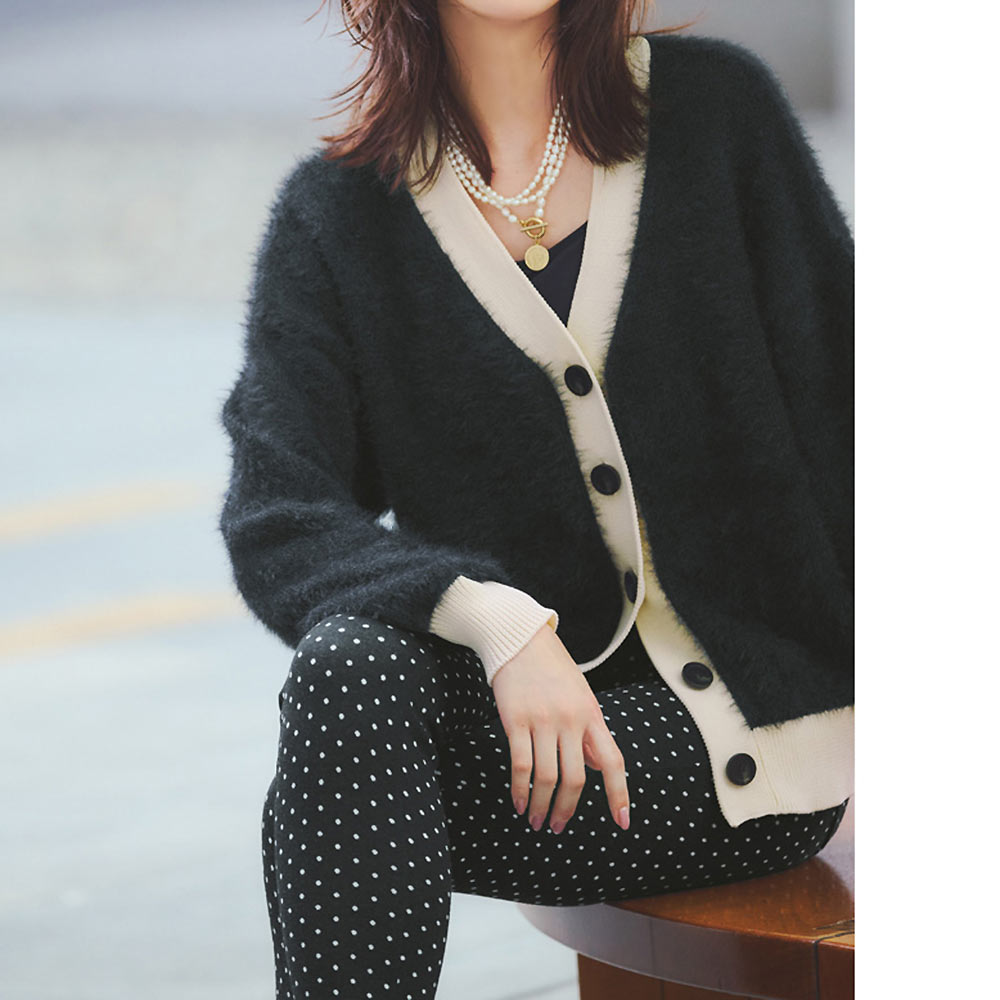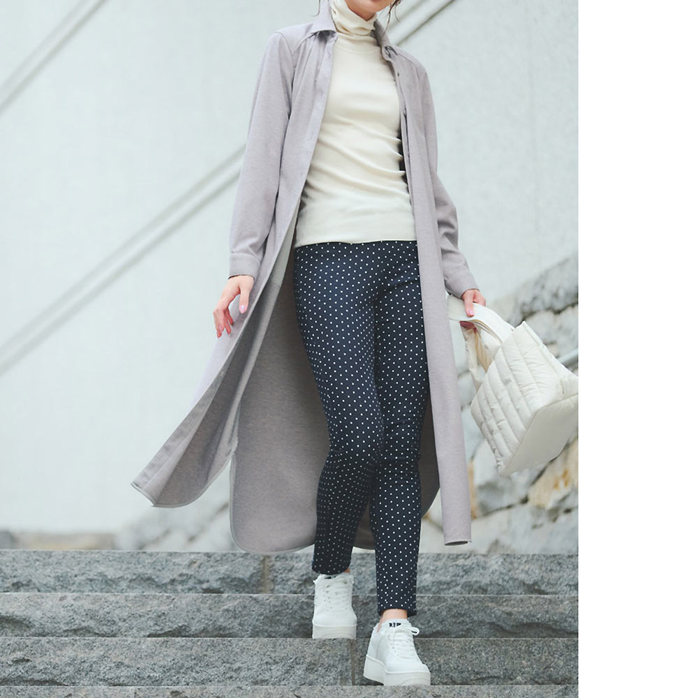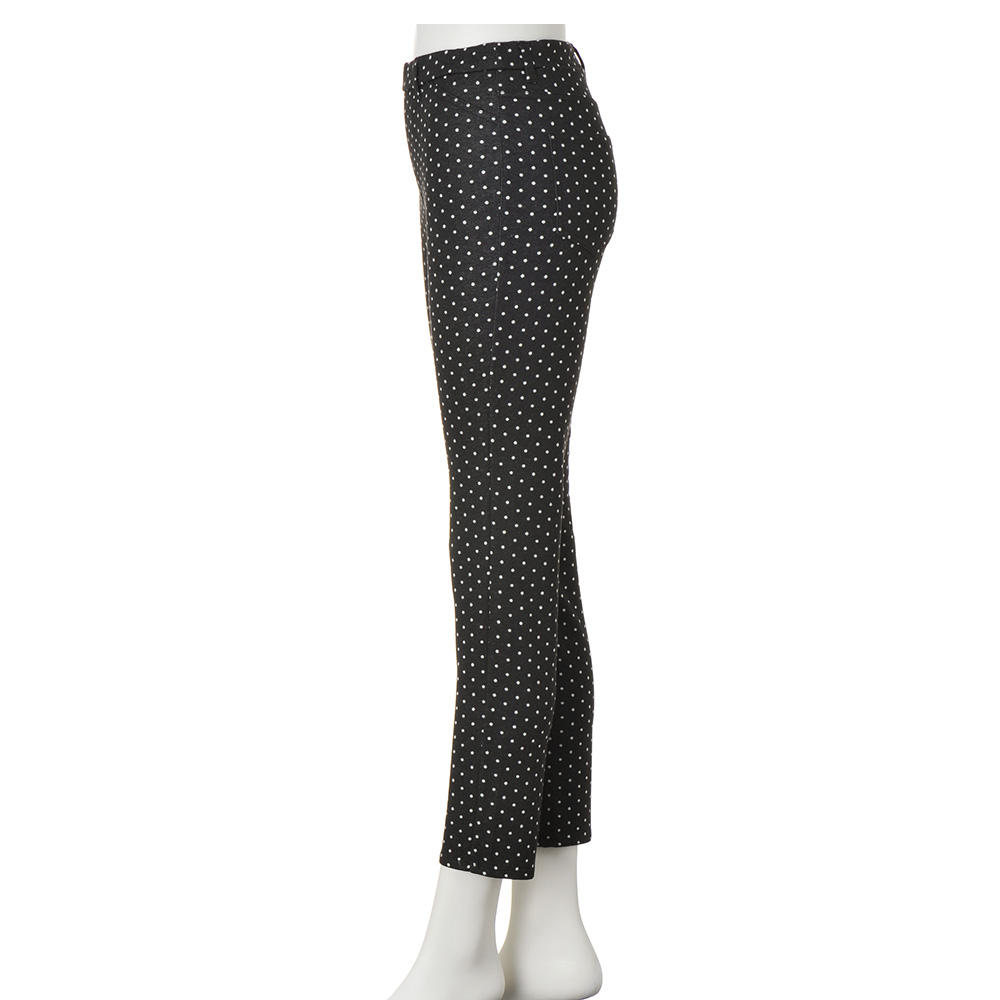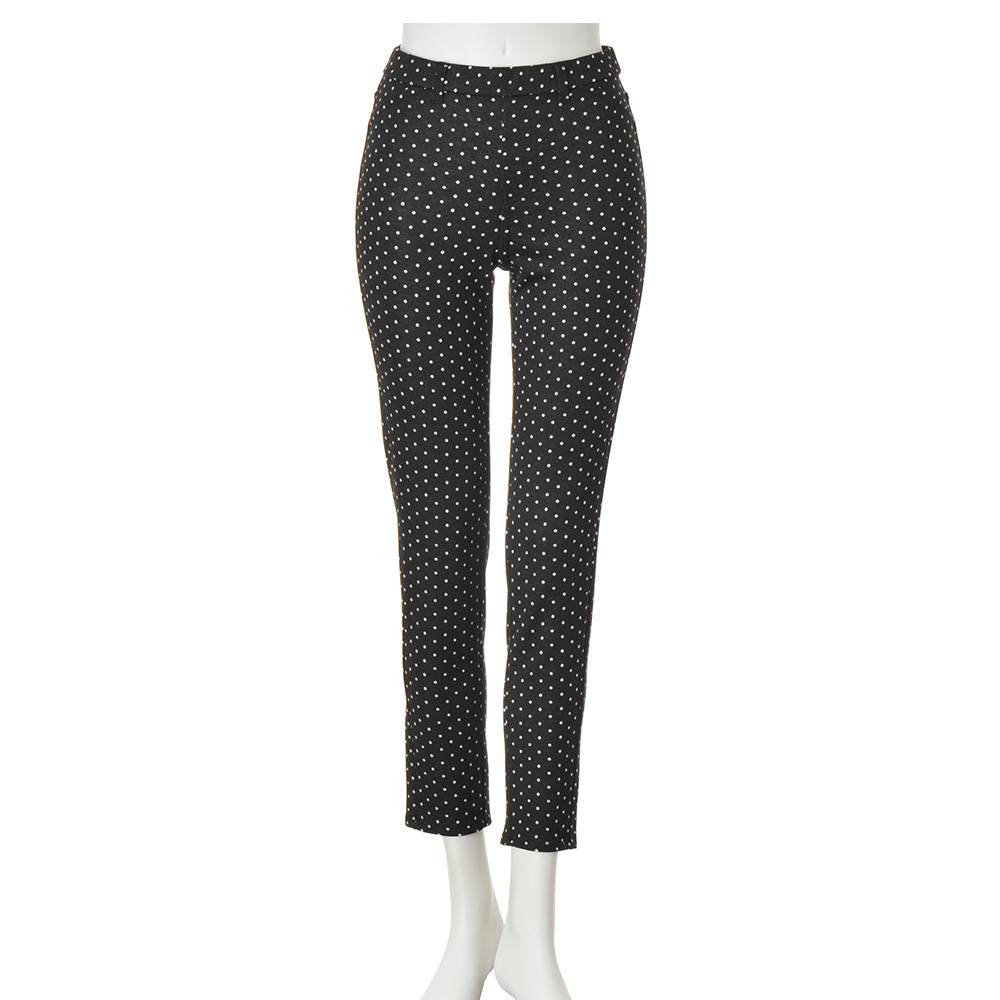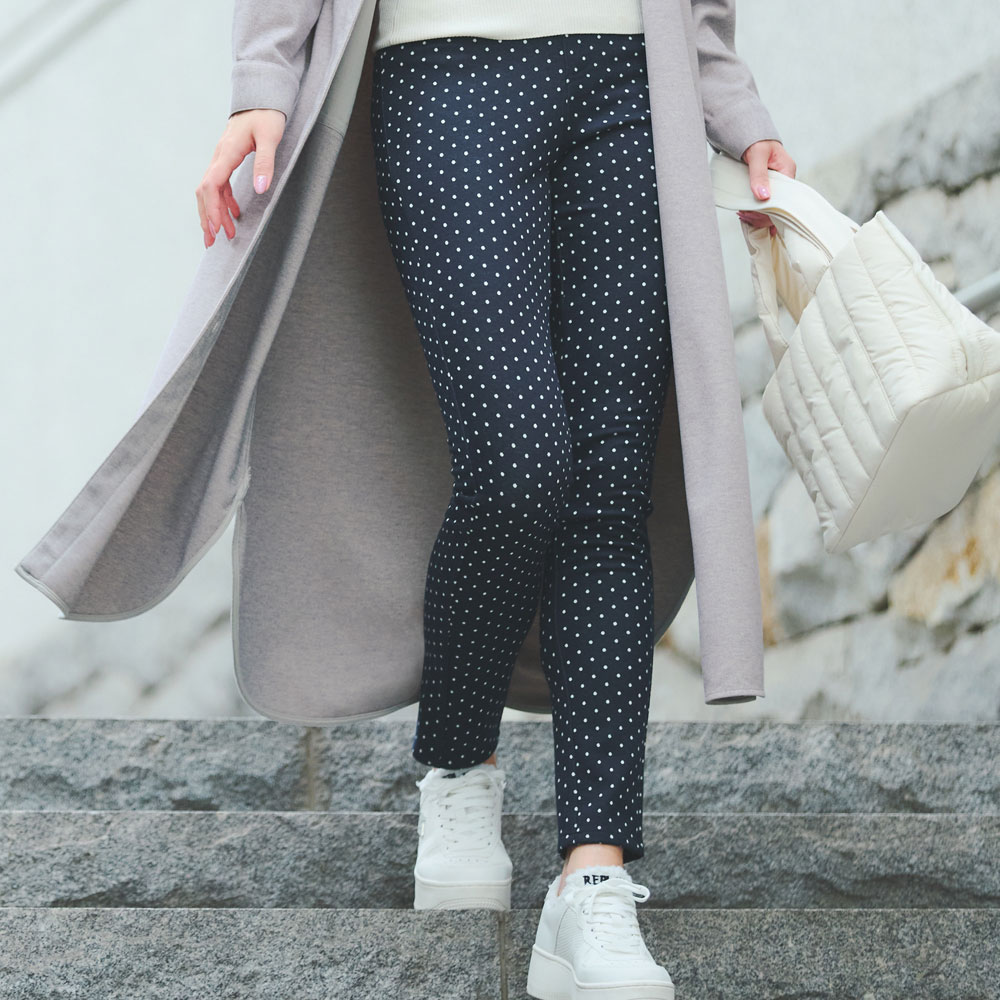 ジャカード織りのドット生地で無地ライクに使え、さらに脇の接ぎを少し前に入れることで細見えを狙ったレギンスパンツです。伸びやかで、ウエストは平ゴムを使ったプルオンタイプ。はき心地も楽ちんなのが嬉しい。≫ POINTジャカード織りで表現したドット柄。目が詰まったしっかりめの生地感です。