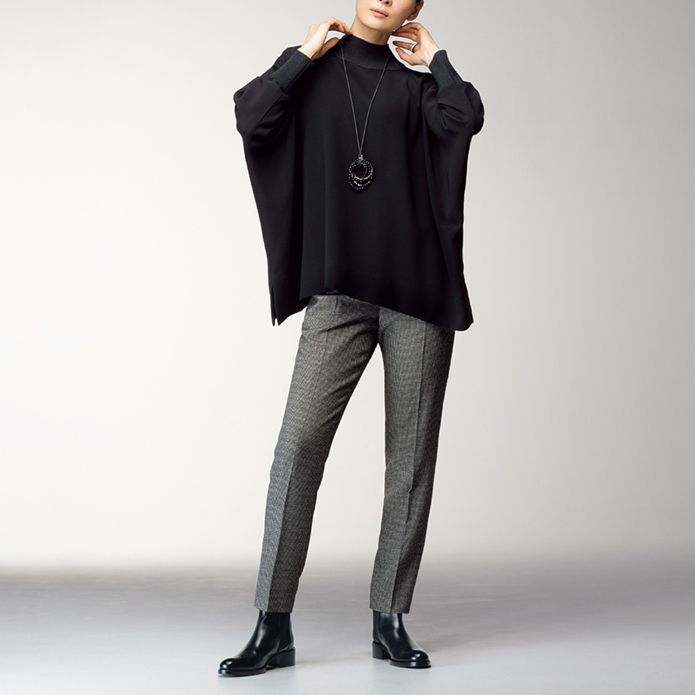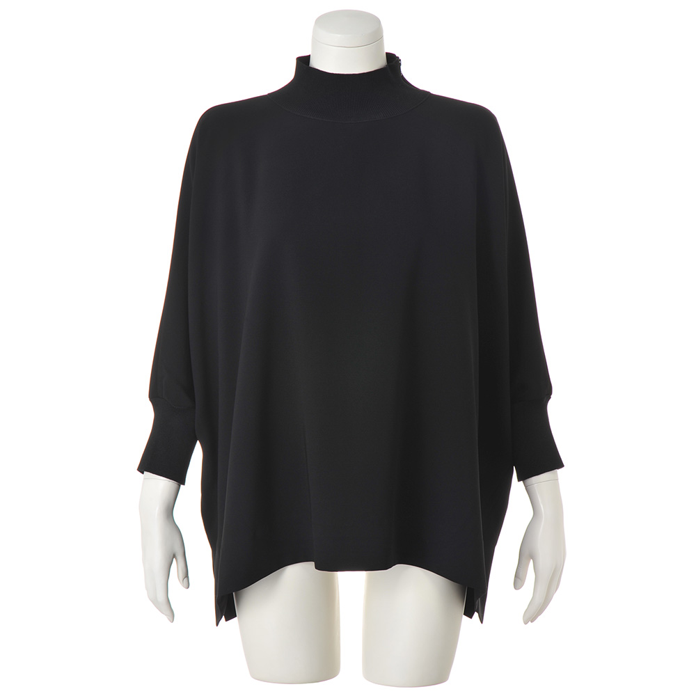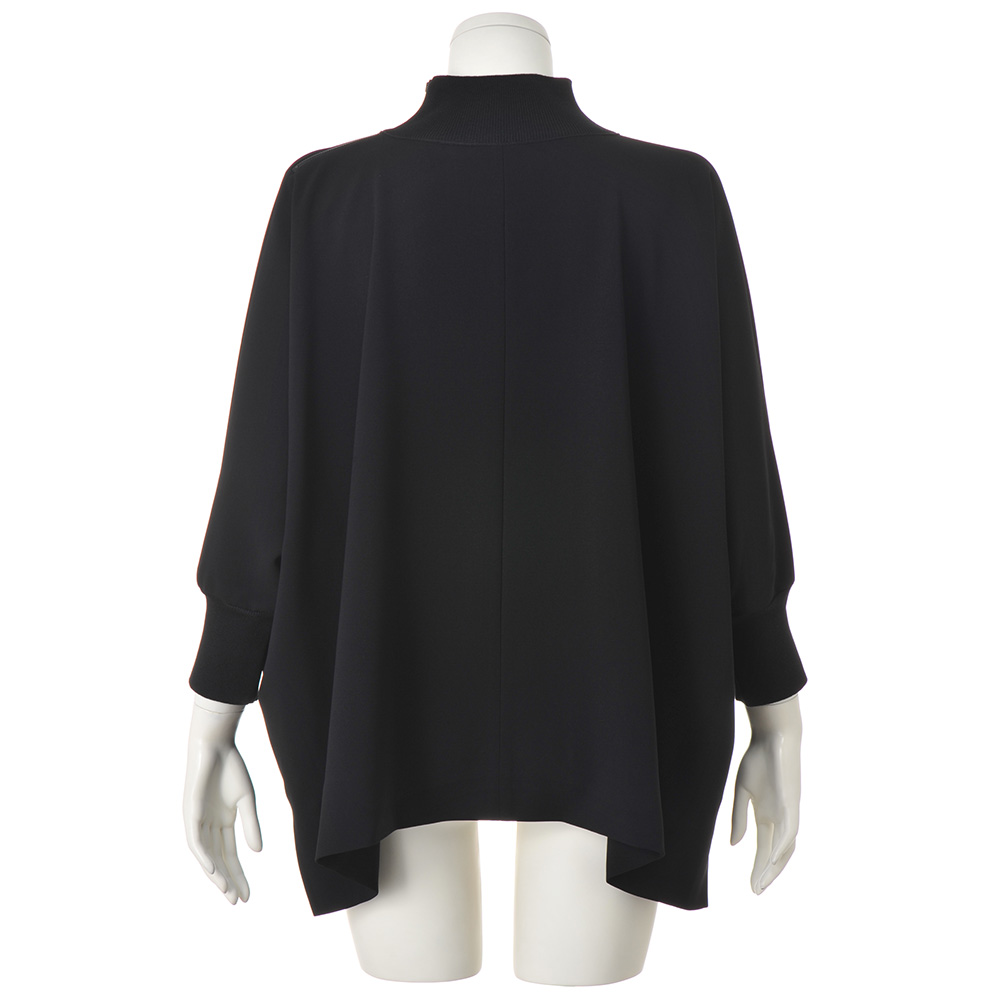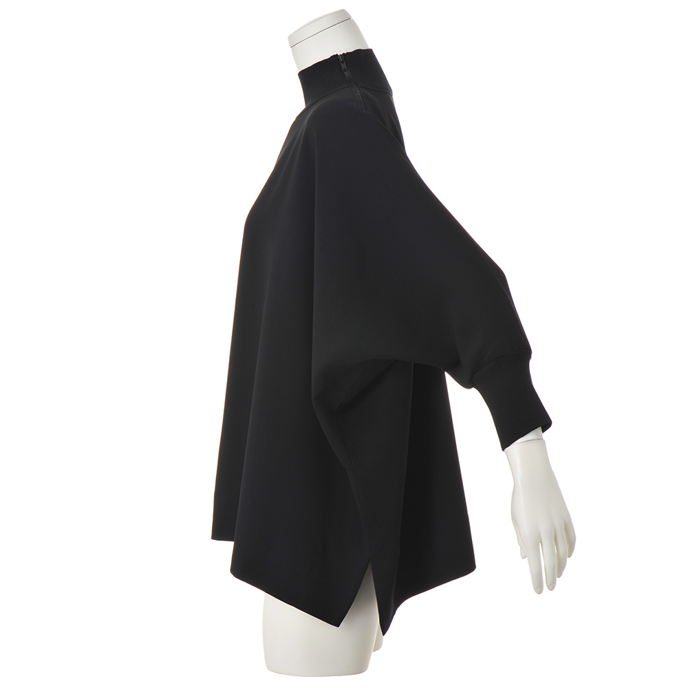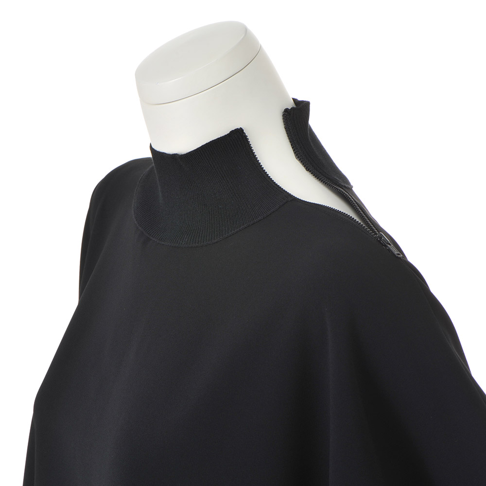 身体が入った途端、動きが生まれるしなやかなプルオーバー。ドライな肌触り、膨らみのある落ち感、ブラックの深い発色は、トリアセテート混素材の二重織りならではです。ハイネックと袖口に組み合わせたニット部分は毛羽を抑えたコットン混素材で、目面の美しさとフィット感が格別です。POINT横広のスクエアフォルムと素材の落ち感で、着ると自然に両サイドが落ちるヘムラインに。左襟のファスナー、裾のサイドスリットがアクセント。