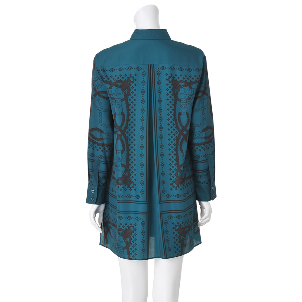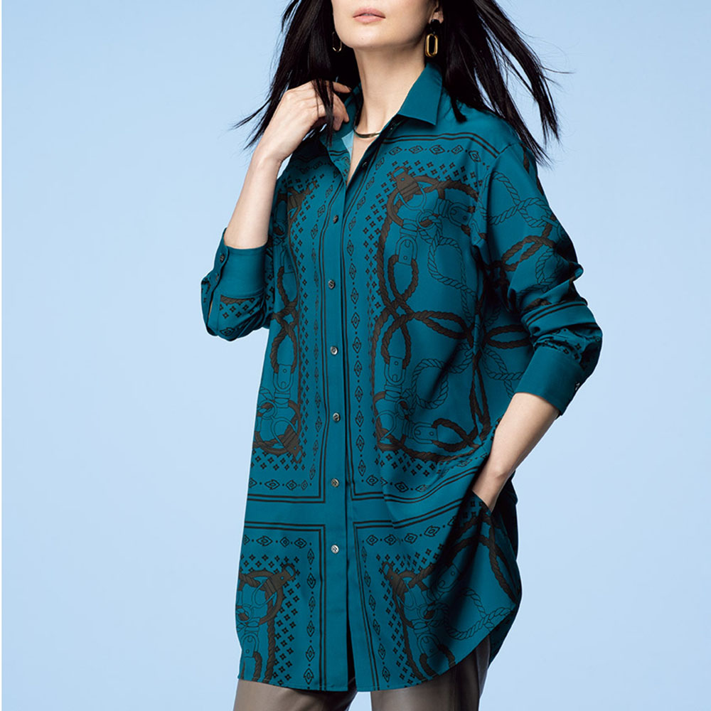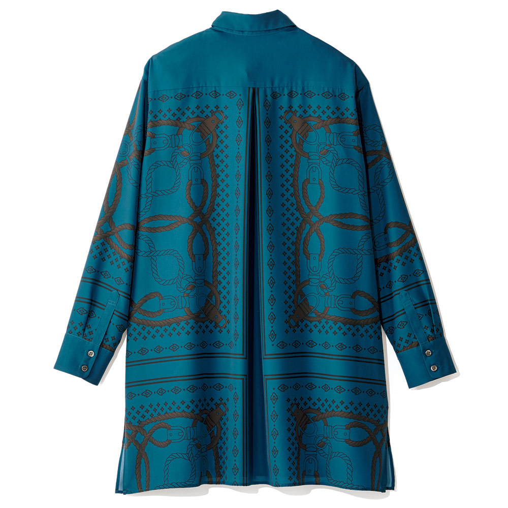 クールな配色でパネル柄をより大人に仕上げる。気負うことなく日常にさらりと着こなせる、スカーフ柄のシャツチュニック。ロープと馬具のモチーフ、ブルーグリーン×ブラウンの洗練配色が、大柄のインパクトをクール・エレガンスに仕上げるポイントです。ポリエステルデシン生地の表面に広がる繊細なシボ感も、プリントに大人の深みを与えて。シルクのようになめらかな落ち感が活きる、腰周りやヒップ、太ももまでしっかりとカバーできる長めのチュニック丈です。POINT前身頃はシンプルに、後ろは背ヨーク下にタックを畳んでゆったりと。顔周りに効かせた無地や、効果的に配したパネルプリントの枠も着映えを約束します。