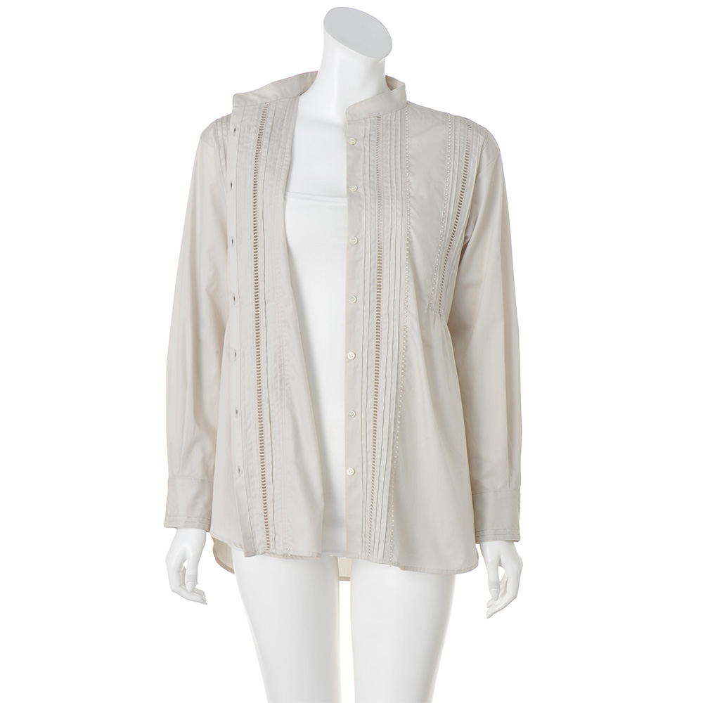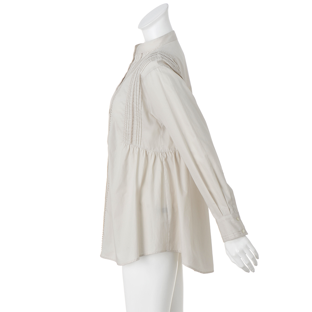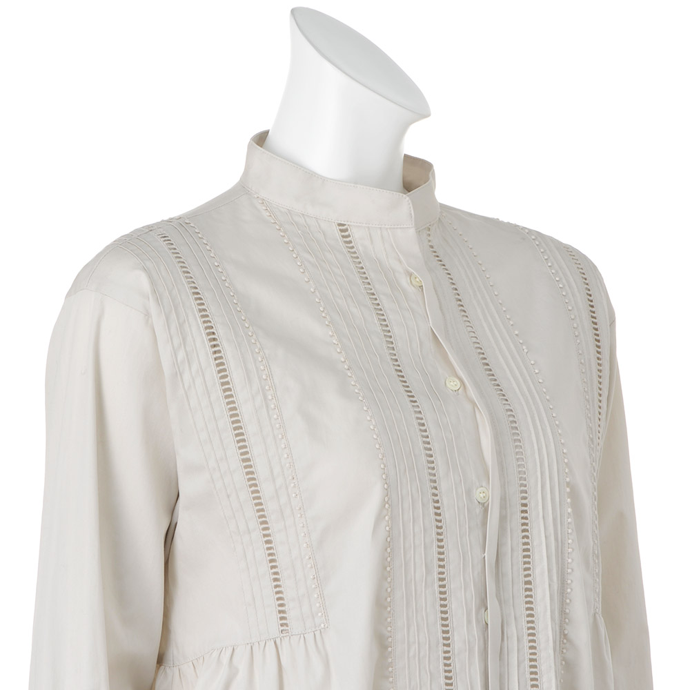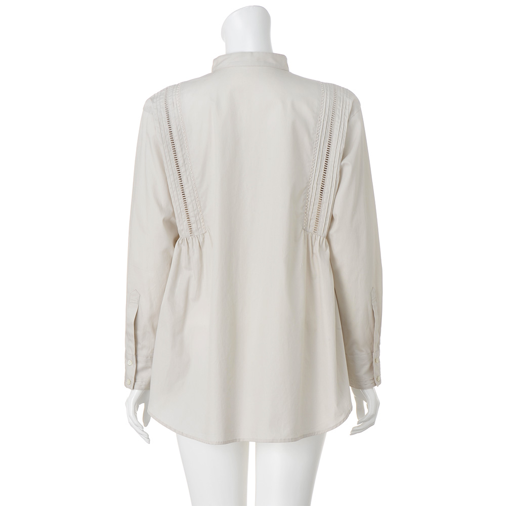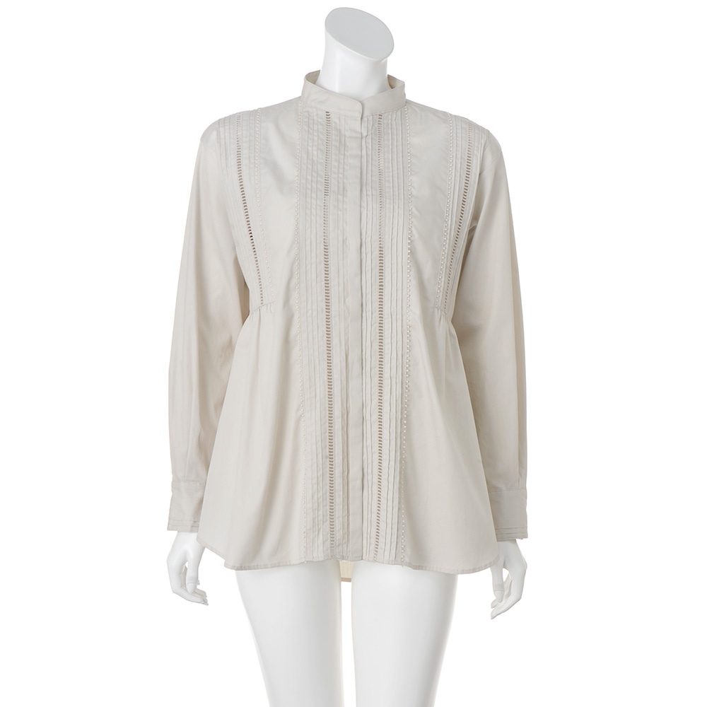大人をチャーミングに見せる可憐なクラフトワーク。大人の女性の愛らしさを引き立てるのは、クラフト感を大切にしたハシゴレースとピコレース。高密度に織られた薄手のコットンブロードの適度なハリのある素材感を活かし、前後のウエスト脇に切り替え&ギャザーをあしらい、ペプラムのようなほんのり甘いフォルムに仕立てました。レースに沿わせた繊細なピンタックも見事に調和し、縦のラインをアピール。バンドカラー、比翼仕立ての前立て、ピンタック入りのカフスで、端正な表情も添えました。