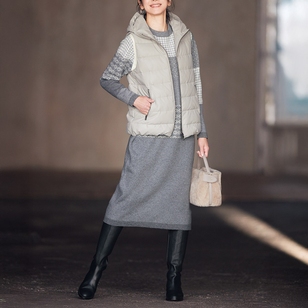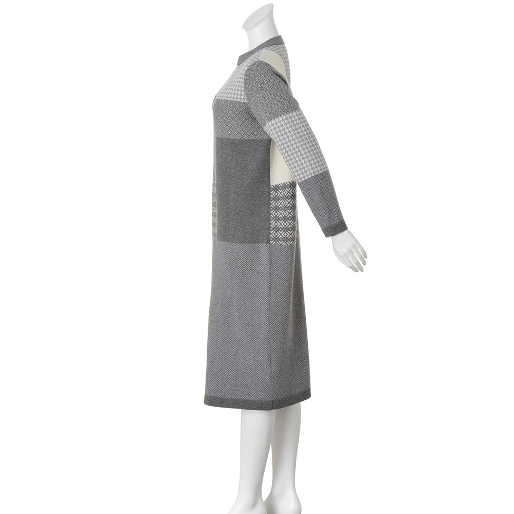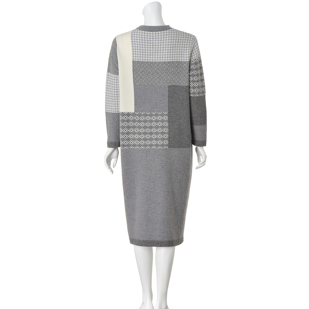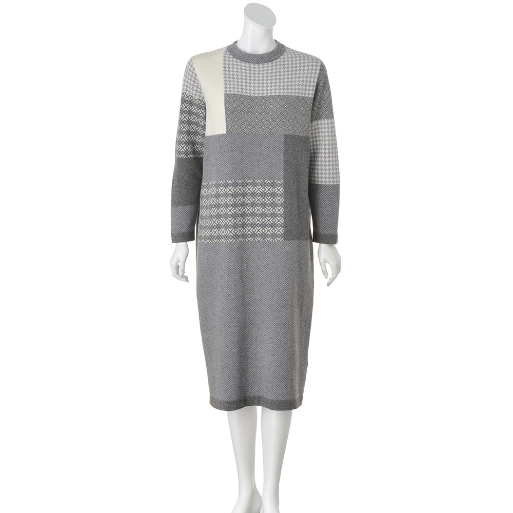 ジャカード柄をパッチワーク風に配した技ありニットワンピース。フェアアイルやヘリンボーンなどのトラディショナルなモチーフを組み合わせ、スタイルアップする配置にあしらいました。程良く身体になじむストレートシルエットが、気負いのないリラックスした着心地を叶えます。POINT素材はソフトで軽やかなカシミヤ混ウール糸。数種の柄をシングルジャカード編みで、袖口と裾は天竺袋編みでフラットに引き締めています。