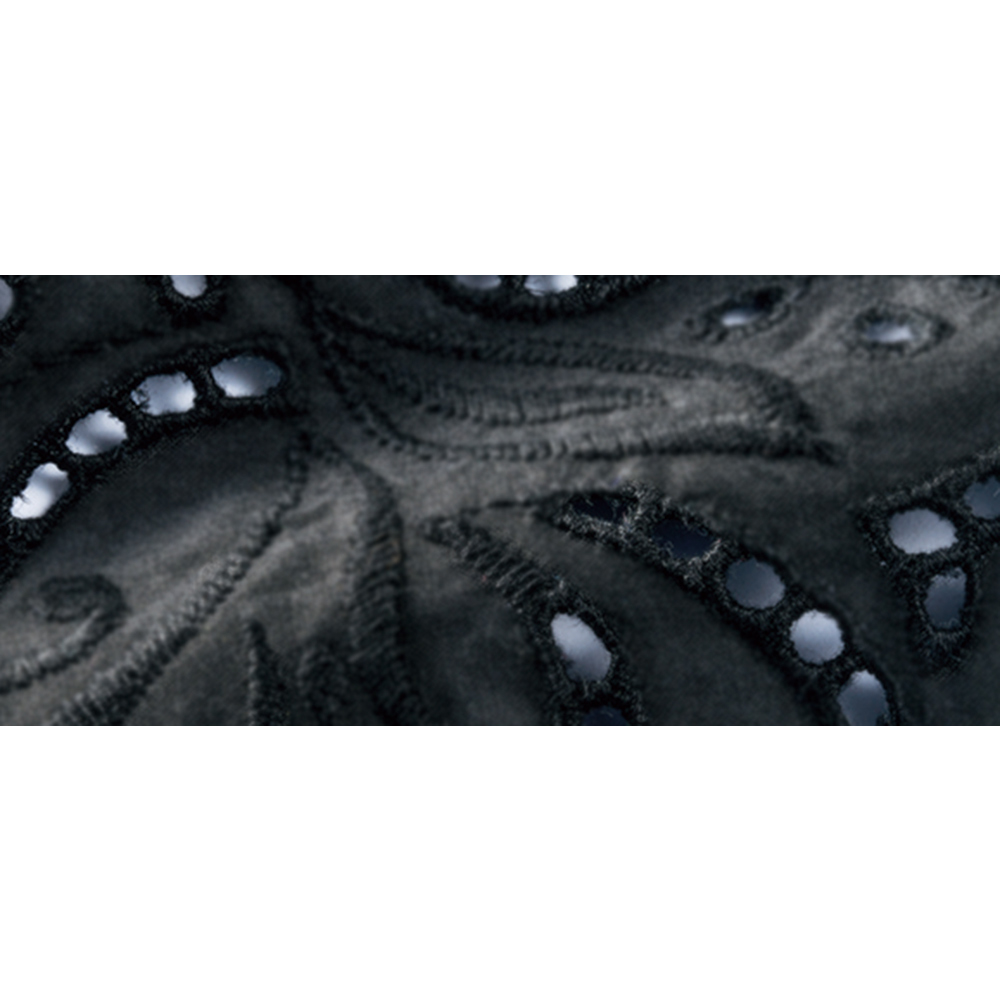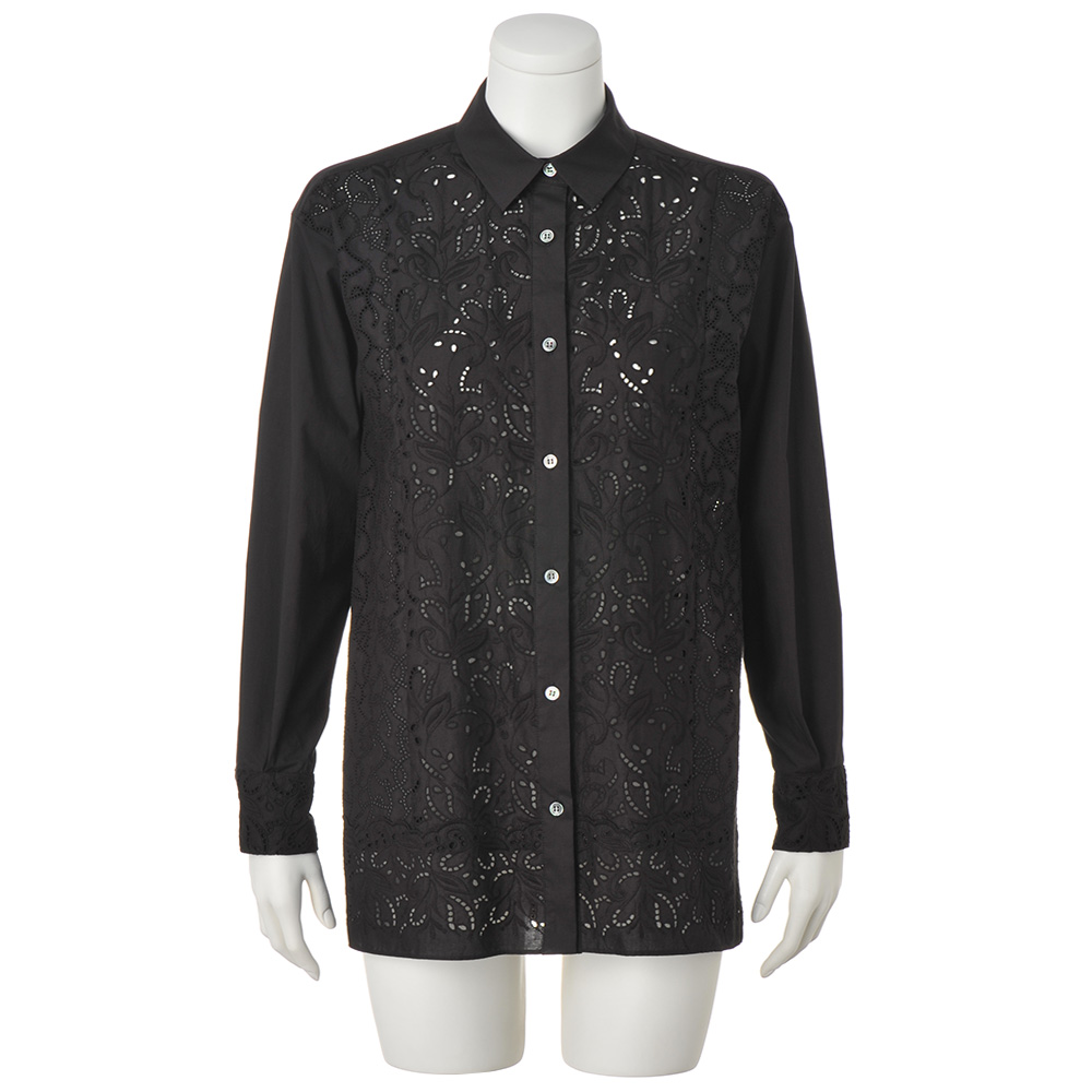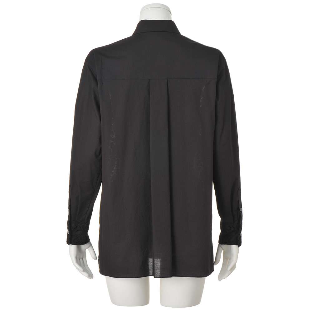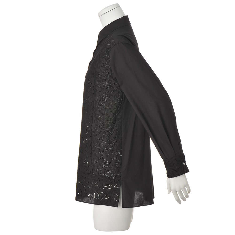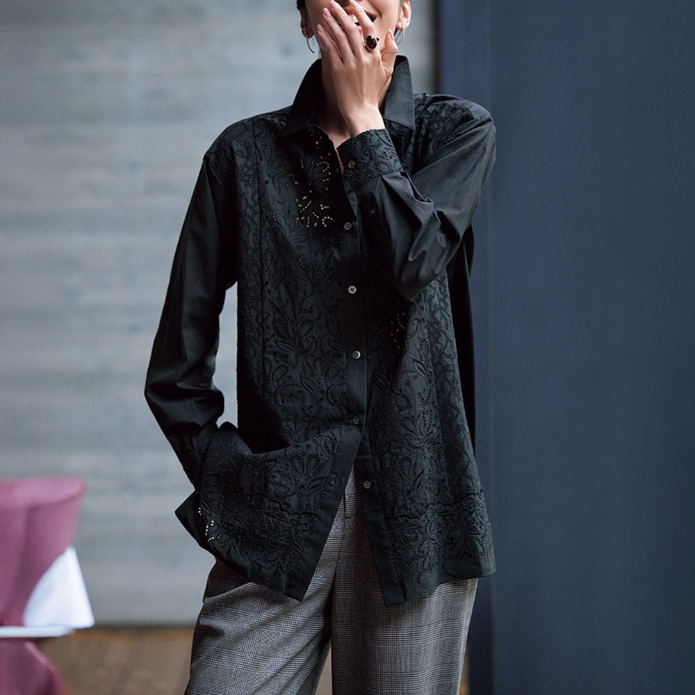 美映えレースシャツでくつろぐ佇まいに、大人のリュクスが香り立つ。丹念な仕事が光る「敦賀繊維(株)」のエンブロイダリーレースで、黒のシャツをドラマティックに更新!リーフ柄、幾何学柄、スカラップ柄の3種類のレースそれぞれにカットワーク刺しゅうされているのが、軽やかな統一感の決め手です。フロントは、身頃中央と両サイド、裾に合計3種類のレースをテクニカルに使い分け、カフス部分は幾何学柄レースを配して小粋な印象に。襟や前立て、袖、後ろ肩ヨークと後ろ身頃をソリッドな黒のコットン素材で引き締めて、甘さ控えめなモード感が香るのが大人好みです。≫ POINTスカラップをあえて裾切り替え部分に配し、接ぎ合わせることでクールな印象に。裾は、三巻始末の直線に仕上げてデザインの甘さを程良く抑えています。