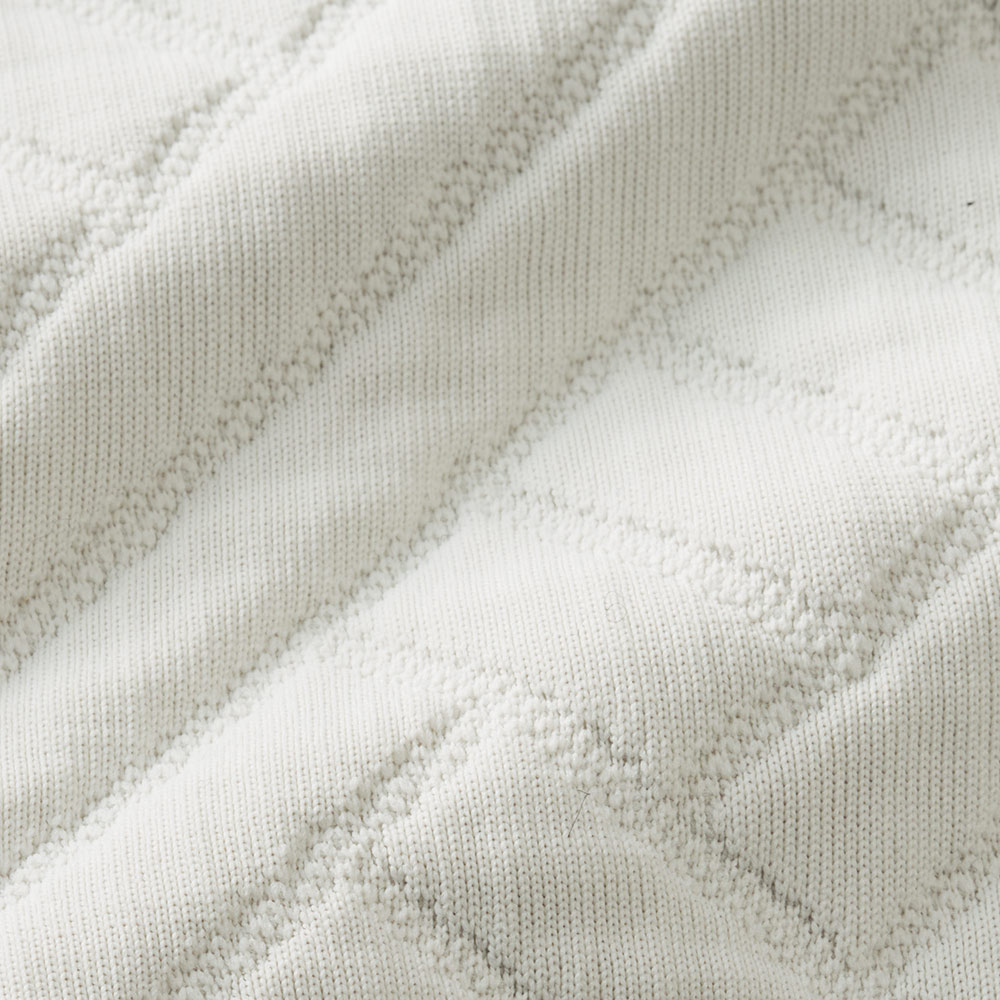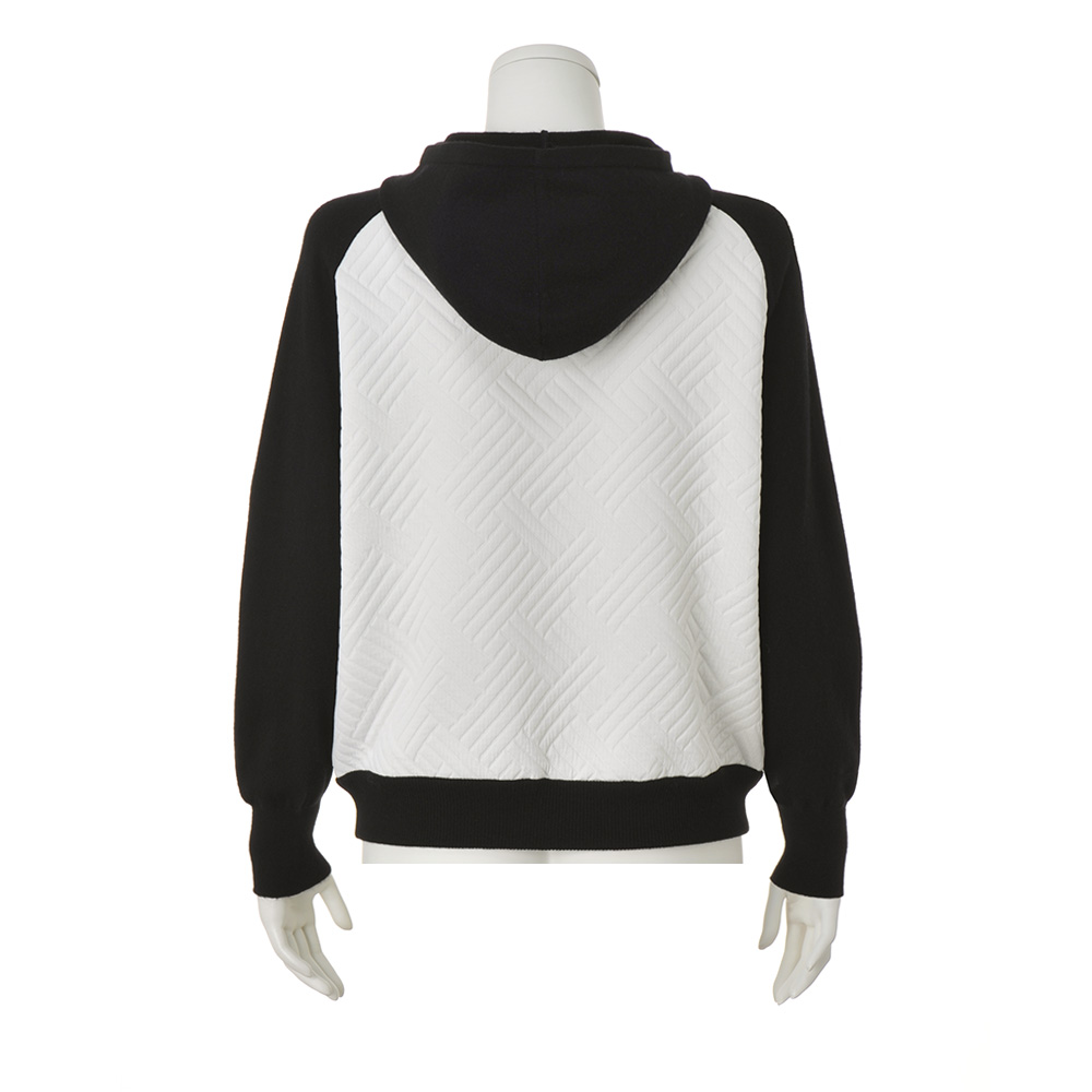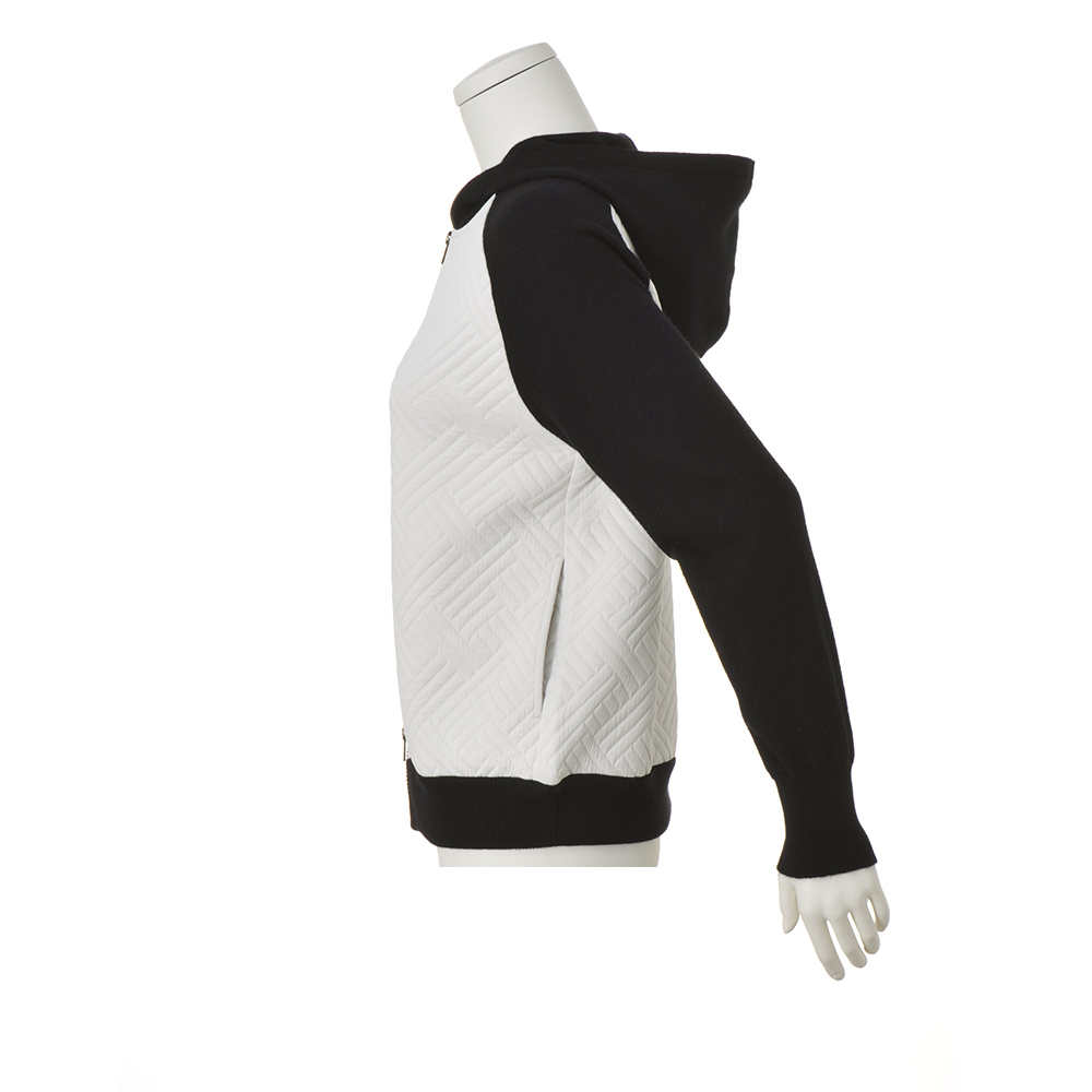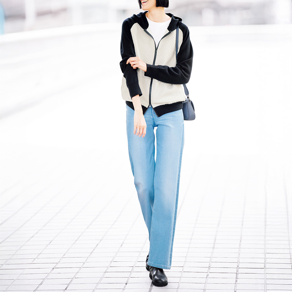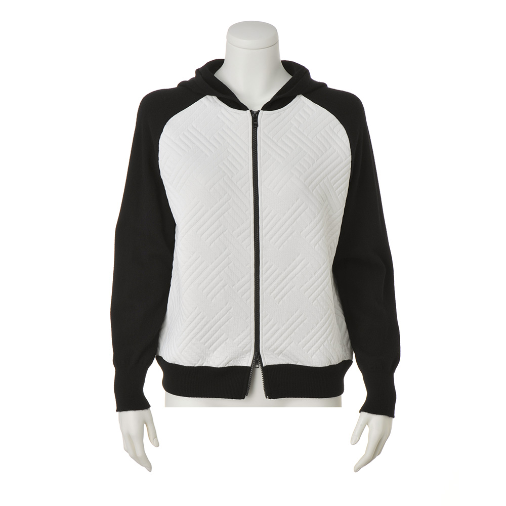 タウンで目を惹く、洗練カジュアルカジュアルの条件は、ベーシック性と心地よさ。そこに美的なエッセンスを加えたひとつ上のカジュアルスタイルです。ヘルシーな魅力こそ、カジュアルの本質羽織れば決まるバイカラーのパーカは、袖・裾リブ・フード部分にウールのニット、前後の身頃にパウダータッチなキルトジャカードを使ったハイブリッドな作り。ジャカードには立体的に幾何学柄が描かれていて、スポーティームードに瀟洒なニュアンスを足しています。フロントは黒のダブルファスナーでグラフィカルに引き締め。コートインの際のアクセントにも恰好です。