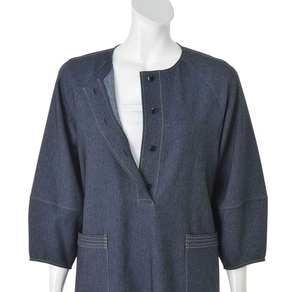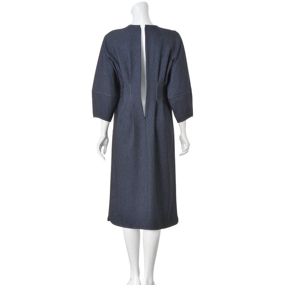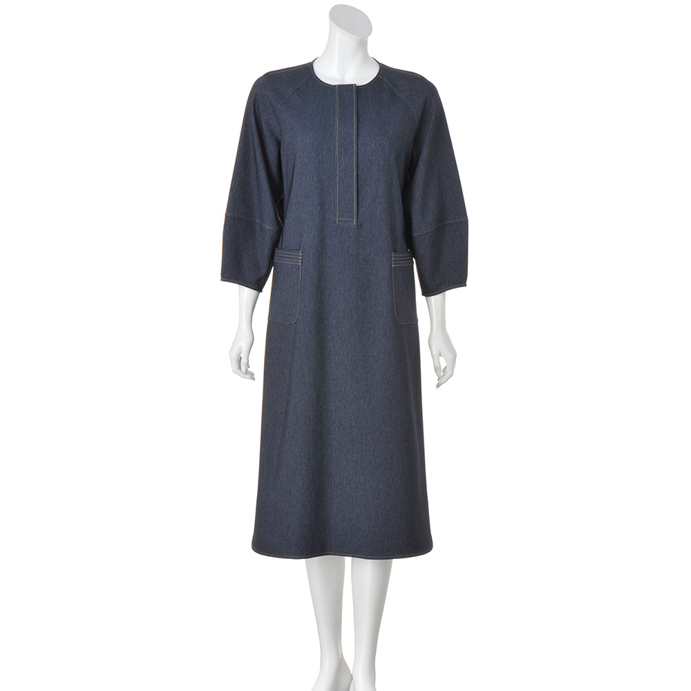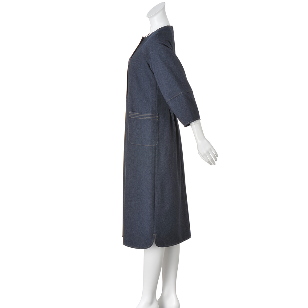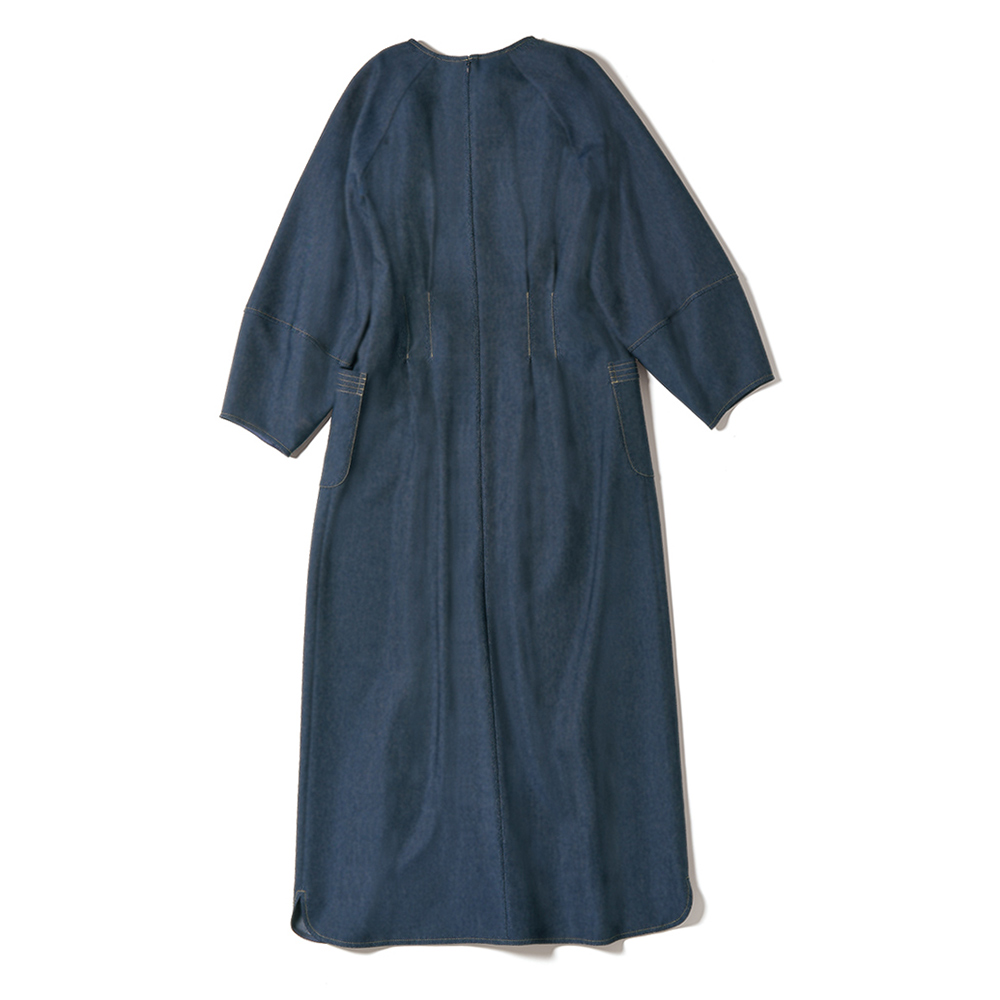 タウンで目を惹く、洗練カジュアルカジュアルの条件は、ベーシック性と心地よさ。そこに美的なエッセンスを加えたひとつ上のカジュアルスタイルです。笑顔が似合う、エフォートレスデザイン気負いがないのに、洗練オーラが漂うワンピースは、ポリエステル素材でしなやかな風合い。後ろの腰タックで絞りを入れているのが、女性らしいメリハリのゆえんです。前開きは比翼で凛とした表情に仕立て、デニムの象徴・カラーステッチでトリミング。パッチポケットの口は4本のステッチワークで、腰高効果を促すポイントにしています。モード感をひと押しするランタンスリーブ、緩やかにラウンドさせた裾ラインやスリットのディテールもシック。≫ POINT後ろはウエストにタックを入れてすっきりと。着脱に便利な後ろファスナー。