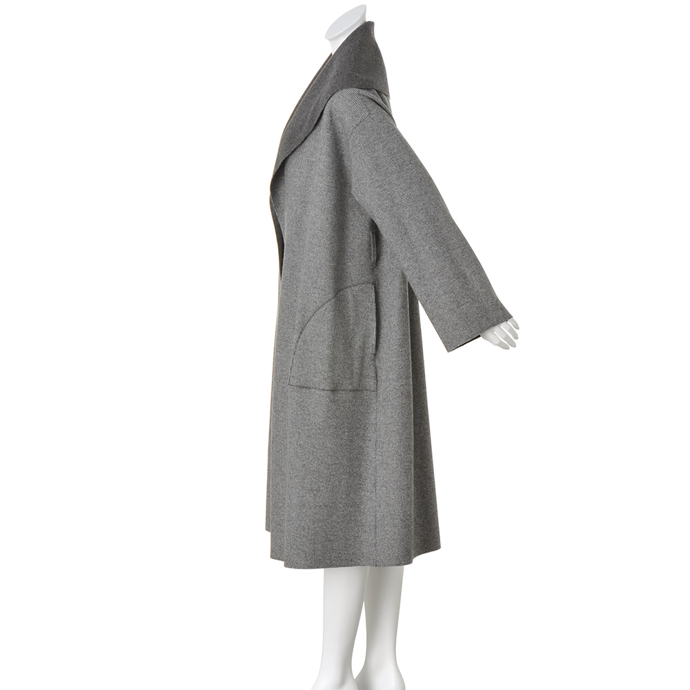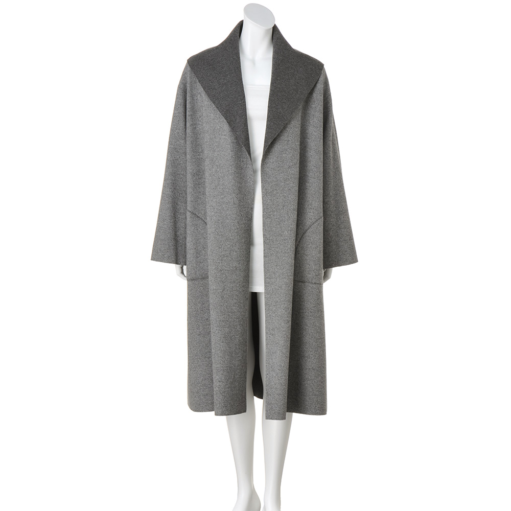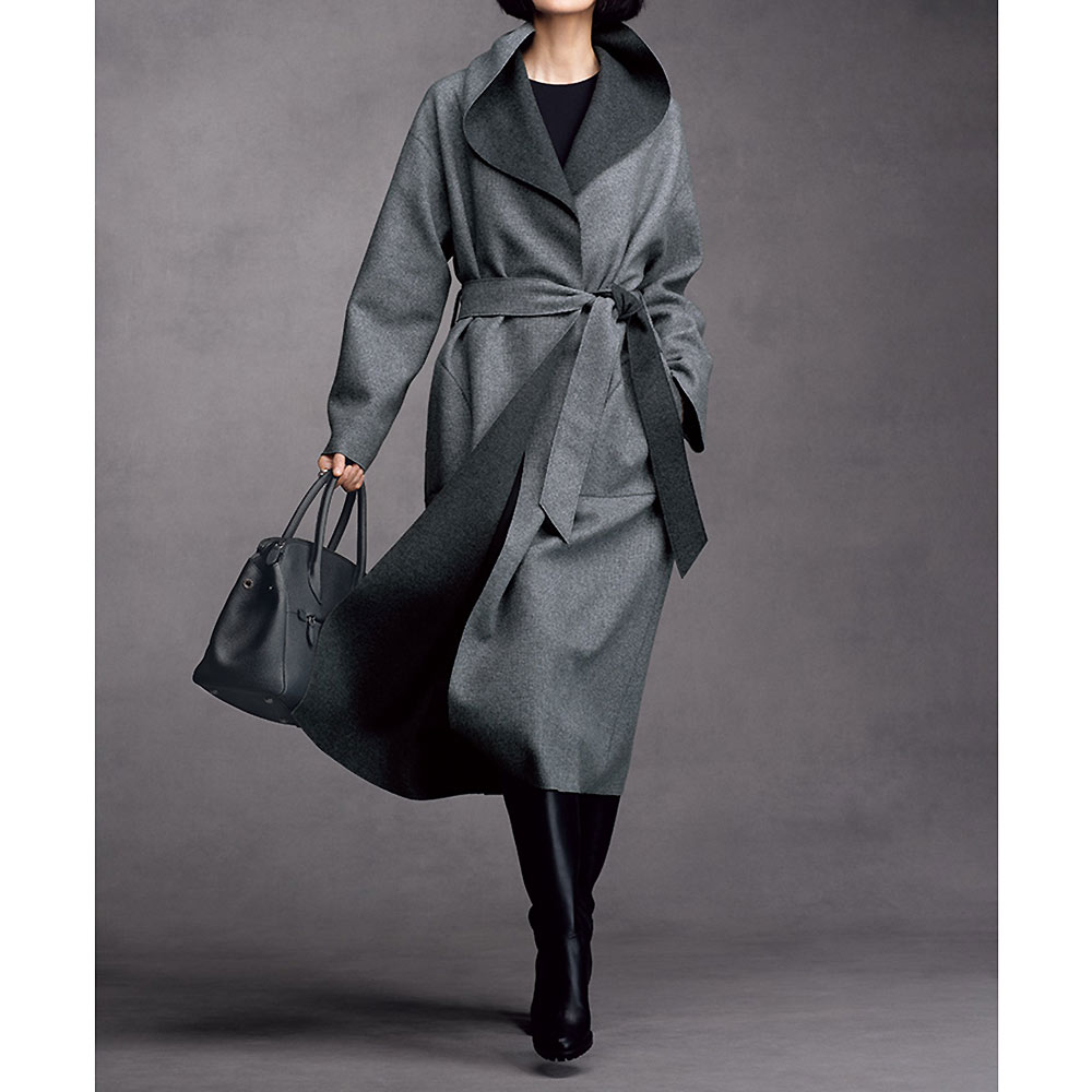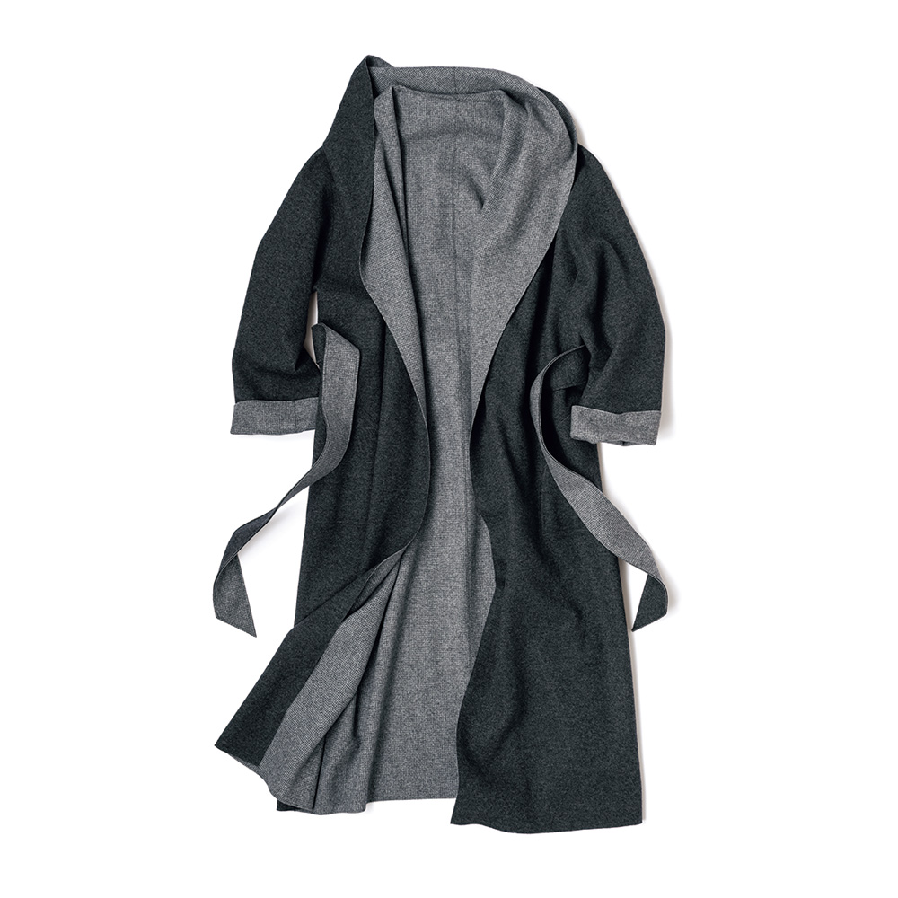 リバーシブルコートで楽しむリュクス&シンプルの表現力薄く軽やかなコートは、素材も縫製も上質さを追求した拘りの一着。素材は、イタリア「CARIAGGI」社のウールカシミヤ紡毛糸「FLANNEL」を使って国内で編み上げた、チャコールグレーの無地と細かい千鳥格子柄のダブルフェイスジャージー。どちらの面も主役になるリバーシブル仕様に拘って、2枚の生地をぴったりと突き合わせてフラットに仕上げるTPS(ツインプロヴァーシーム)縫製で厚みのないしなやかなシルエットを実現。TPSは国内特許を持った特殊ミシンを使いどちらを表にしても縫い代が肌に当たらず、快適な着用感を得られます。デザインは、フード風のショールカラーから前端までひと続きにしてふんわりとした立体感を演出したトッパータイプ。ボタンレスの軽快さを活かしてノンシャランに羽織ったり、共生地のサッシュベルトをウエストで留めたり…シンプルながら着こなしのイメージに合わせてアレンジできるのも、大人の多彩なライフシーンを見つめたDAMA collectionらしさです。イタリア「CARIAGGI」社の新境地を拓く「FLANNEL」は、繊度16・5マイクロンのスーパーエキストラファインメリノ原毛に、繊度15〜15・5マイクロンの極細のカシミヤを混紡した細番手の紡毛糸。それを単糸使いにして編み上げたダブルフェイスジャージーのリバーシブルコートは、えもいわれぬ軽さと柔らかさ、洗練されたナチュラル感…。上質素材の多彩な魅力を気負いなく満喫していただけます。