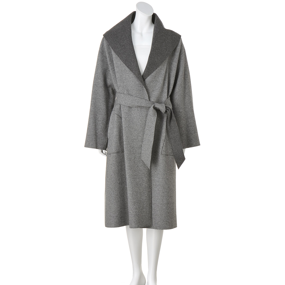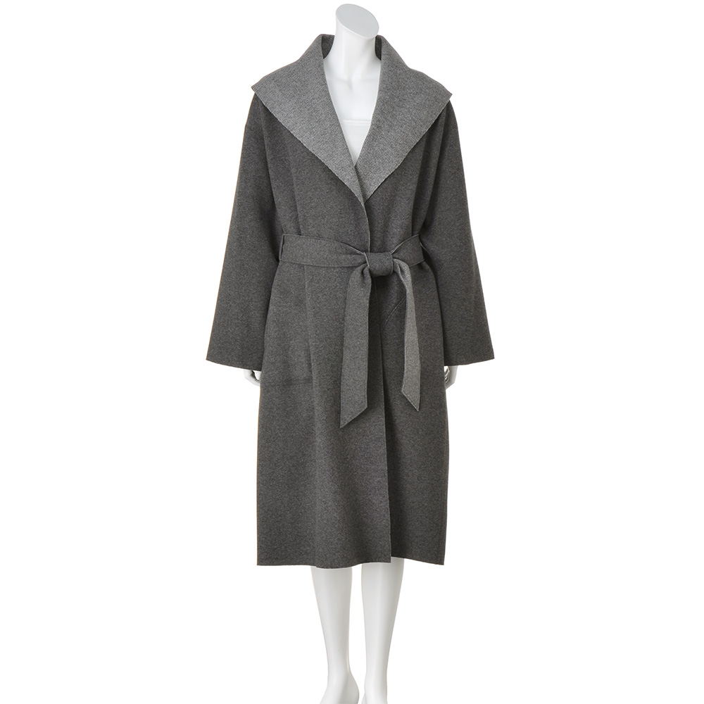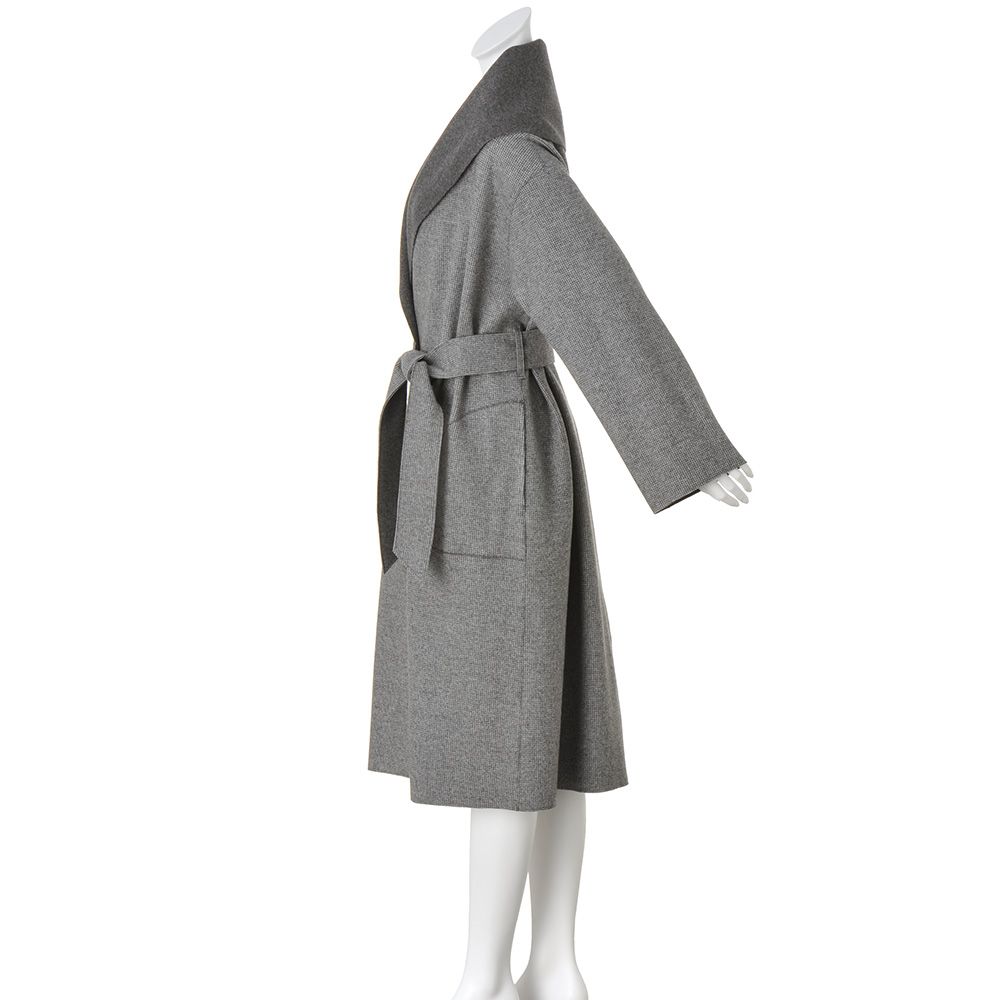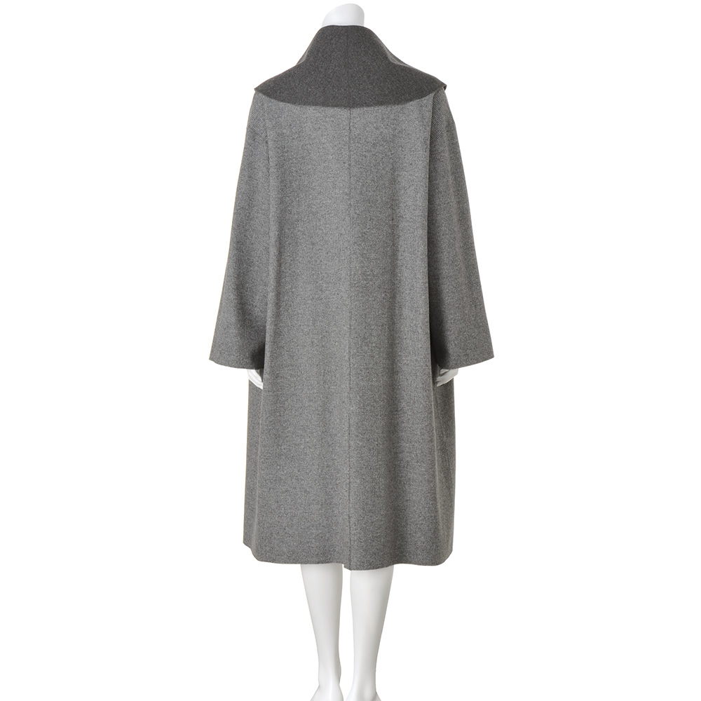 リバーシブルコートで楽しむリュクス&シンプルの表現力薄く軽やかなコートは、素材も縫製も上質さを追求した拘りの一着。素材は、イタリア「CARIAGGI」社のウールカシミヤ紡毛糸「FLANNEL」を使って国内で編み上げた、チャコールグレーの無地と細かい千鳥格子柄のダブルフェイスジャージー。どちらの面も主役になるリバーシブル仕様に拘って、2枚の生地をぴったりと突き合わせてフラットに仕上げるTPS(ツインプロヴァーシーム)縫製で厚みのないしなやかなシルエットを実現。TPSは国内特許を持った特殊ミシンを使いどちらを表にしても縫い代が肌に当たらず、快適な着用感を得られます。デザインは、フード風のショールカラーから前端までひと続きにしてふんわりとした立体感を演出したトッパータイプ。ボタンレスの軽快さを活かしてノンシャランに羽織ったり、共生地のサッシュベルトをウエストで留めたり…シンプルながら着こなしのイメージに合わせてアレンジできるのも、大人の多彩なライフシーンを見つめたDAMA collectionらしさです。イタリア「CARIAGGI」社の新境地を拓く「FLANNEL」は、繊度16・5マイクロンのスーパーエキストラファインメリノ原毛に、繊度15〜15・5マイクロンの極細のカシミヤを混紡した細番手の紡毛糸。それを単糸使いにして編み上げたダブルフェイスジャージーのリバーシブルコートは、えもいわれぬ軽さと柔らかさ、洗練されたナチュラル感…。上質素材の多彩な魅力を気負いなく満喫していただけます。