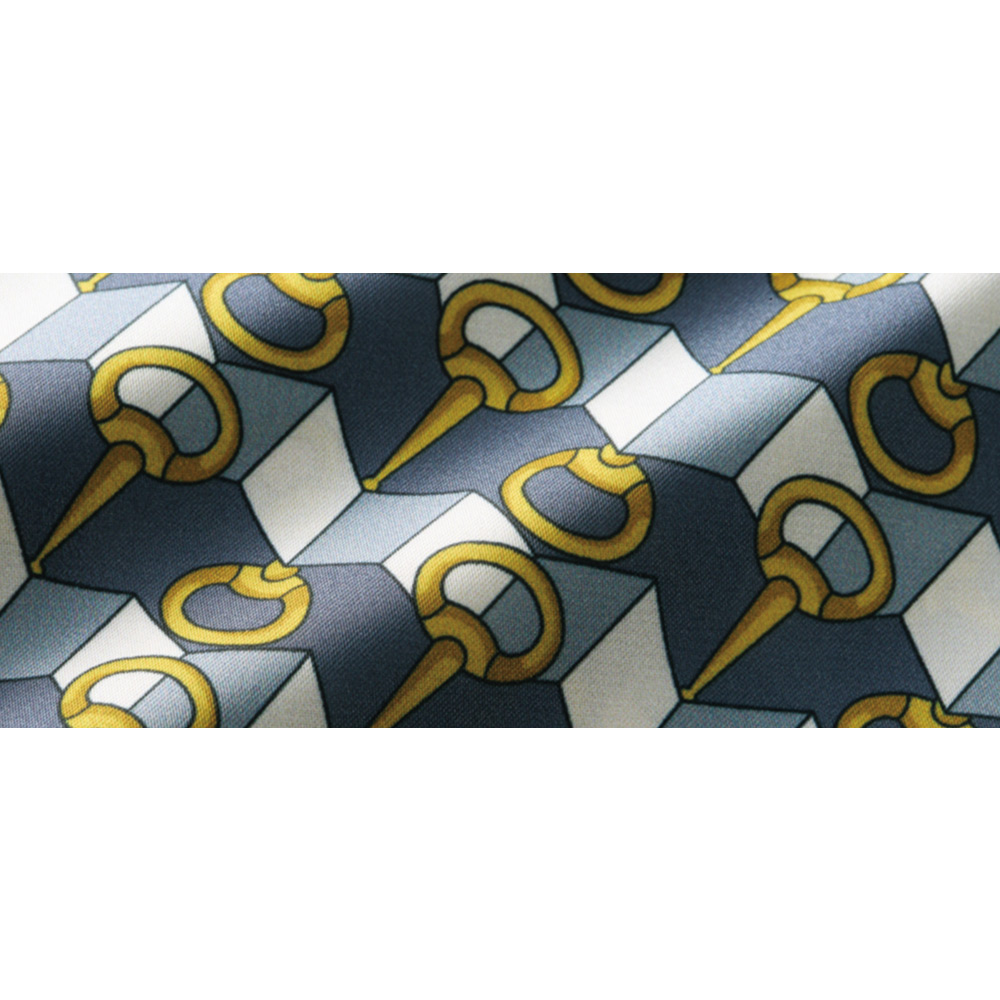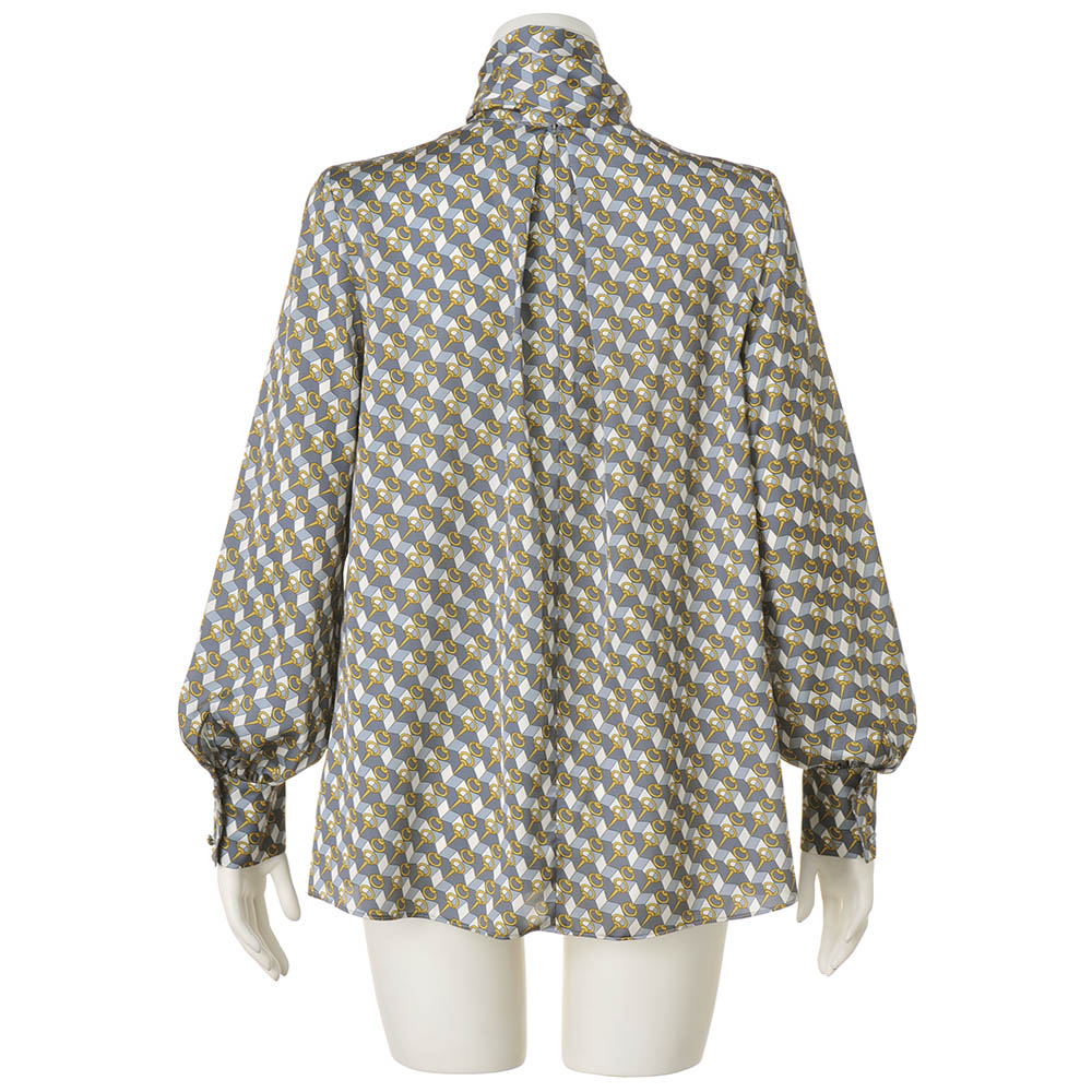 クラシック・モダンなブラウスの気品漂う美しさ立体的な幾何学模様と伝統のビット柄が見事に融合したプリントはさすがイタリア「RATTI」社。生地は印象的な柄と配色が映える、美しい光沢感のポリエステルサテン。しなやかな落ち感を活かし、前後の首元にはタックを、カフス上には細かいギャザーを寄せて、ふんわりとしたボウタイブラウスに。後ろファスナー開きで、ボウタイは後ろで交差させて前で結ぶ仕様。カフスにくるみボタンをあしらったパフスリーブが、優雅に見せてくれます。