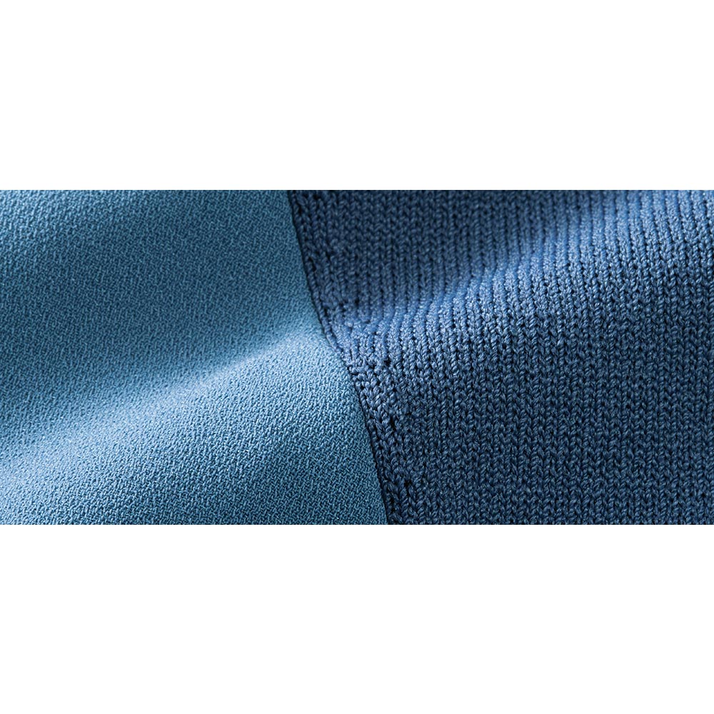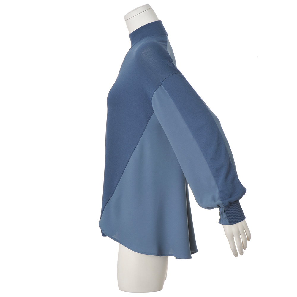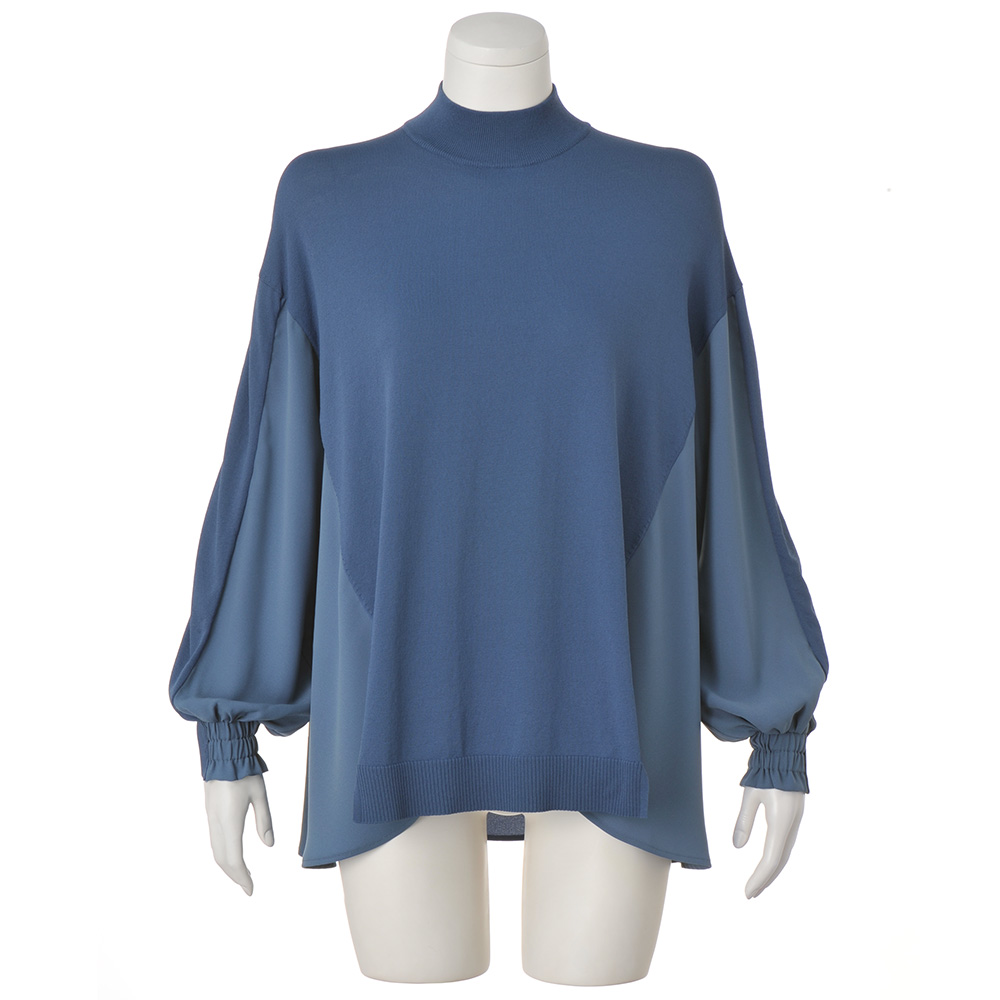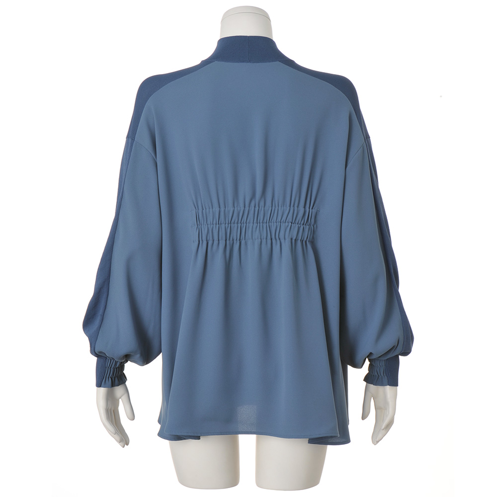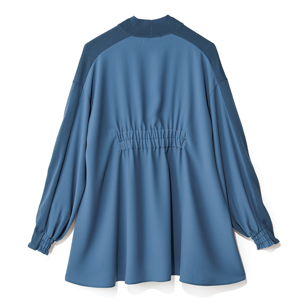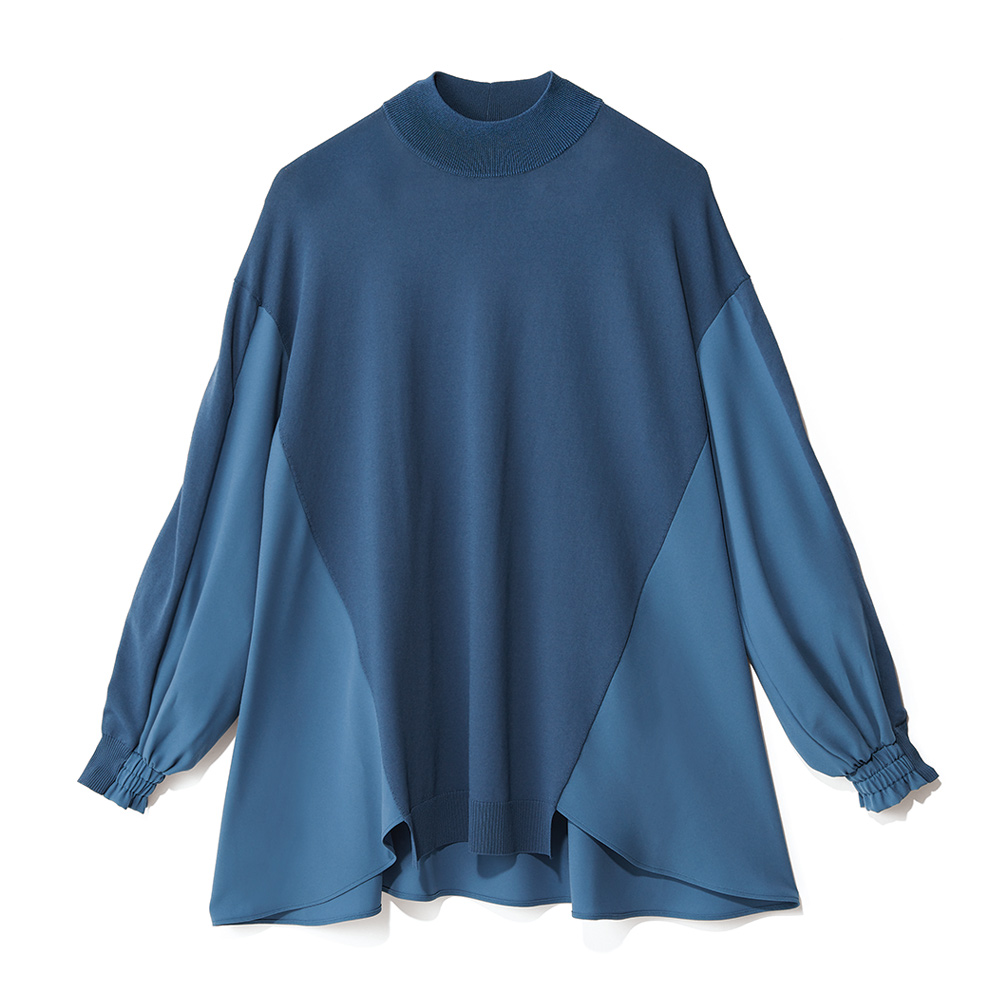 素材ミックスとヘムラインで表情豊かに、美しく異素材のコンビネーションと考え抜かれたディテールで、ゆったりとしたシルエットをセンス良くスタイルアップ。前身頃と後ろ肩、襟と袖の中心線は、サラッとした肌触りのビスコースナイロンのハイゲージニット、それ以外は上品なシボ感のジョーゼット生地をドッキング。斜め内側に入れた脇線が細見えを、裾の段差と後ろをやや長くしたカーブラインが軽やかな印象を、素材の違いによる色の微差がさりげないメリハリ感を演出。パフスリーブの膨らみを作り出す袖口のリブ&ゴムシャーリングは、袖をたくし上げやすくする効果も。≫ POINT後ろウエストの中央にあしらわれたゴムギャザーでさりげなく背中に沿わせ、スタイルアップ。