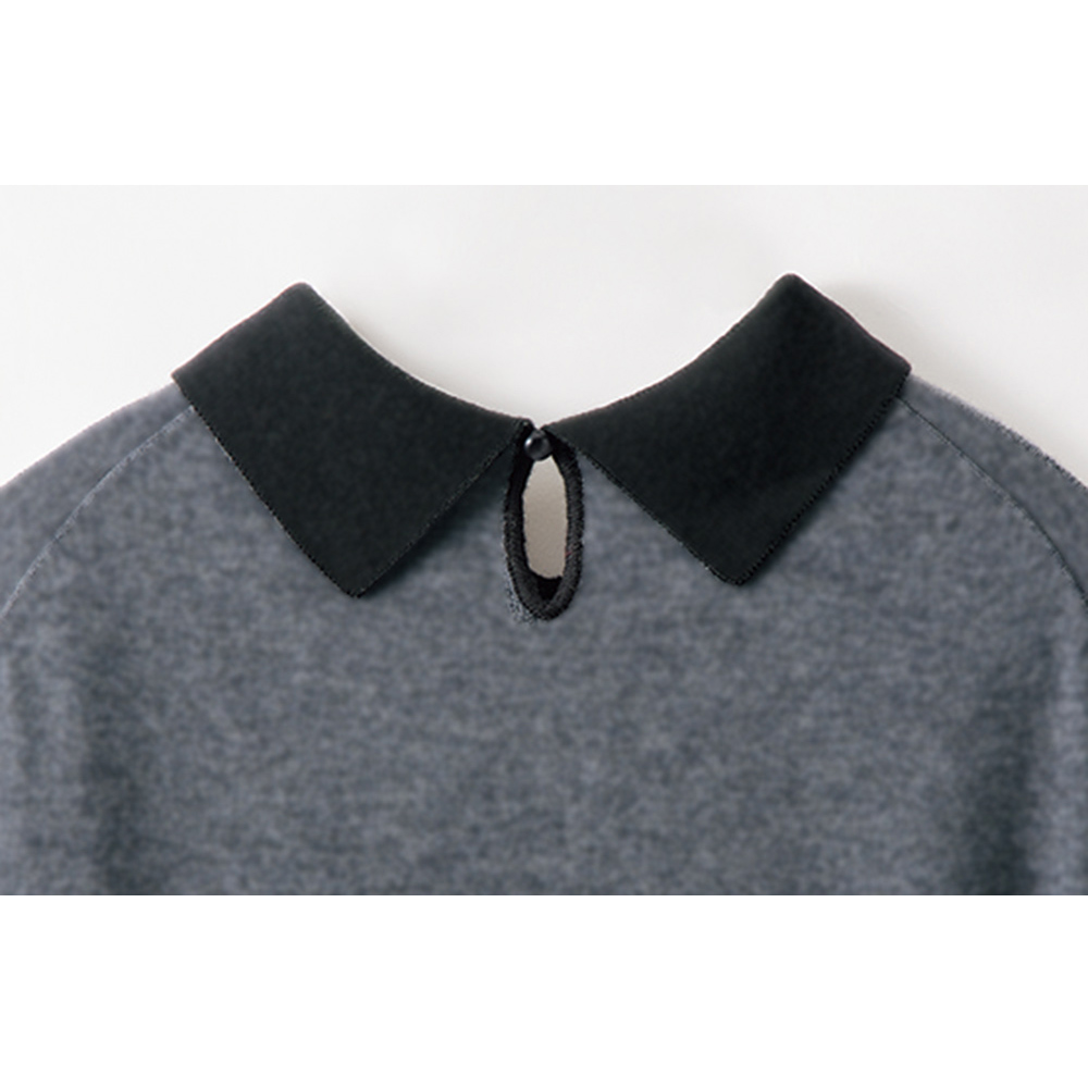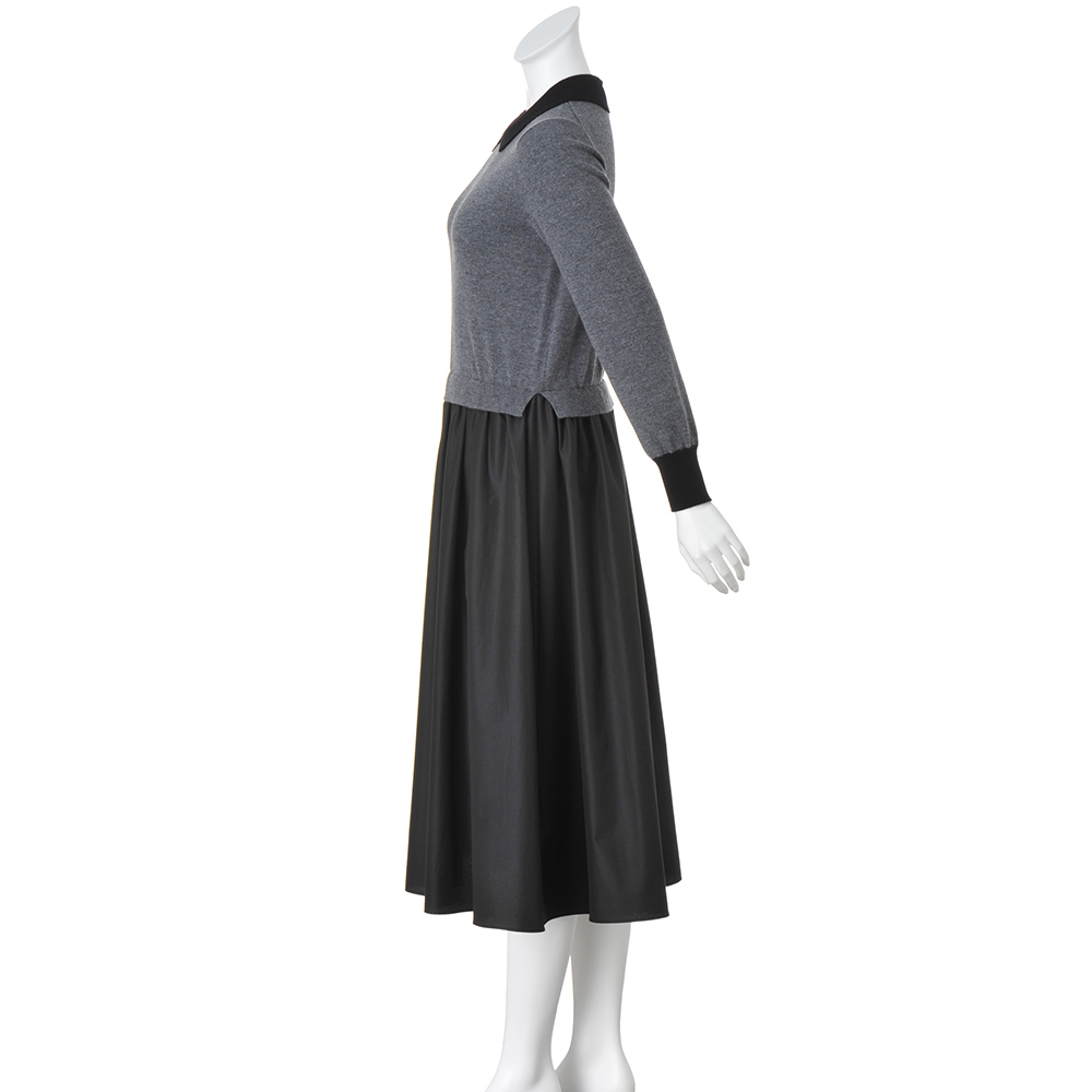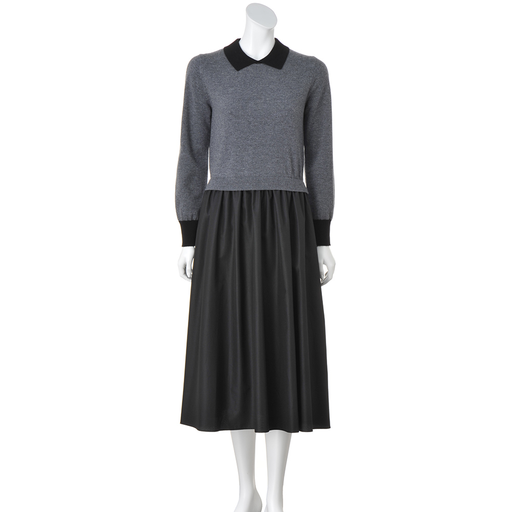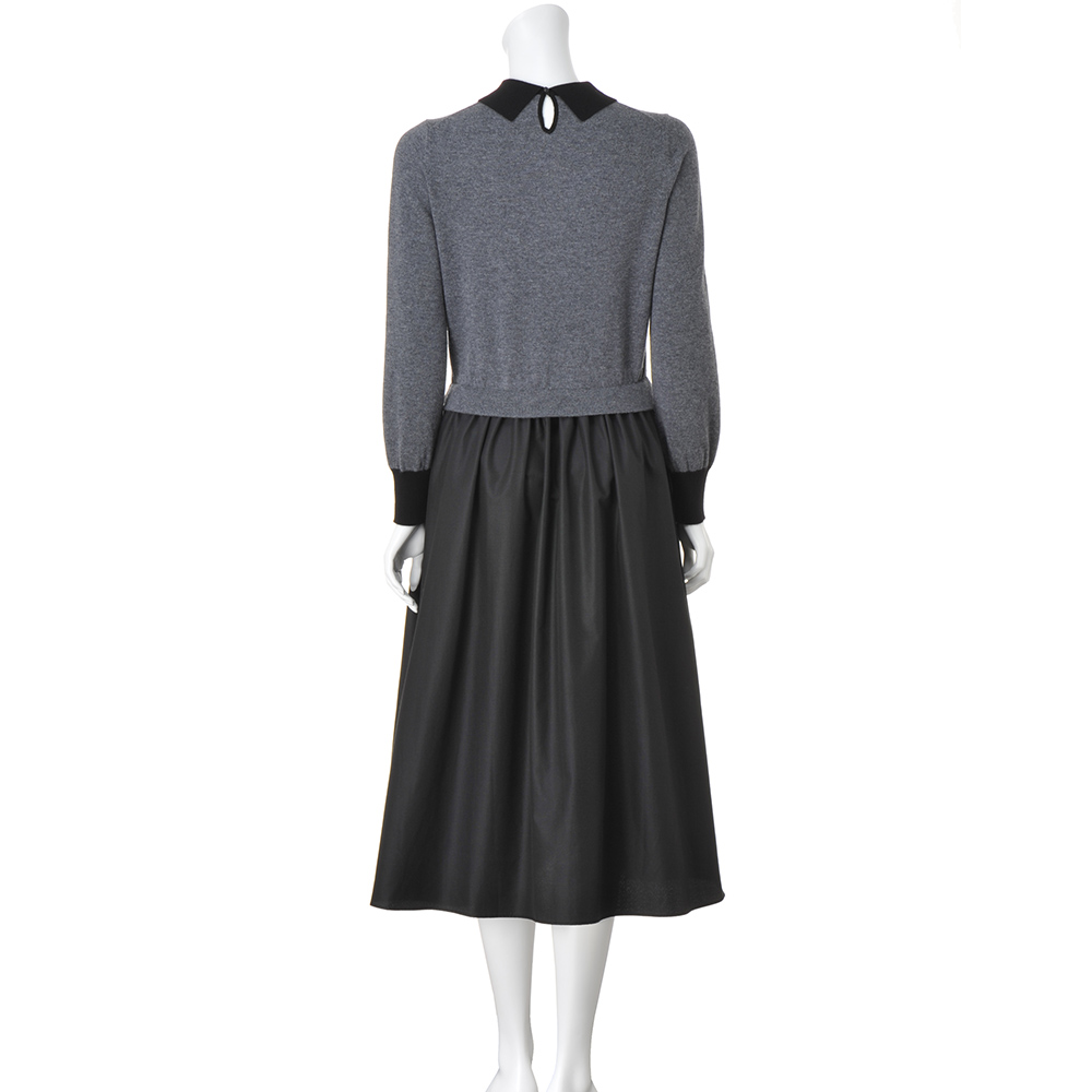 気品溢れるモノトーンの洗練とフェミニティを大人の女性なら、どちらも欲しい「コーディネート力」と「着映え力」を一瞬で叶えるワンピース。上半身はノーブルな襟付きニットプルオーバー。厳選された極細ウールの撚糸は膨らみ感と同時に軽さも実現。自然な暖かさと着心地のよさに心癒やされてください。キレイな目面の天竺編みは、襟を総針編みにして、後ろ姿もきちんと丁寧にデザイン。スカート部分はふわりと広がるハリ感と上品な光沢を持つタフタにカレンダー加工で微光沢感を出しエレガントに。フォーマル過ぎずカジュアル過ぎない“華やかな黒”が着用シーンを広げます。ドッキング部分はニットの両脇にスリットを入れ、細見えして着映えする優秀な一着に仕上げました。