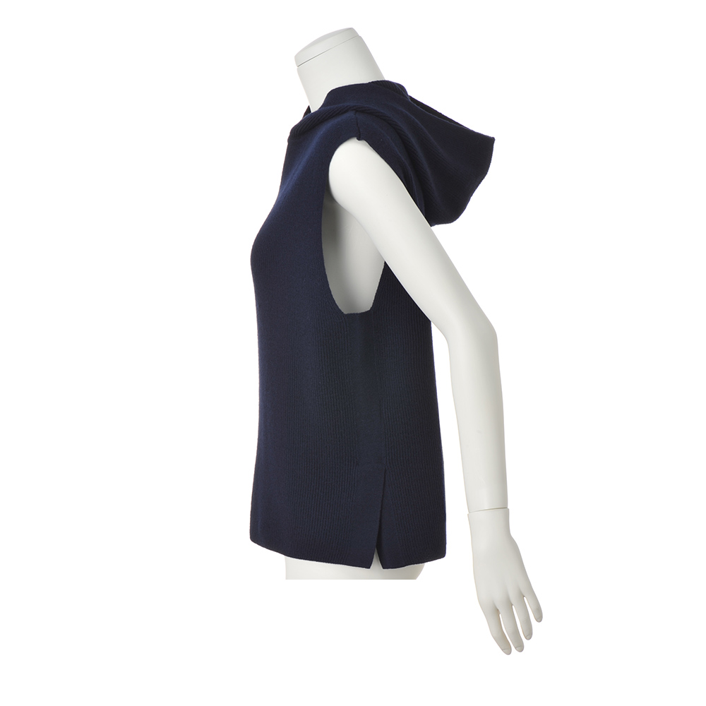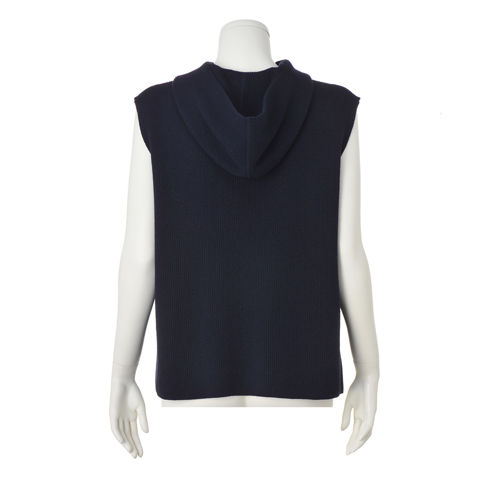 ミニマルな印象派モード暖かく、体型カバー力も。良いこと尽くしのジレを高品質なウール100%で作りました。ポイントはヘルシーなフード付きデザイン。ざっくりと編まれた両畦の身頃は、フレンチ袖や両裾ベントなど着用時の魅せポイントを盛り込んで。プルオーバーやワンピースまで幅広いレイヤードにも対応します。