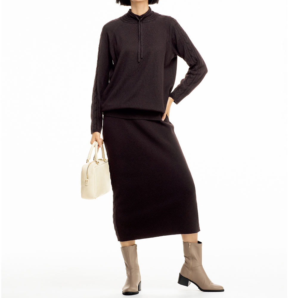 女心までも包み込むラグジュアリーな温もりふっくら軽い上質ウール糸で編み上げた柔らかな着心地。総針編みで美しい着映えを追求しました。両脇には2本取りのケーブル編みを添えて穏やかな表情を加えて。