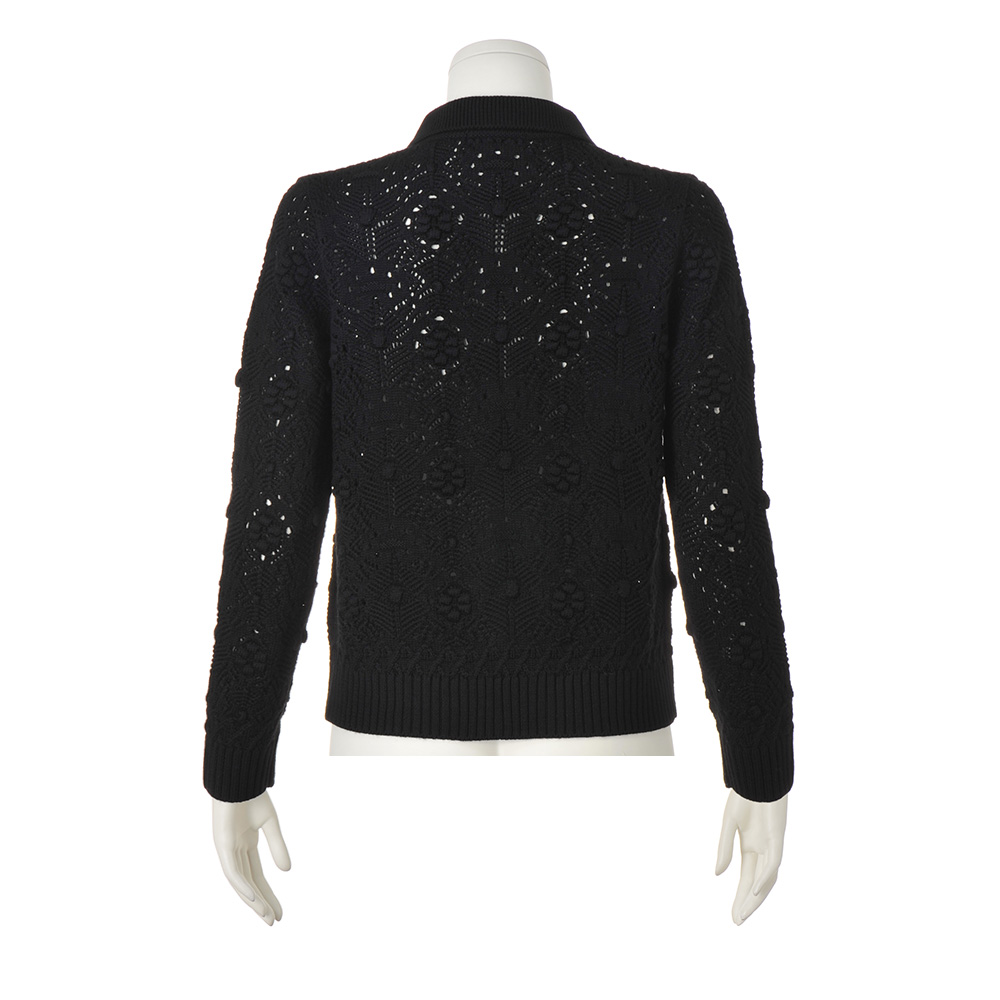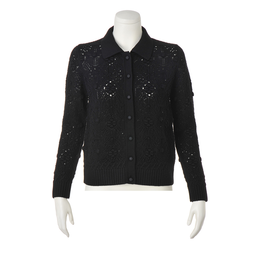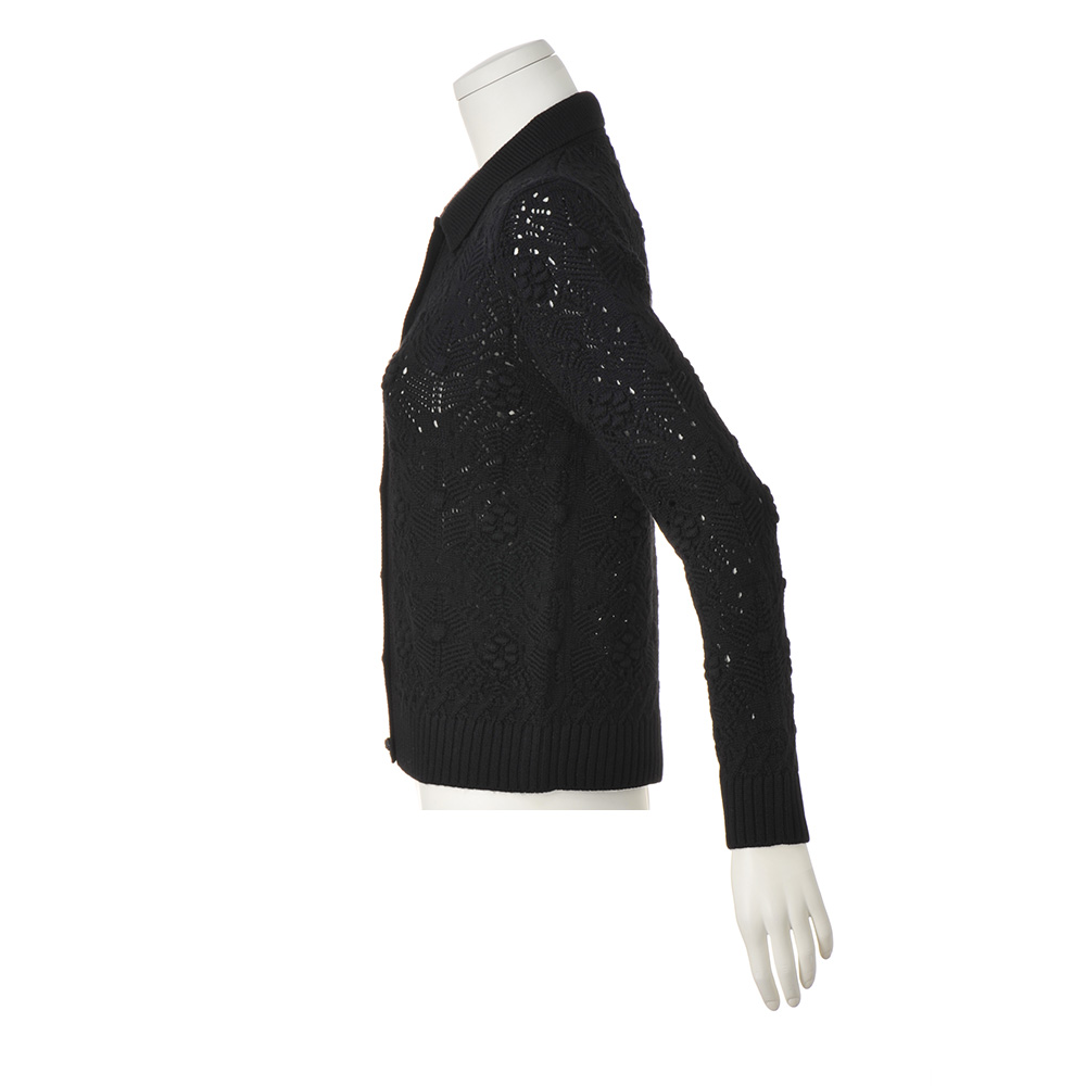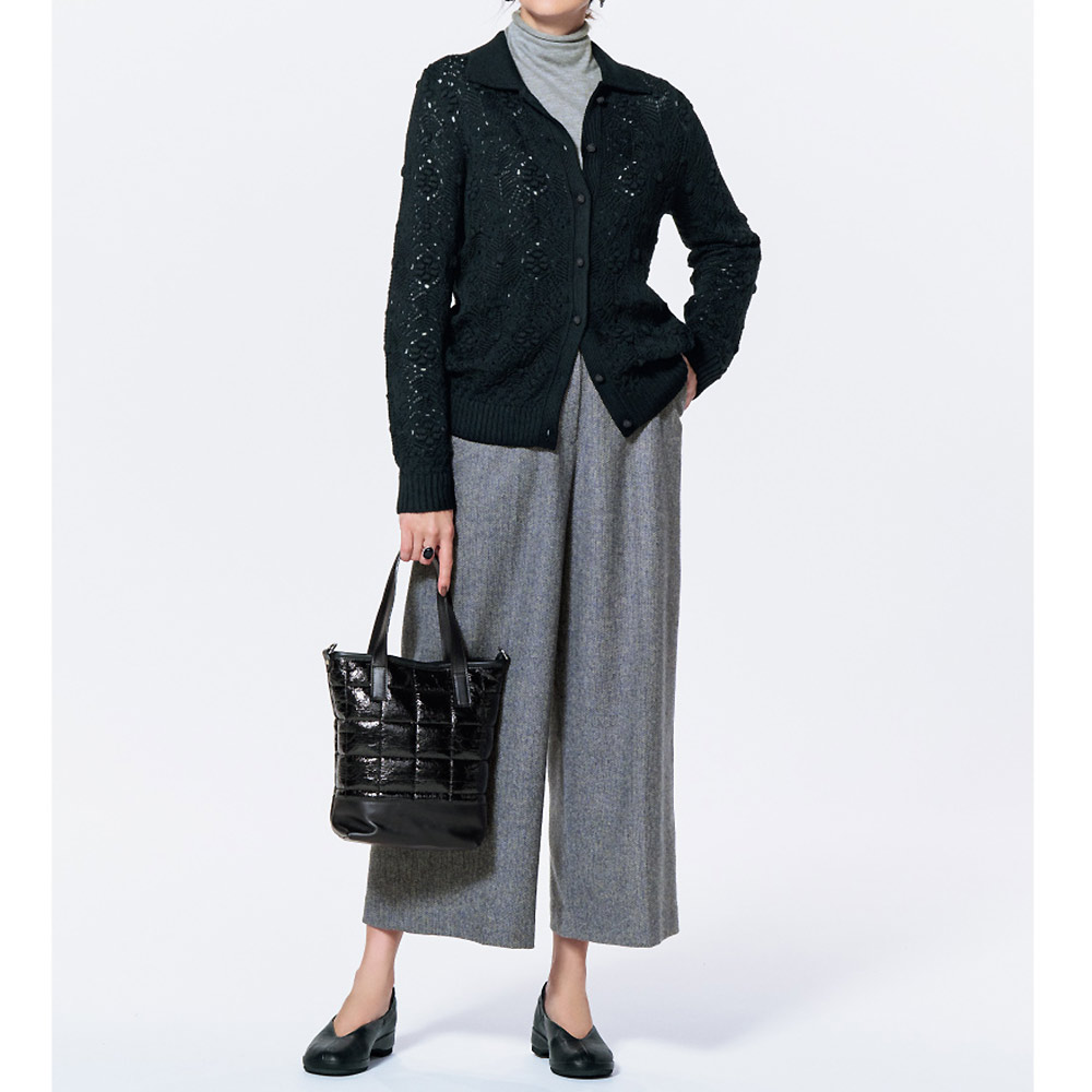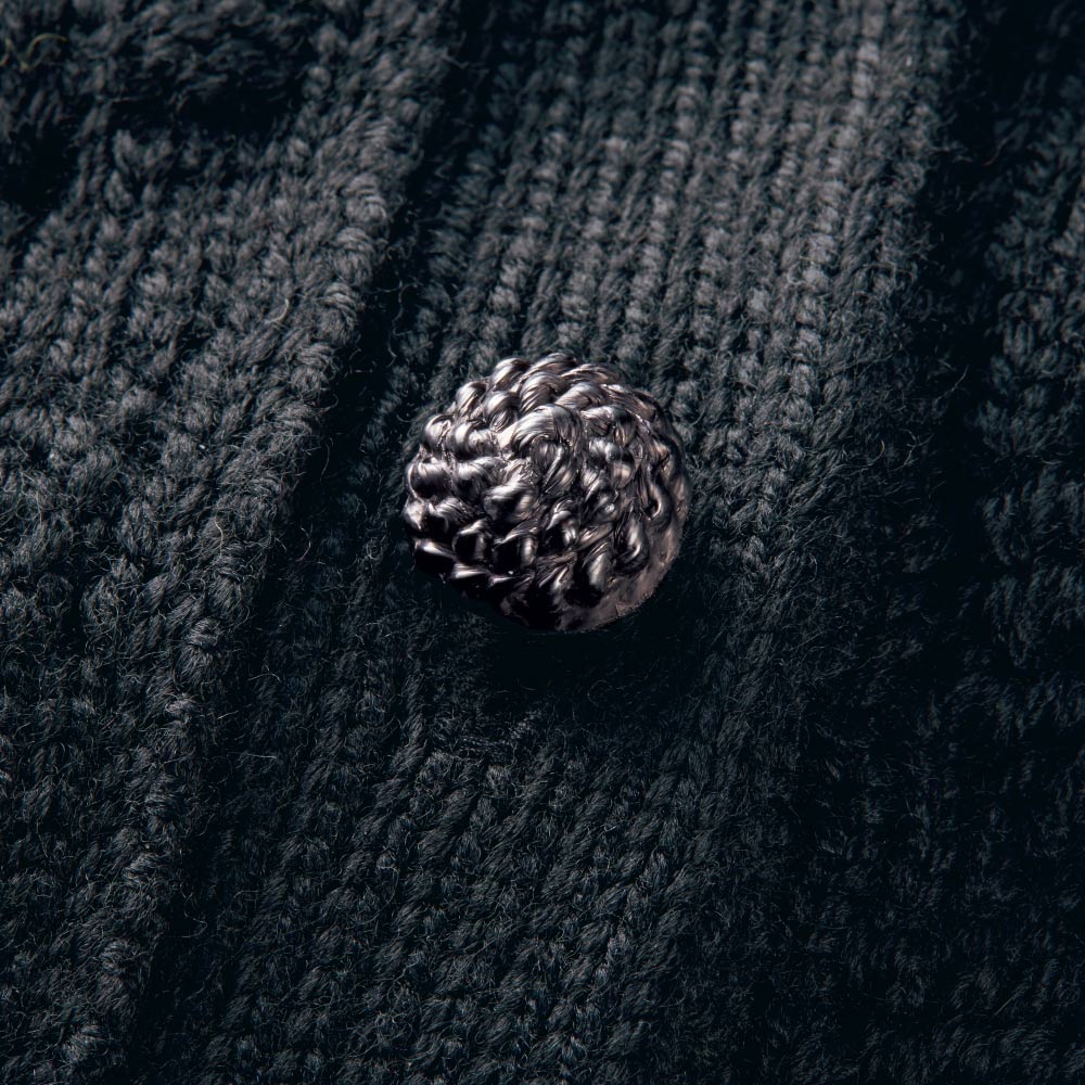 洗練の華やぎアイテムに心躍るローゲージの透かし編み。タック編みやポップコーン編みなど編み地を駆使し、クロシェット風ボタンを並べたリッチなデザイン。