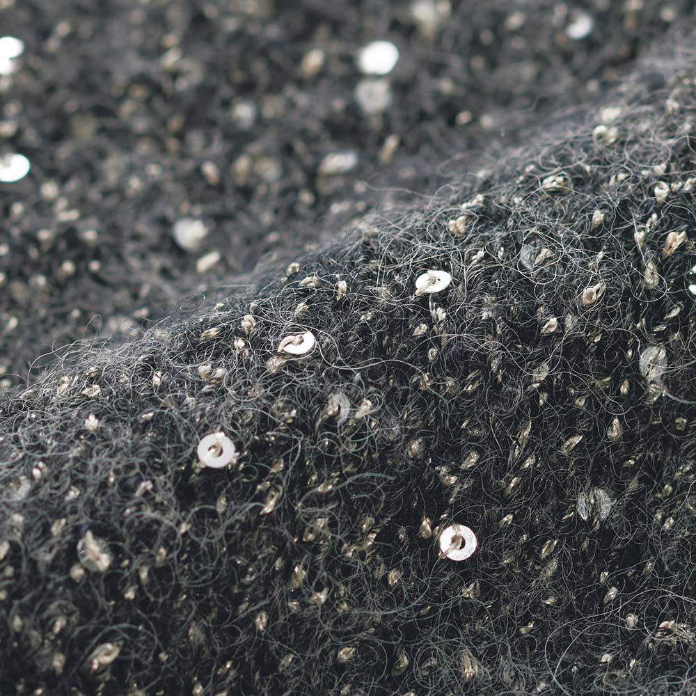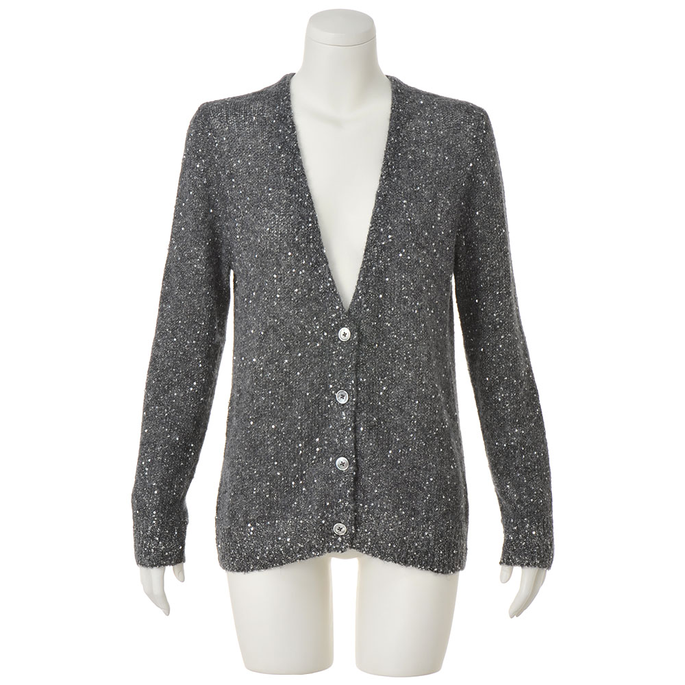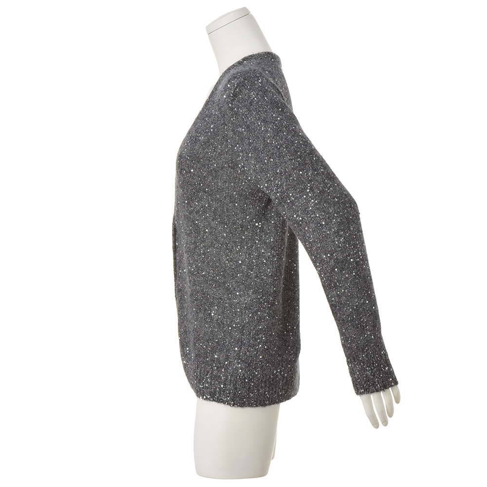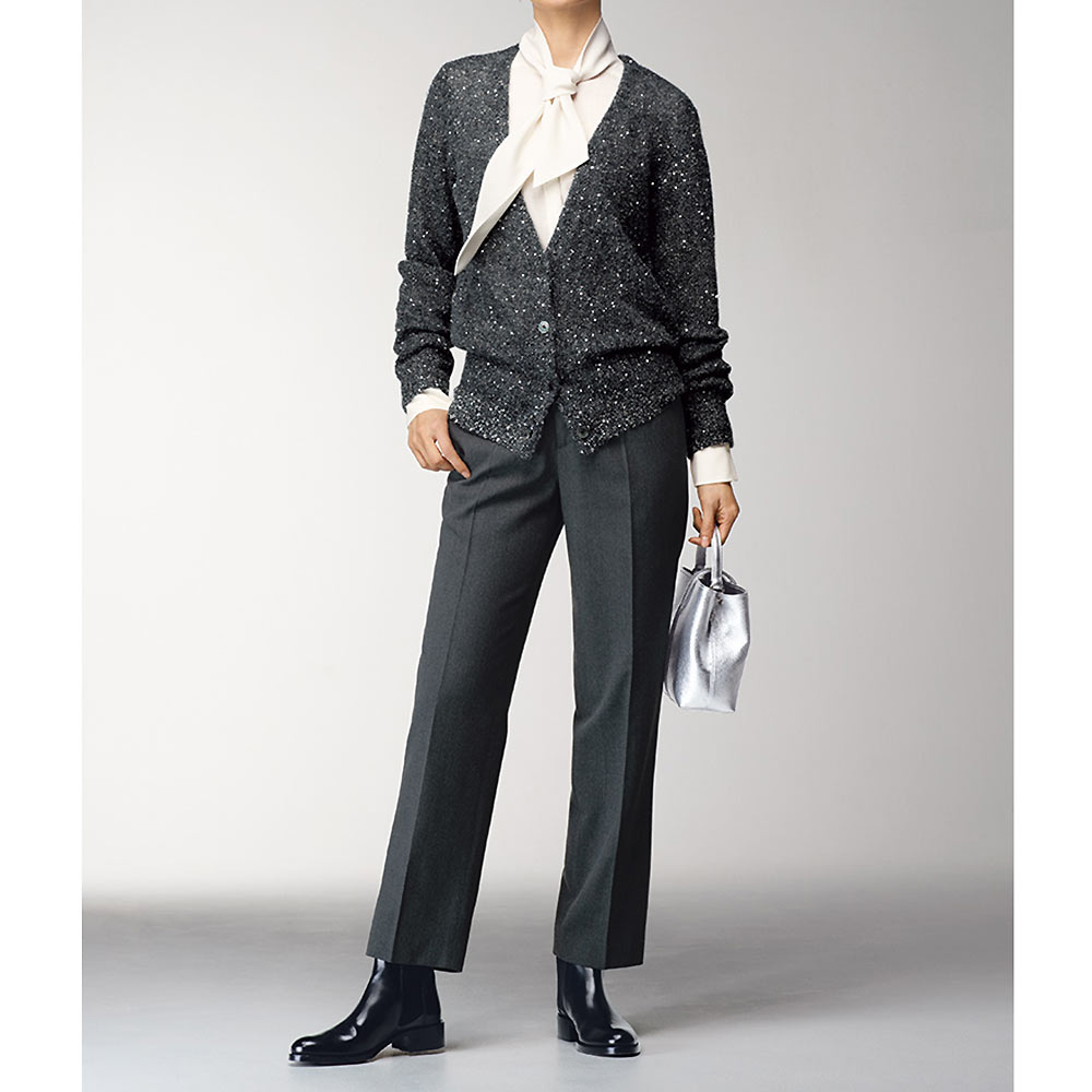 スパンコールも、ニットカーディガンなら日常スタイルに取り入れやすいはず。ウールやアルパカをブレンドしたへアリーな糸にスパンコールを合わせることで主張を抑え、編み地は天竺をあえて裏目使いに。アッシュグレーの深い色みもシルバーの煌めきをシックなニュアンスにしてくれます。