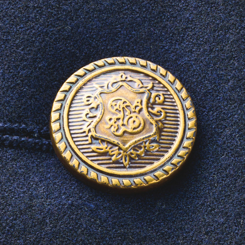 刻印入りのアンティークゴールドのボタンがトラッドな印象。