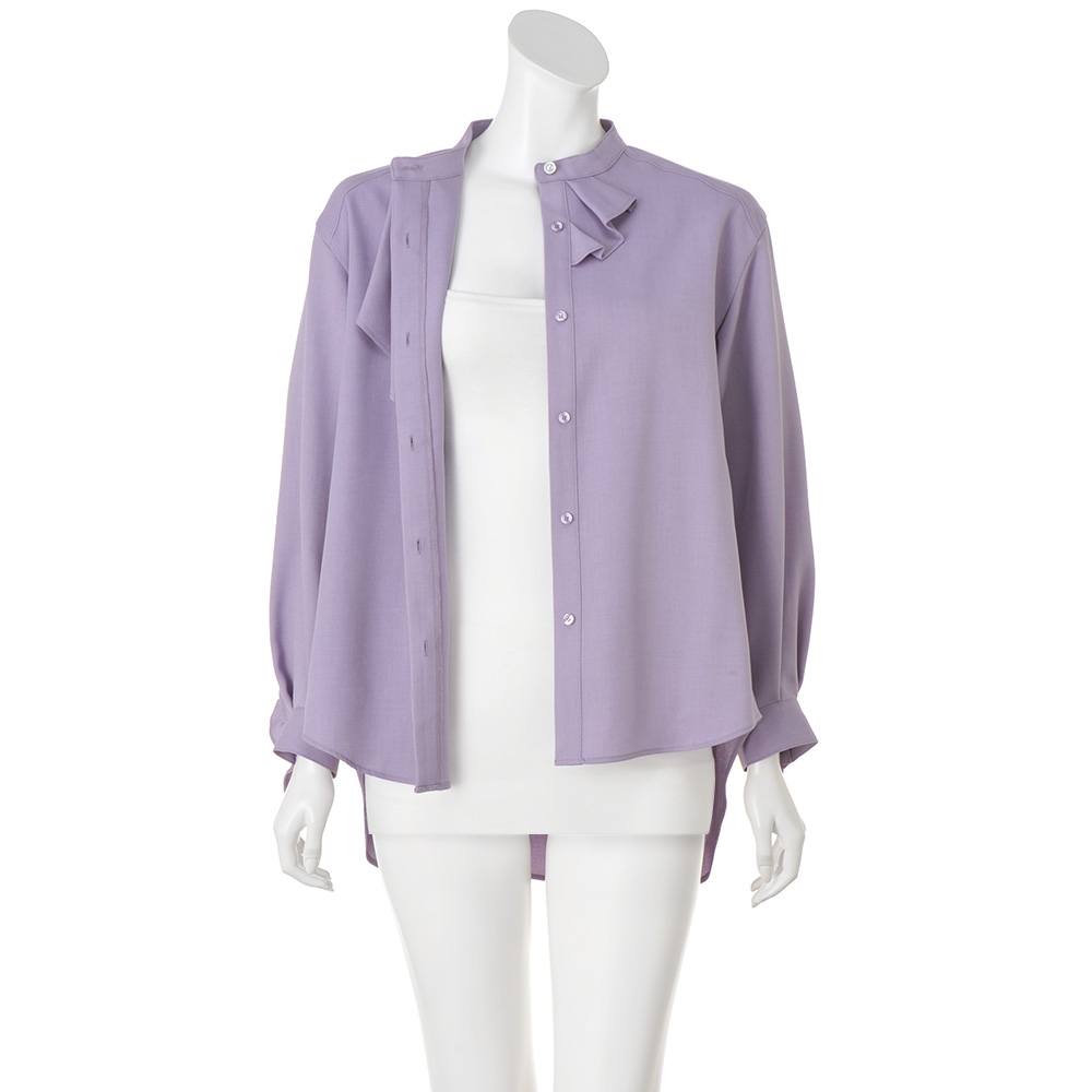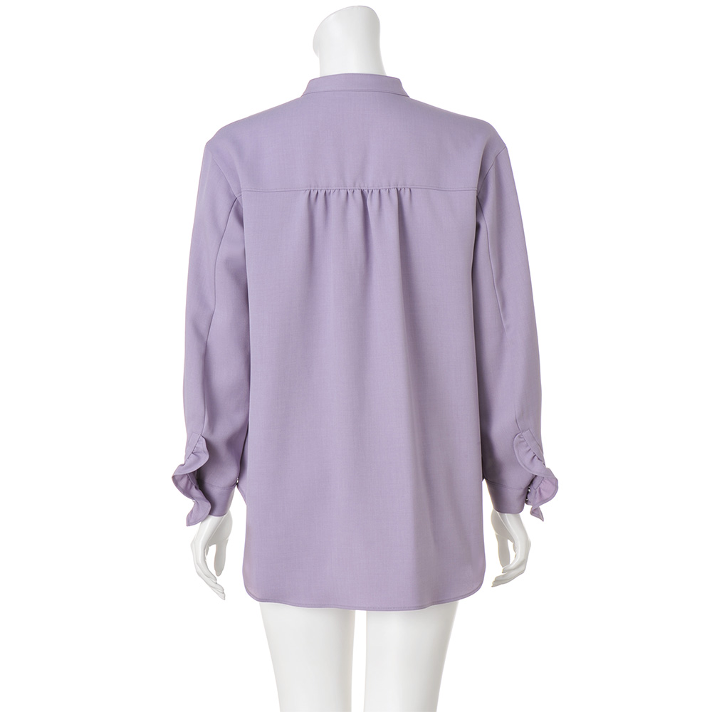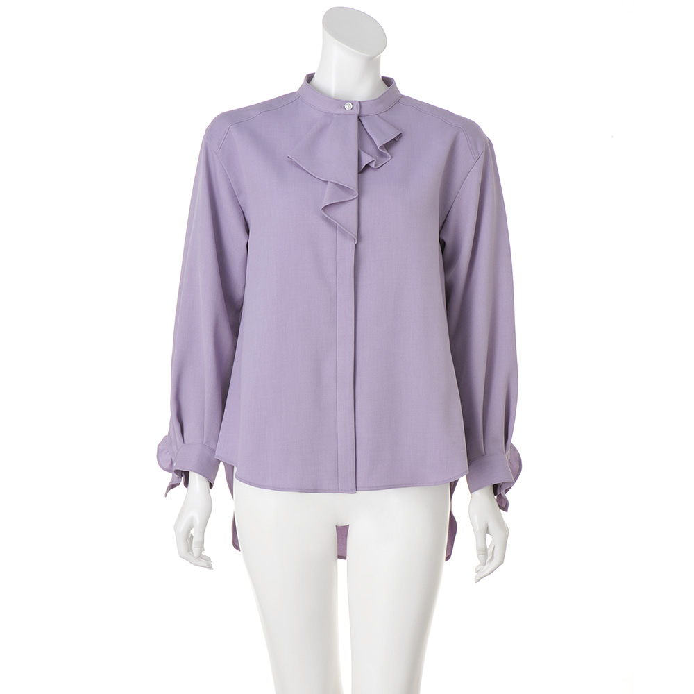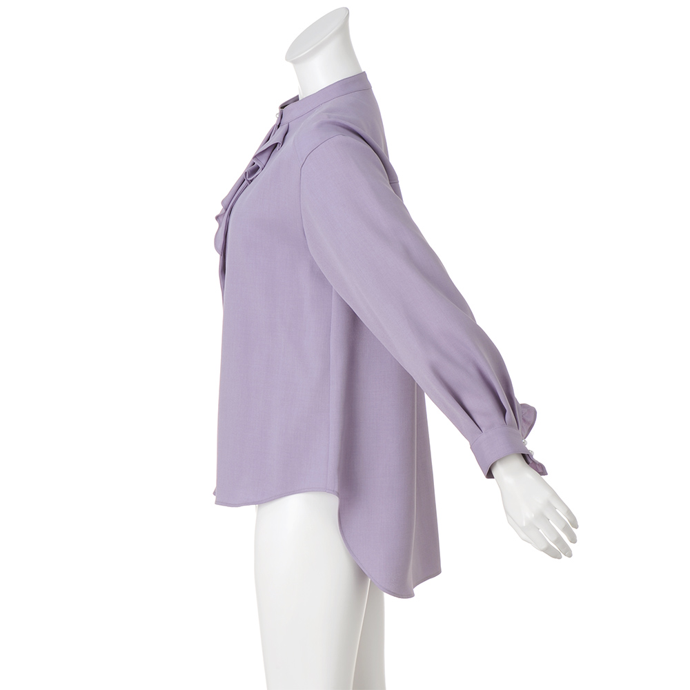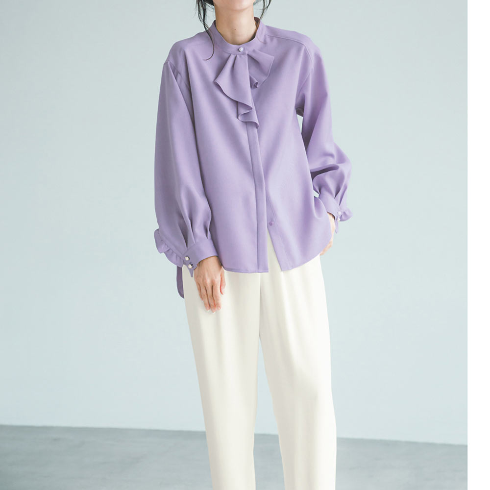 襟元のラッフル風フリルがクラシカルなムードをひと足し襟元や袖口のフリルとパール調ボタンが目を引くブラウス。しっかりとした生地感と落ち着きのあるやさしい色味で上品な印象に。フロントは比翼仕立てですっきりと、後ろの丈は長めで気になる腰回りやお尻をさりげなくカバー。