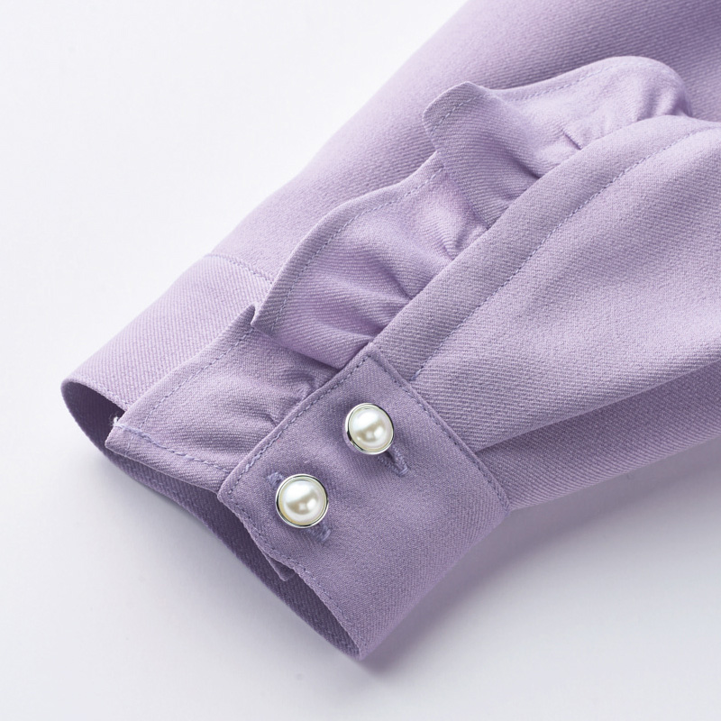 袖口にあしらったフリルとパール調のデザインボタンが、さりげなく華を添える。