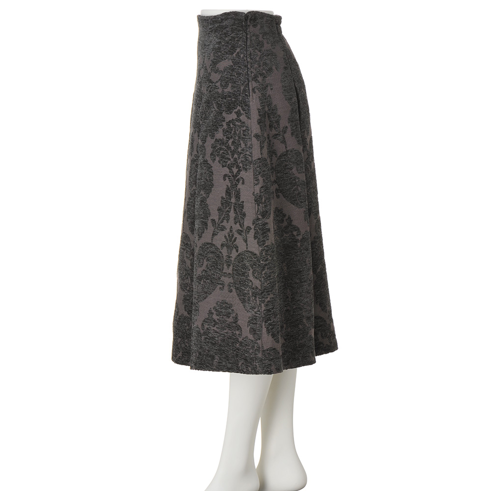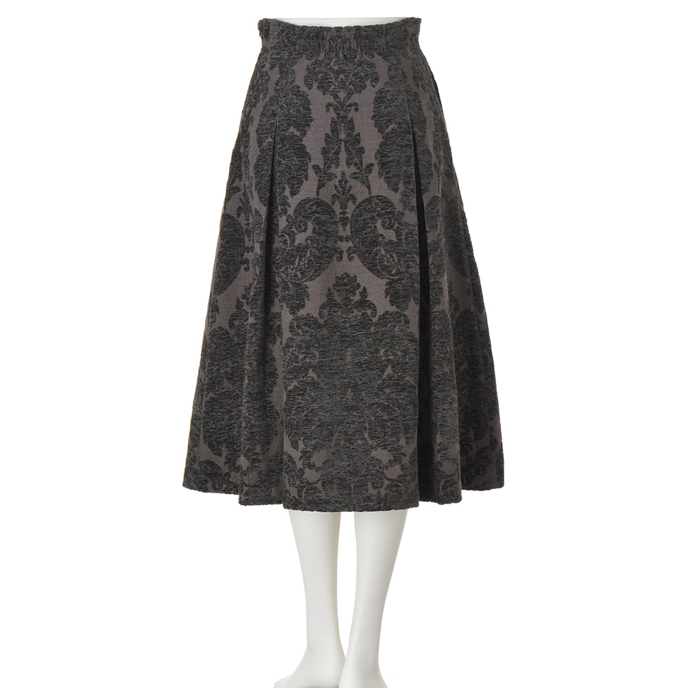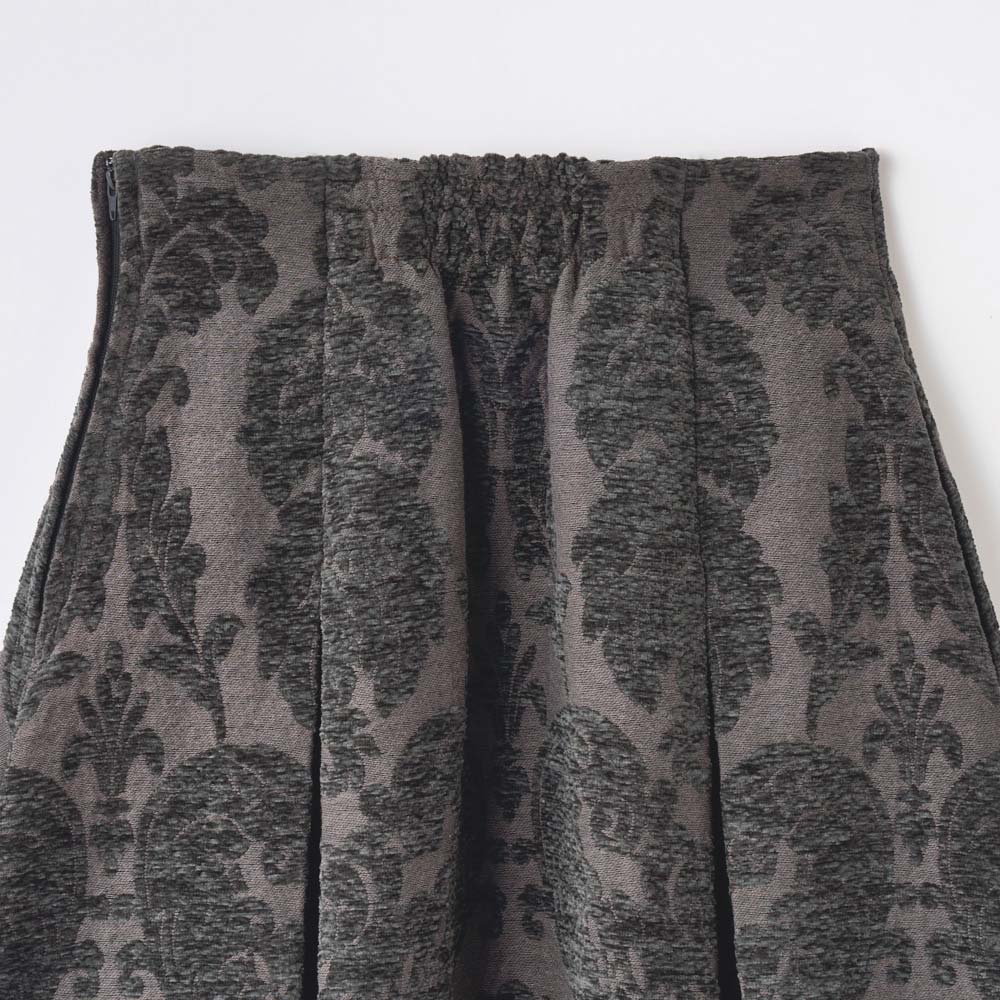 纏うだけで自信が持てる 私を輝かせる毎日服ふくらみのあるモール糸を織り込み、立体的なアラベスク柄を表現したジャカード生地を使用。総柄ながら落ち着いたグレートーンの微配色で、気負わず着られます。大きめにタックを入れ、ドラマティックなフレアシルエットながら、腰まわりはタックを中縫いしてボリュームを抑え、すっきり着られるのも嬉しいポイント。POINTウエストの後ろは、中心に太めのゴムを入れ、楽な着心地。微配色のアラベスク模様が華やかさと落ち着きを両立。