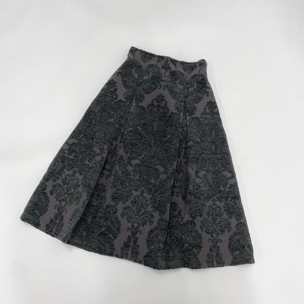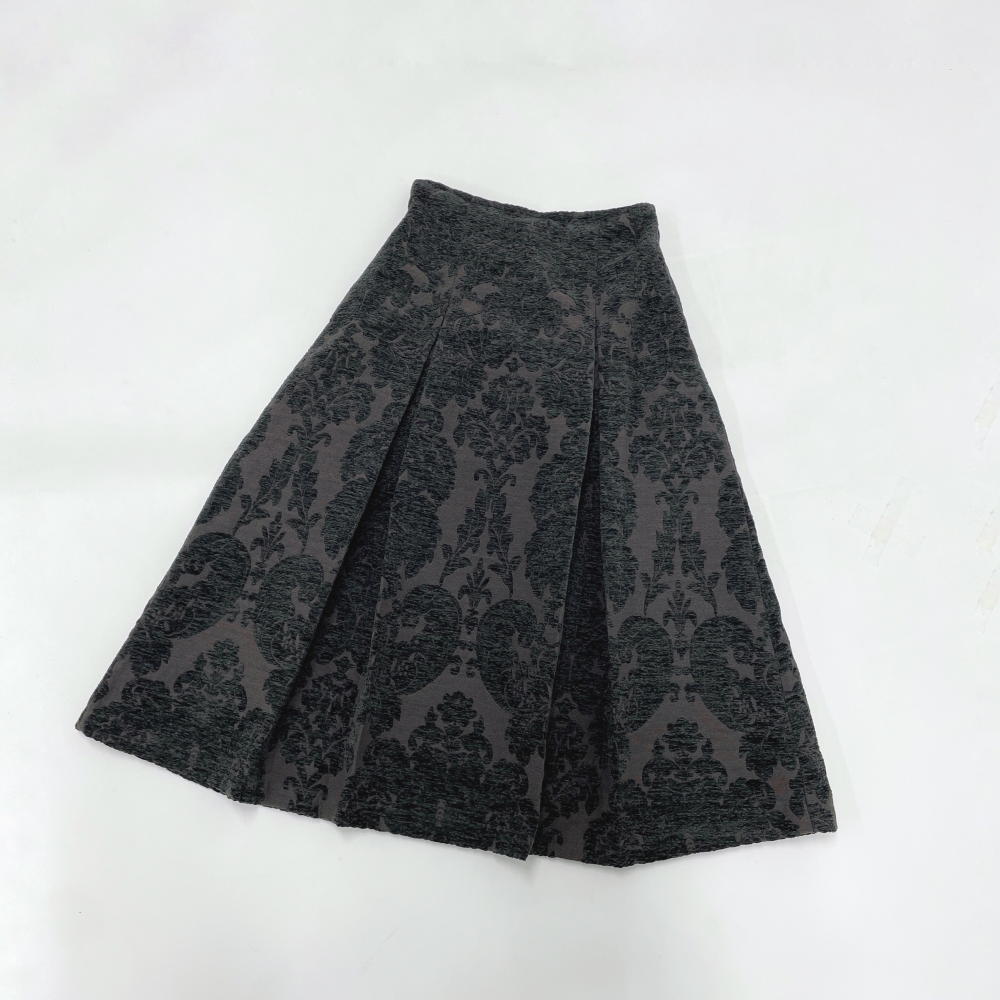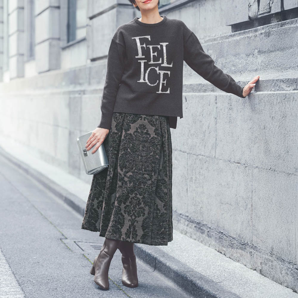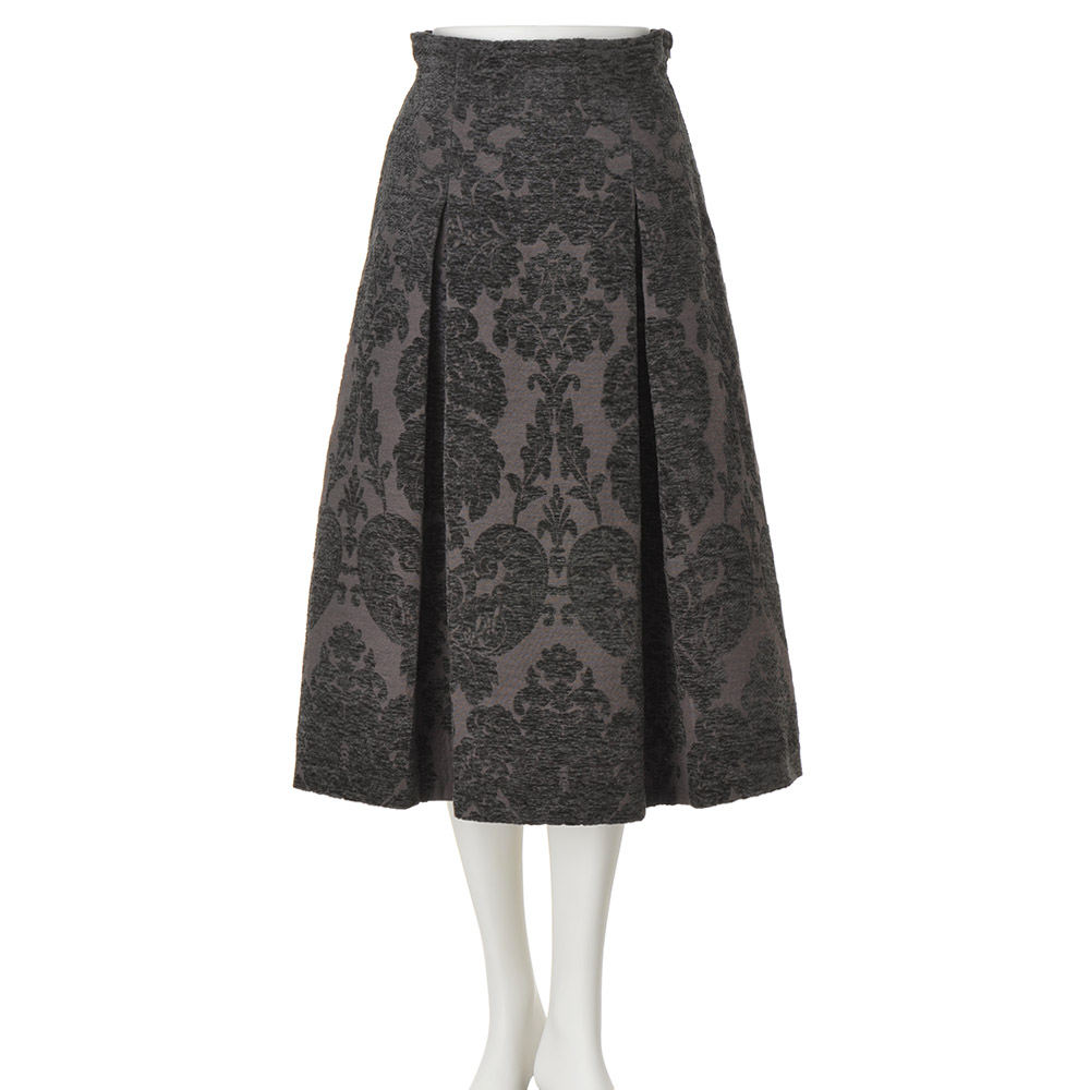 纏うだけで自信が持てる 私を輝かせる毎日服ふくらみのあるモール糸を織り込み、立体的なアラベスク柄を表現したジャカード生地を使用。総柄ながら落ち着いたグレートーンの微配色で、気負わず着られます。大きめにタックを入れ、ドラマティックなフレアシルエットながら、腰まわりはタックを中縫いしてボリュームを抑え、すっきり着られるのも嬉しいポイント。POINTウエストの後ろは、中心に太めのゴムを入れ、楽な着心地。微配色のアラベスク模様が華やかさと落ち着きを両立。