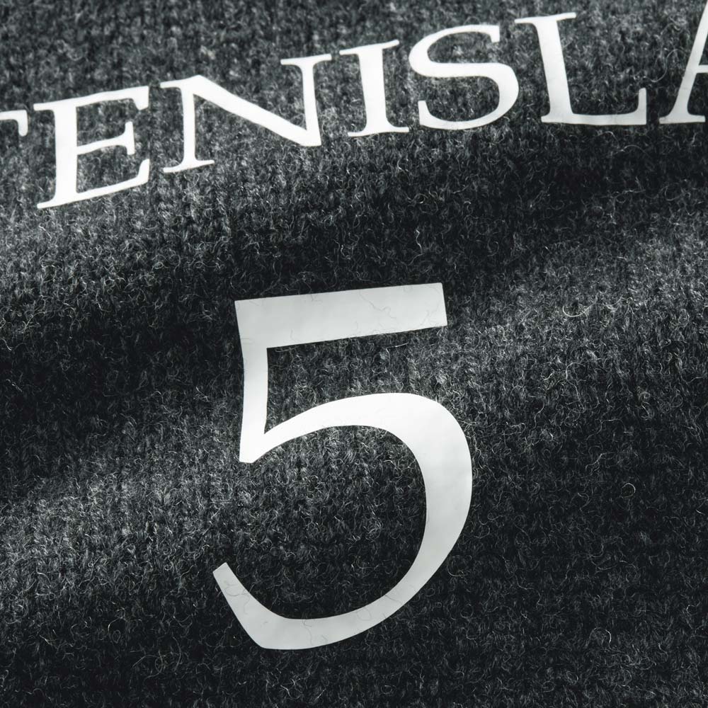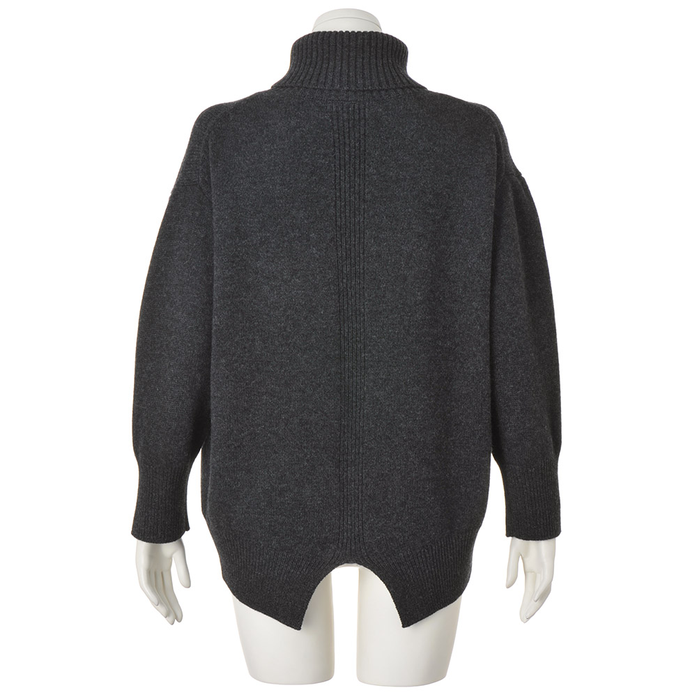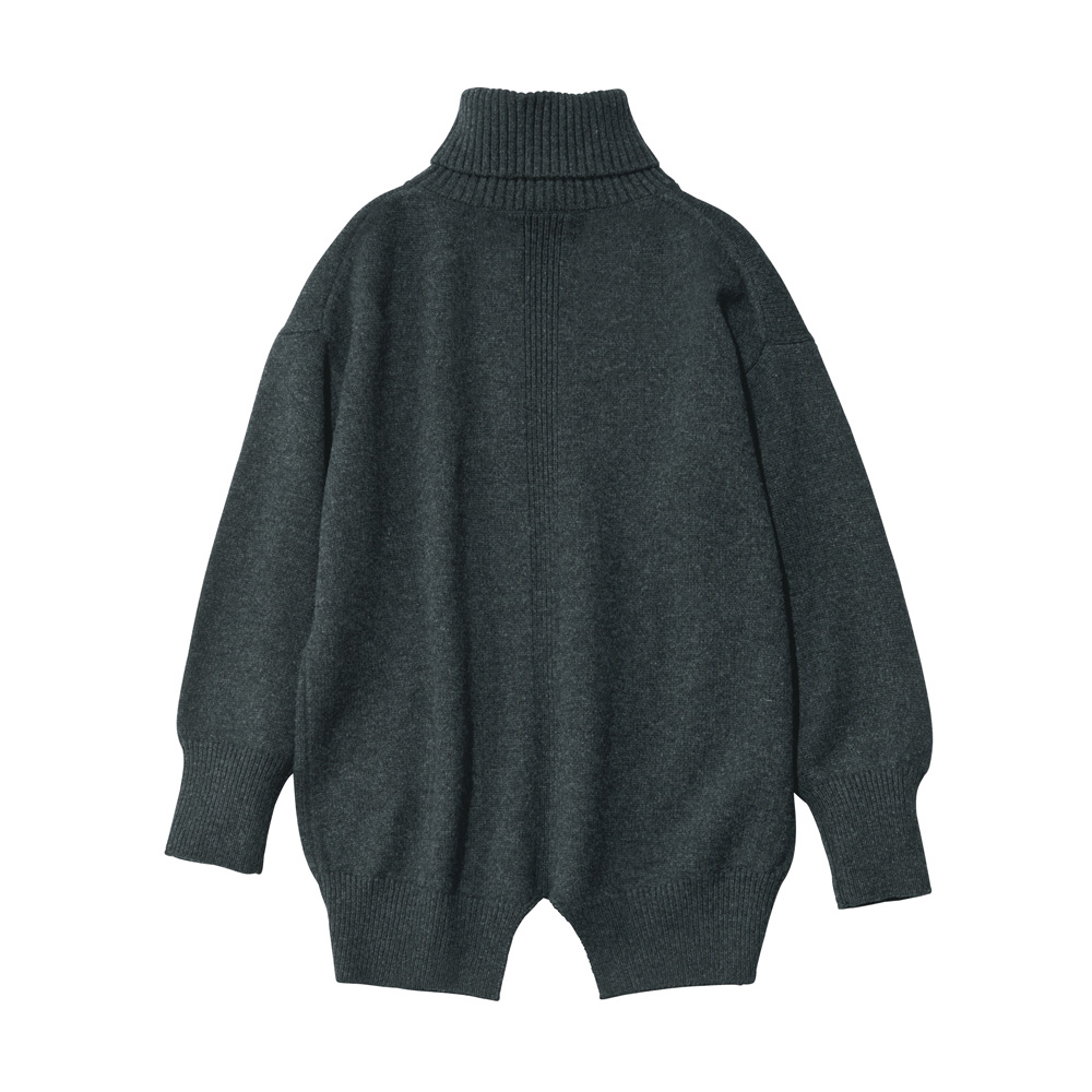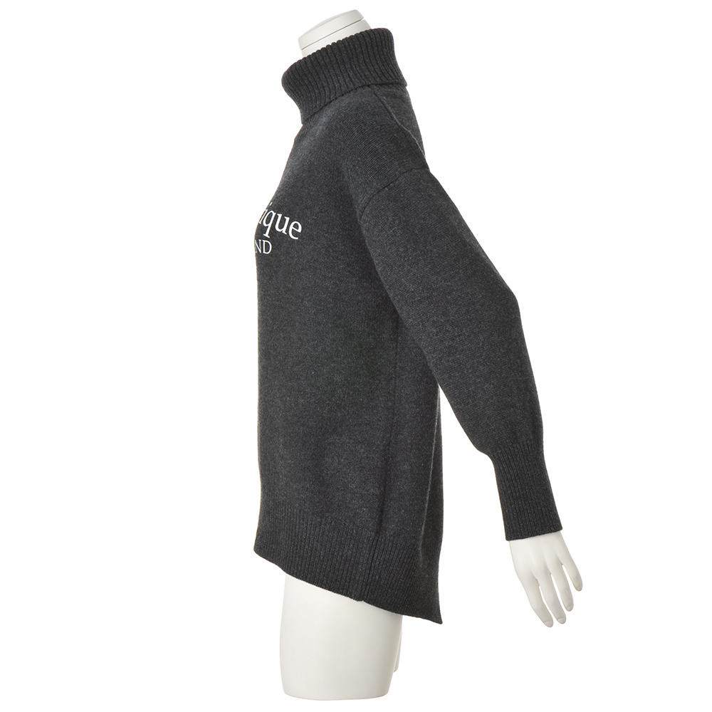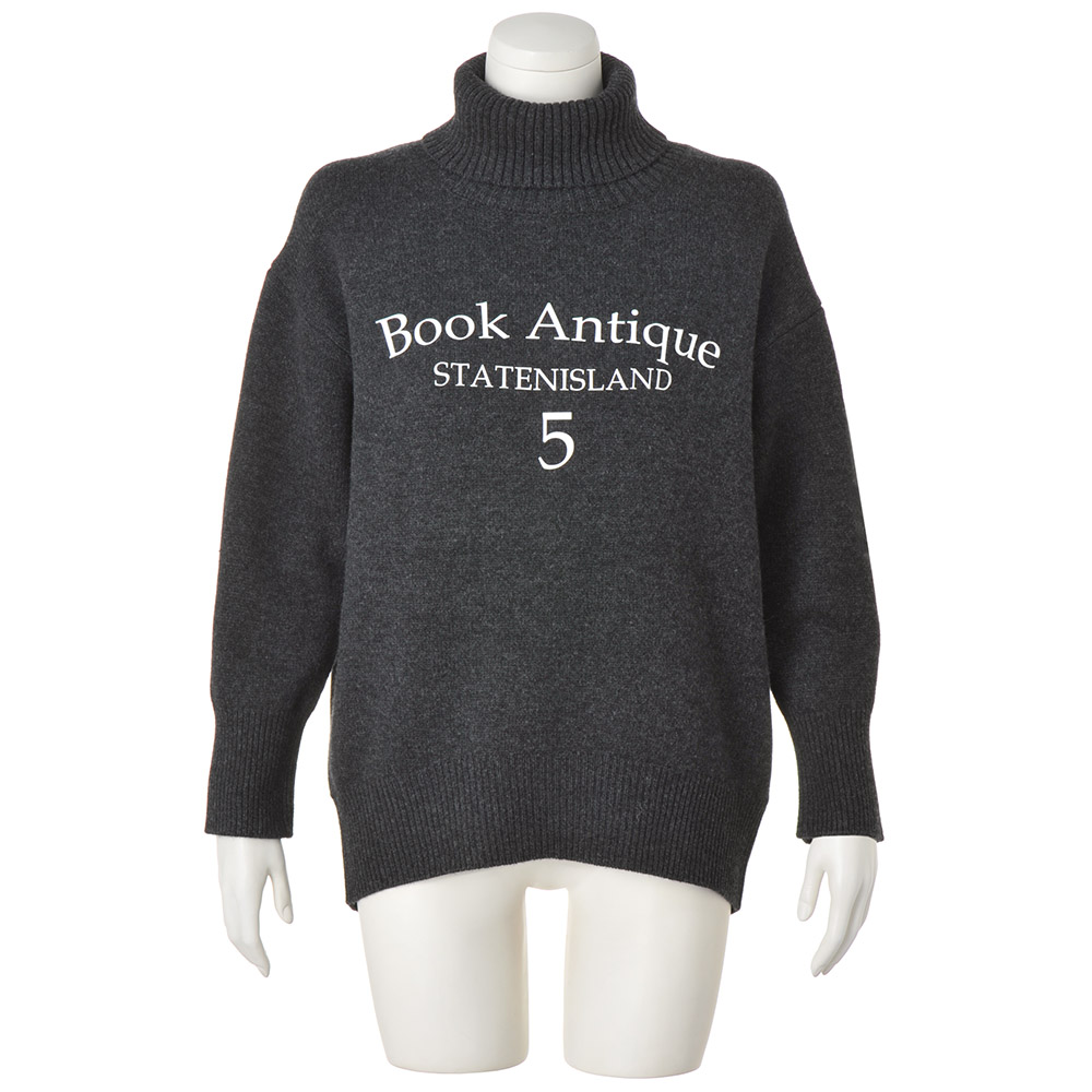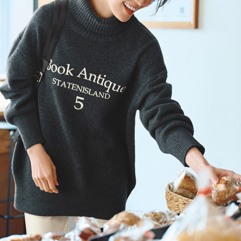 タウン映えを意識した季節のパートナーニットひと目で上質とわかる杢調ウールに、NYの古本屋をイメージしたロゴマークをオン。ラバープリントが洗練されたムードを醸し出すタートルニットが到着しました。ややオーバーサイズの身頃で、後ろにスリットを入れたスワローテイルの裾が印象的。気になるヒップを隠しつつ、軽妙な抜けを添えてくれます。また後ろ中央に走る縦の編み柄も、すっきり見えに一役。