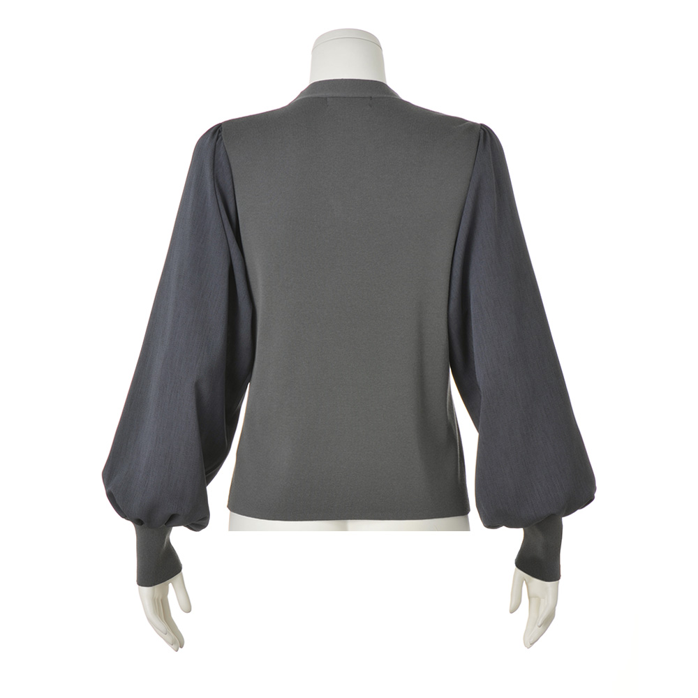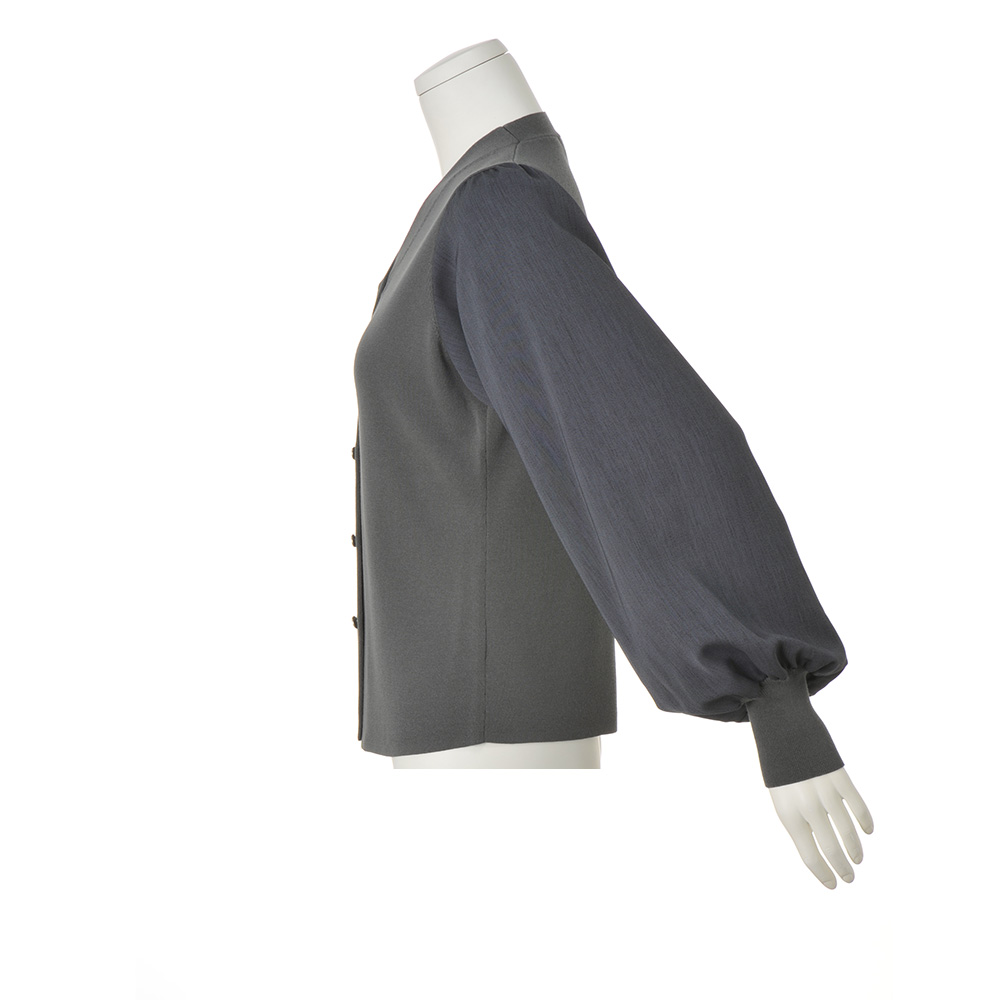 構築的なシルエットでグレーを華麗にソフトコンシャスな身頃とドラマティックな袖の対比――。モードなデザインもシックなグレーなら取り入れやすいでしょう。ニット部分は上品な光沢や滑らかさがあり、毛羽を抑えた編み目の美しさも別格の素材。しっかりとした総針編みで、首元に沿う低めの立ち襟から続くシャープなVネックが品格あるデザインです。デコルテから続く大粒のビジューボタンもクリアな華やかさを添えて。また、ニットで表現できないしなやかさやボリューム感を求め、布帛で切り替えた袖はふんわりと甘やかに。縦方向に美しいムラがある生地でマニッシュなテイストにバランスを調整し、多彩な魅力を湛えた仕上がりに。袖口はニットで長めのカフスを施し、着やすさも意識。