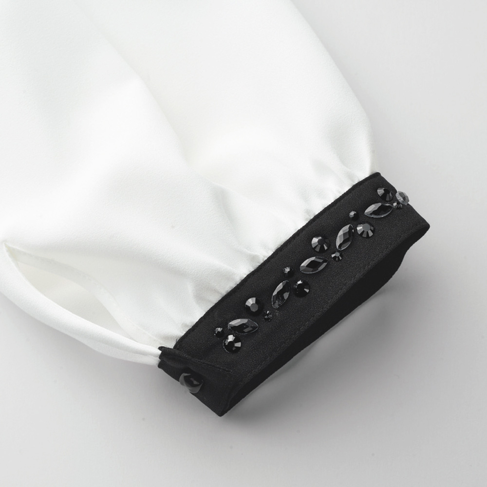 カフスはきゃしゃに見えるよう細めに設定。ブラックがオフホワイトをキリリと締めて。