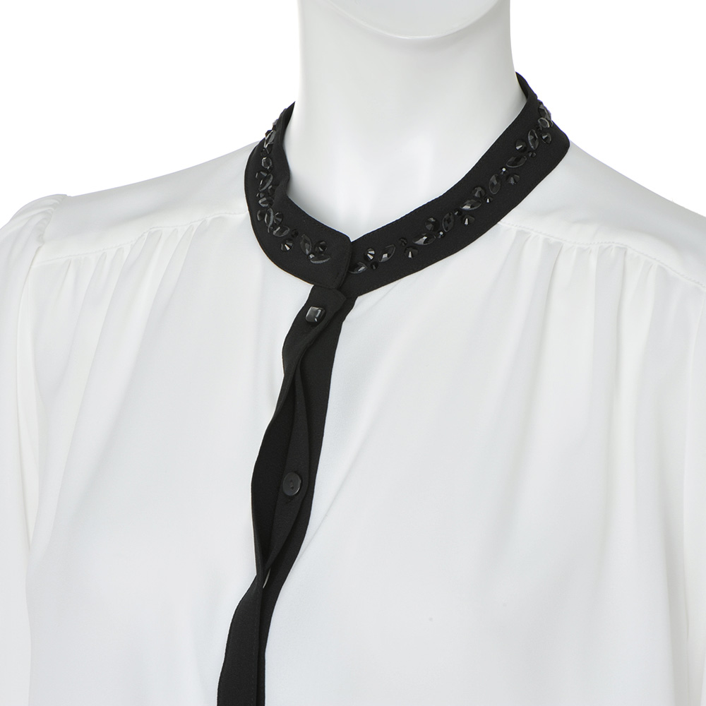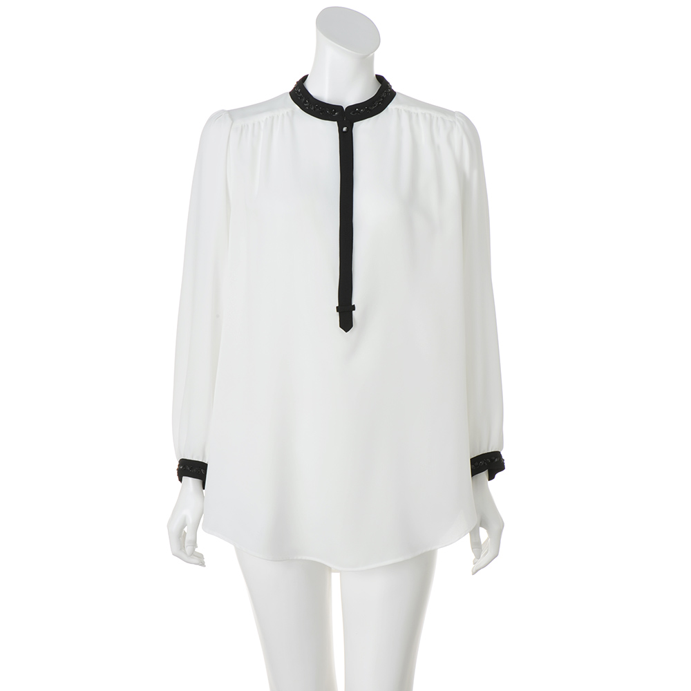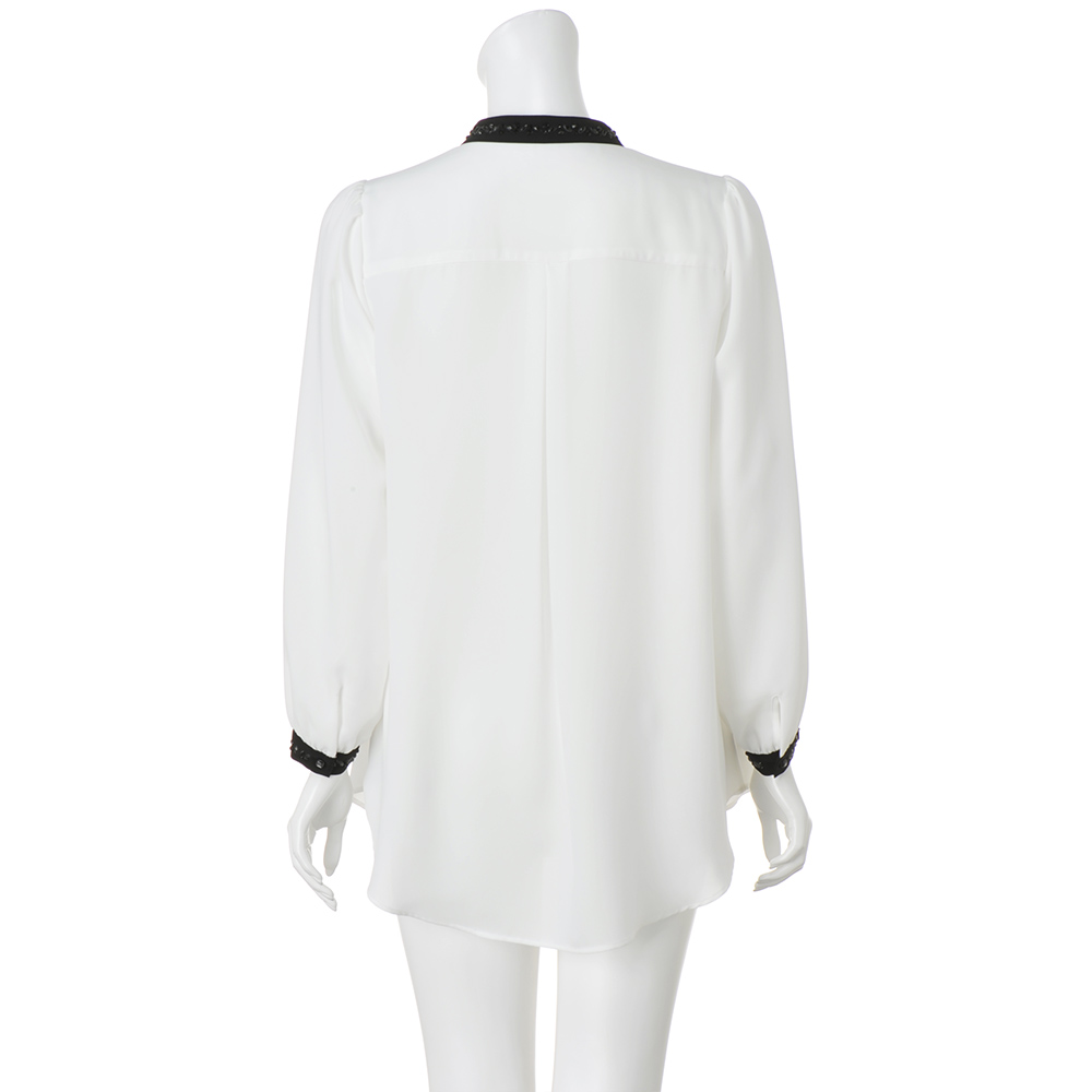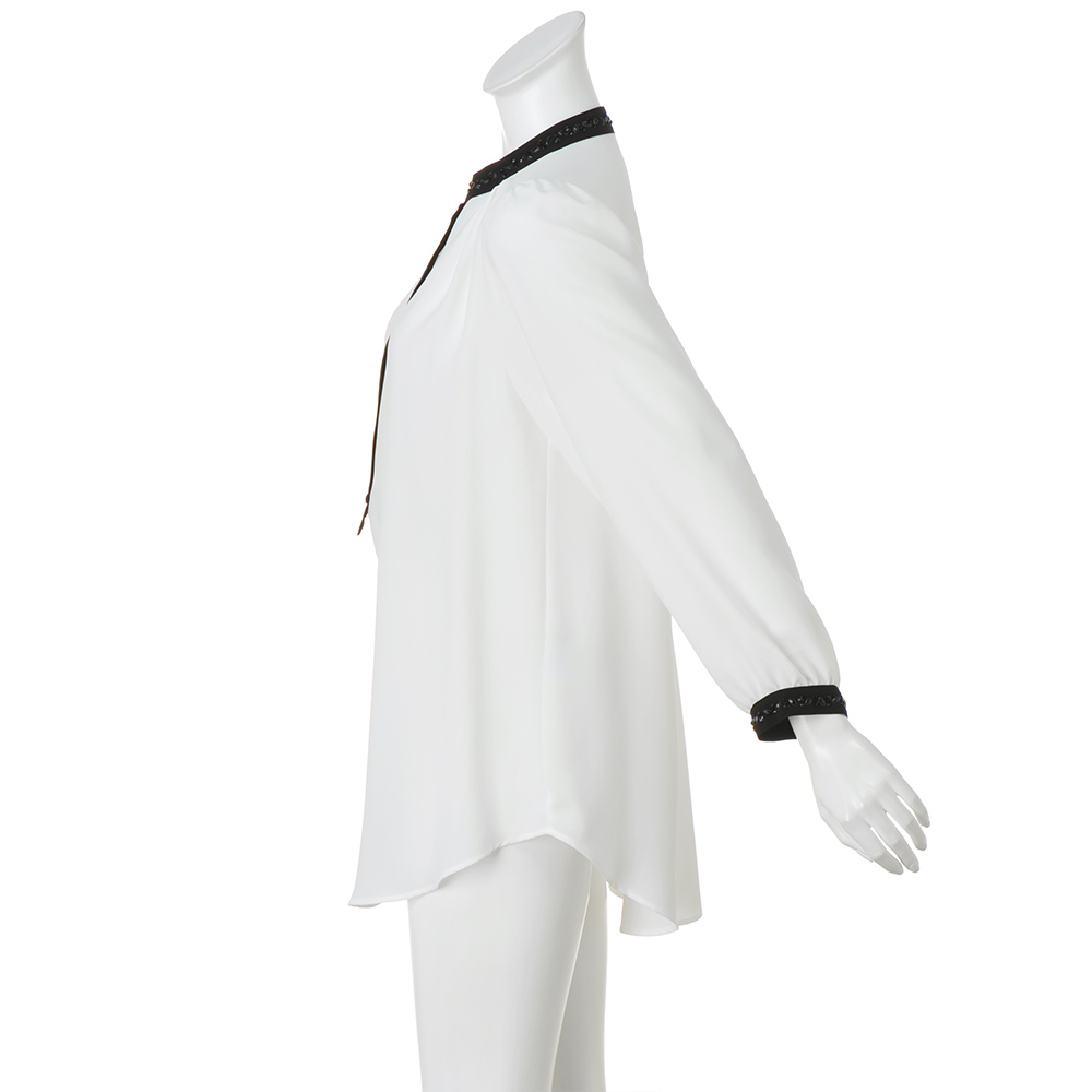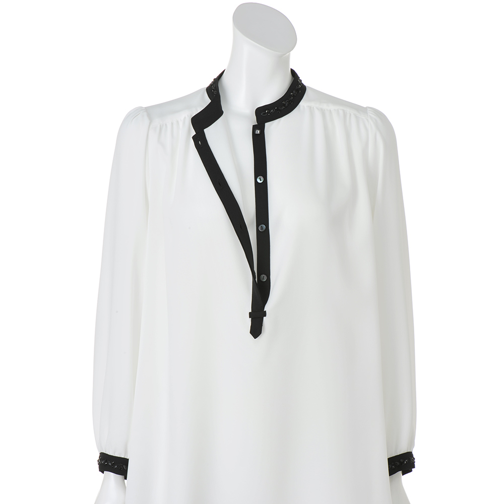 毎日のおしゃれを楽しむ 艶めく華やかスタイルさりげない華やぎを添えて、女性らしい大人の魅力が高まる日常服をご紹介。程よい薄さのジョーゼット生地を使った比翼仕立てのブラウスチュニック。バイカラーの襟と袖口に、生地と同色のビジューを華やかにあしらいました。後ろのヨークとボックスタックが着心地のよさをアップ。ヒップをカバーする長めの着丈もポイントです。