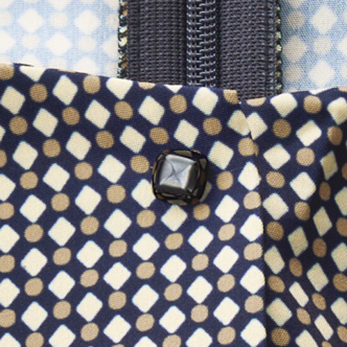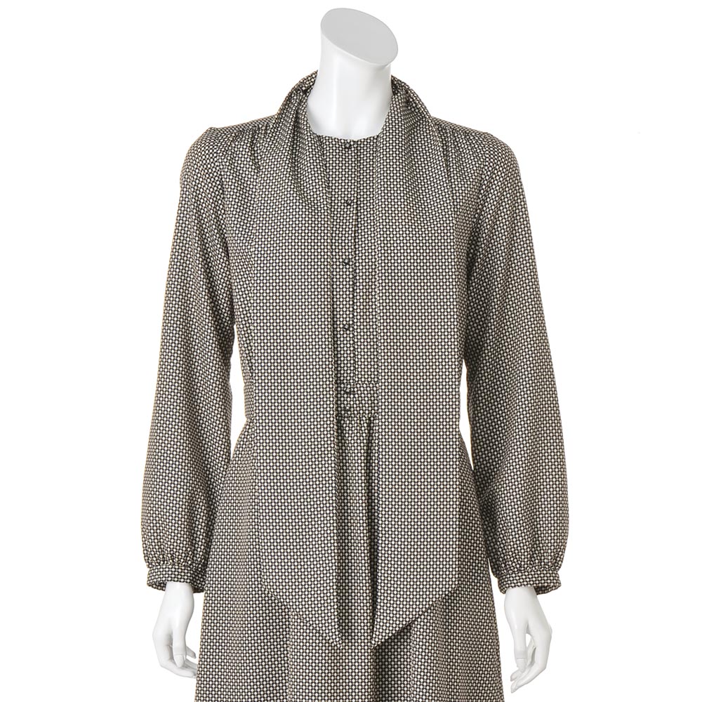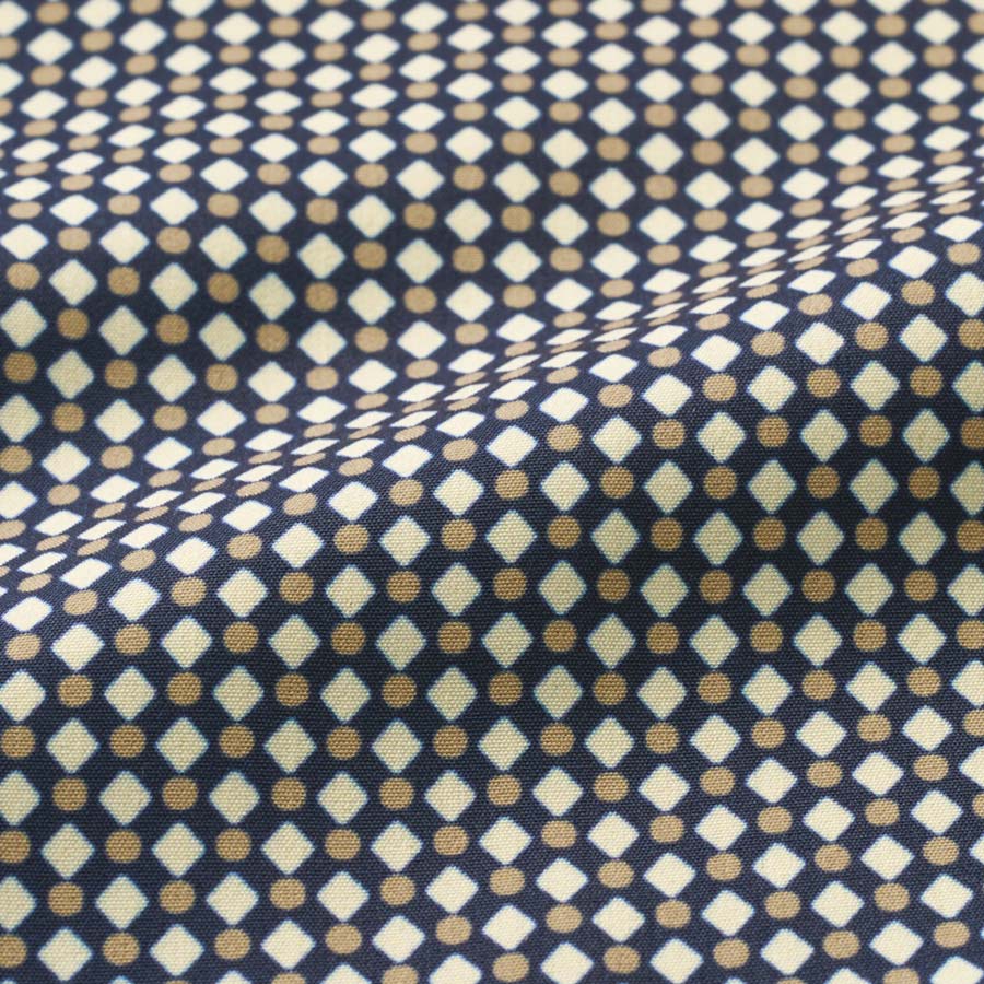 上品な艶のデシン素材に、ネイビーをベースに、ベージュ&アイボリーの幾何学柄をプリント。