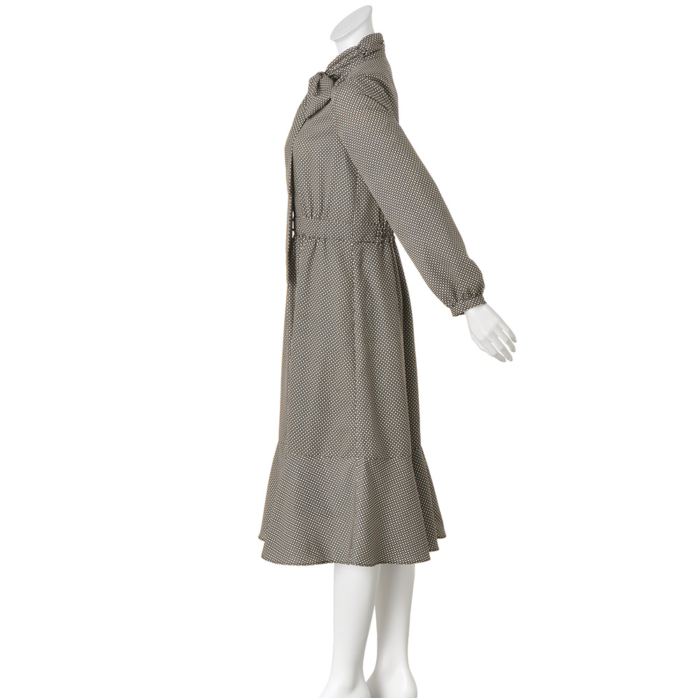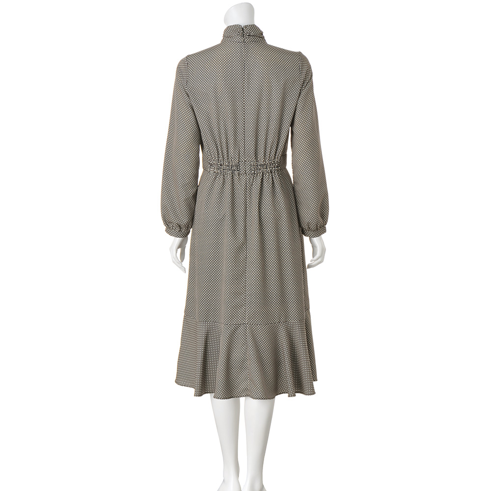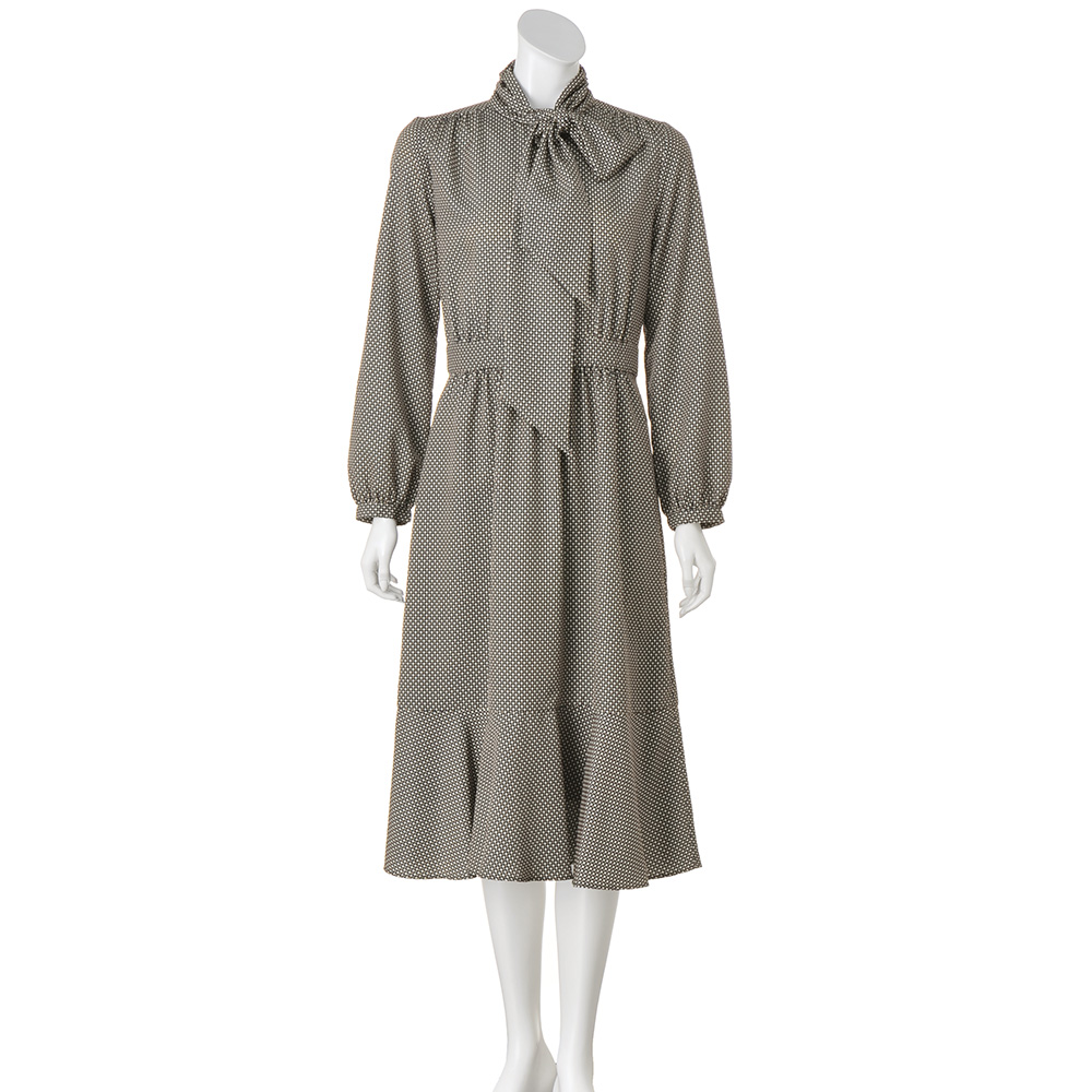 MANNISH LADYマニッシュさをプラスして洗練スタイルに。襟から続くボウタイは結んだり垂らしたりと、表情を変えて楽しめるワンピース。スカート部分の裾に入れた切り替えが、美しいフレアラインを実現。ベルト風に切り替えたウエストの後ろにはゴムギャザーを入れ、細見えと楽な着心地も叶えます。
