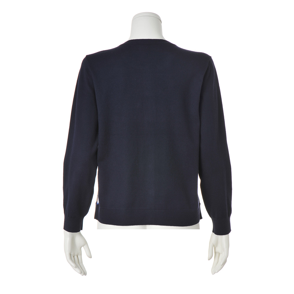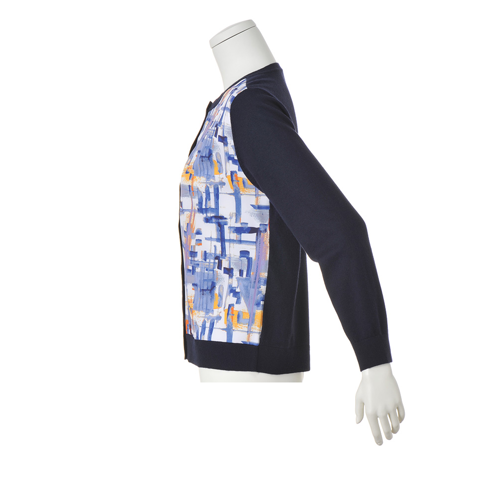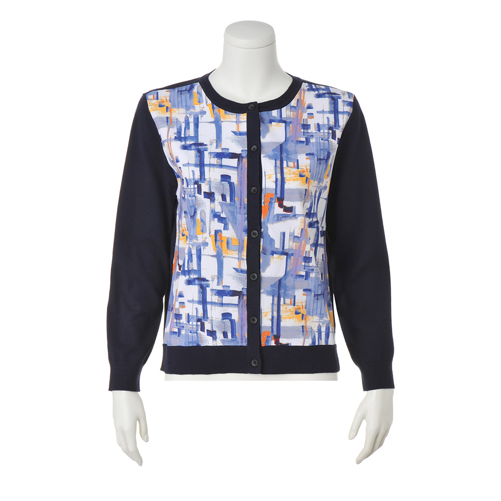 “抽象画モチーフ”上品で落ち着いた印象ながら大胆な色使いと柄が目を引く微光沢のある素材に水彩画風のアートな柄をプリントした生地を、前見頃にドッキングしたニットカーディガン。ベーシックに使えるネイビーを基調に、つかず離れずのシルエットで合わせを選ばず活躍。ボタンの開け閉めで表情が変わるのもポイントです。