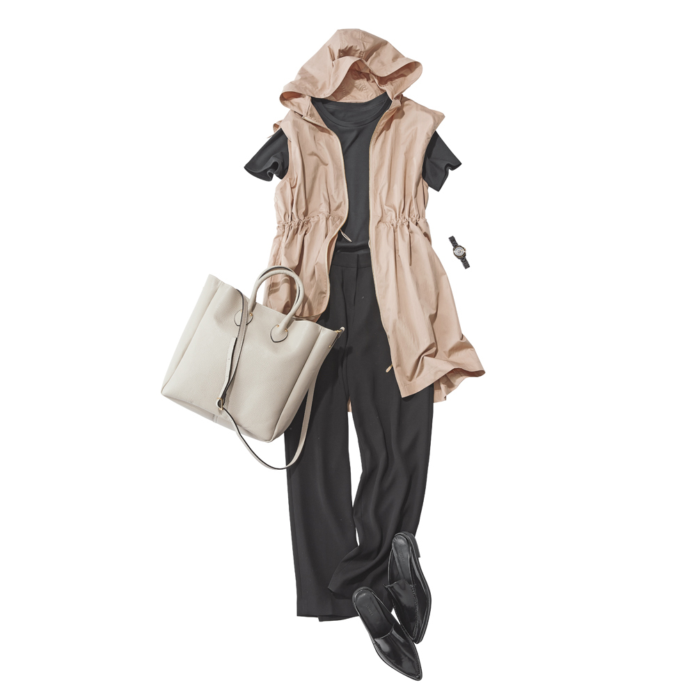 (ア)シャンパンベージュ コーディネート例(ジレで) /Tシャツ×パンツのワンツーコーデをジレが格上げ
