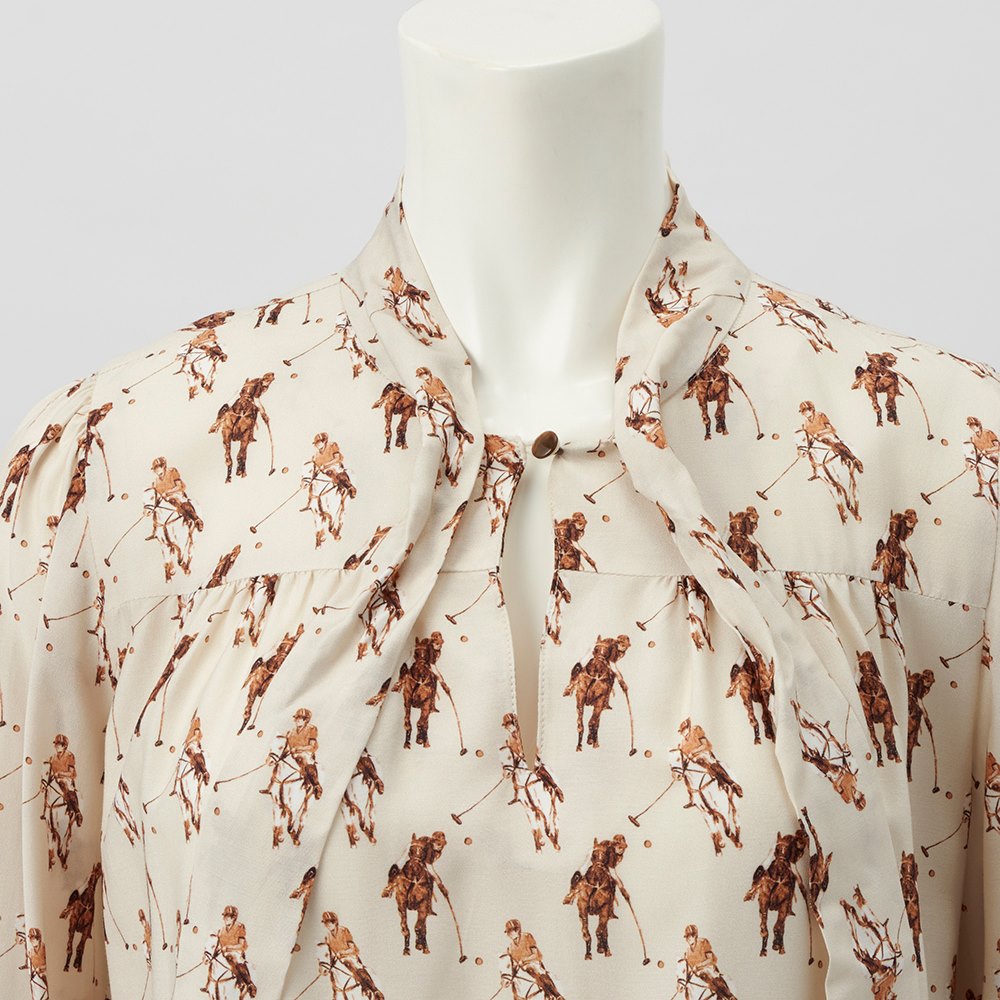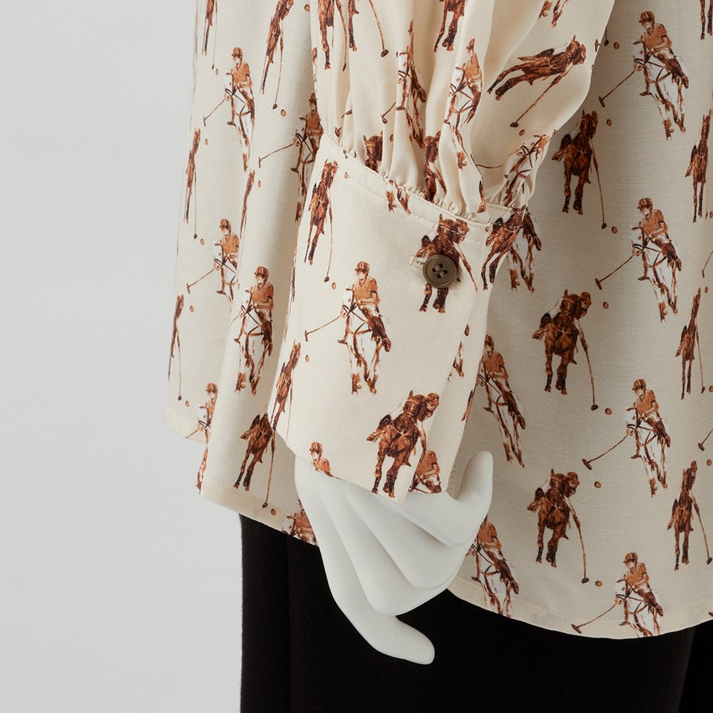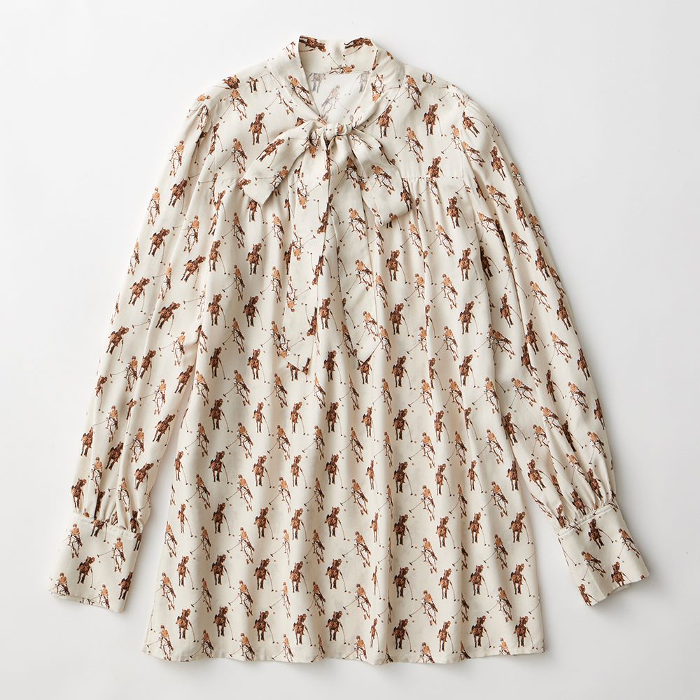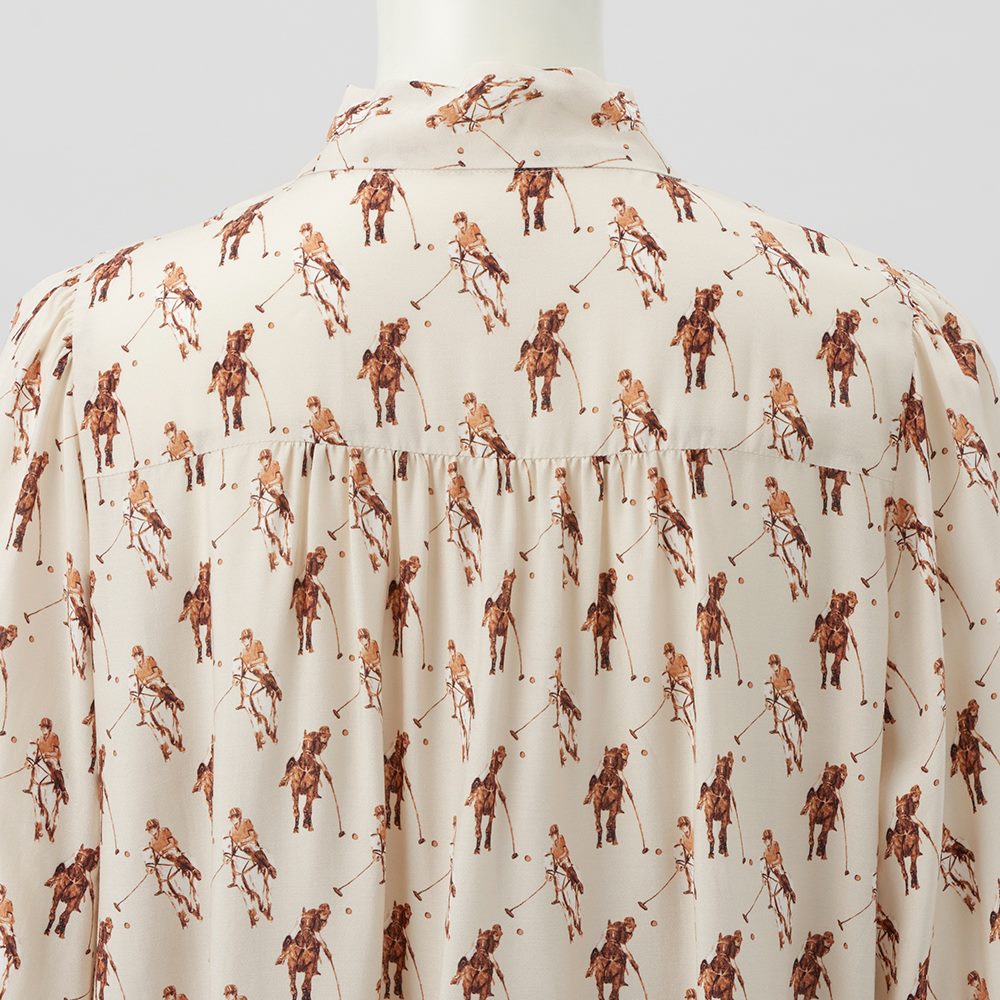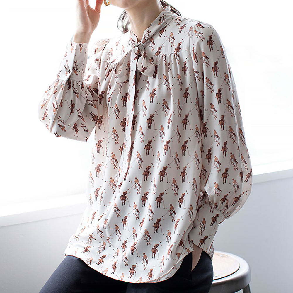 トルコのプリントメーカー「IPEKER(イペカ)」社の素材を使用したブラウスは、伝統あるポロ競技をモチーフとしたプリントがトラッドな印象。リボンのようなボウタイが映えるデザインです。セットインのたっぷりとしたパフスリーブは、そのままではもちろん、たくし上げて腕に留まり、カフスを折ると六分袖にもなる優れもの。身頃は前と後ろにヨーク切り替えで少しギャザーを入れて、たっぷりとした分量感が魅力です。両脇裾には小さなスリットを入れているので、インしなくても動きが生まれます。【IPEKER(イペカ)社】創業100年以上のトルコの老舗プリントメーカー。長い歴史の中で培われた技術に加え、織り・プリント・生産まで一貫工程の為安定した品質を保っています。またプリント溶剤や、汚水の削減加工時に出る廃液を利用した自家発電設備など、サスティナブルで環境にも配慮しています。特別な技術でソフトで軽やかに仕上げた生地の風合いを是非お楽しみください。