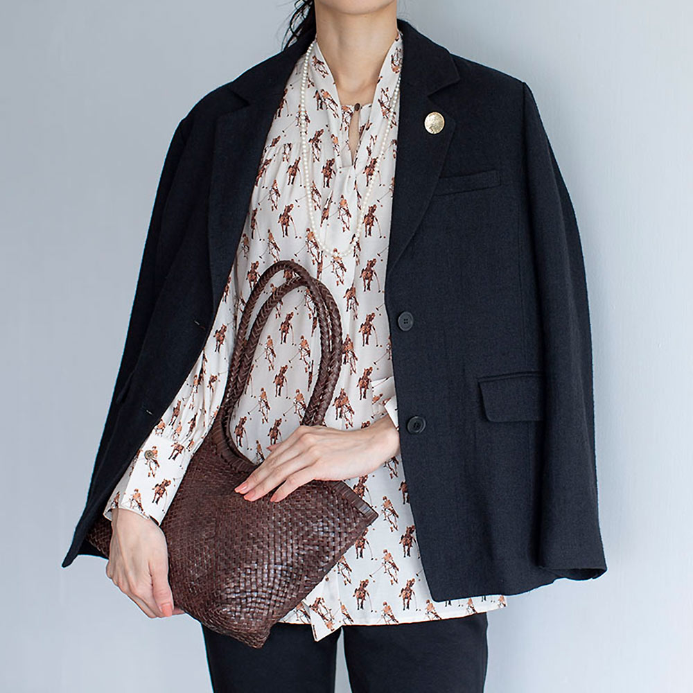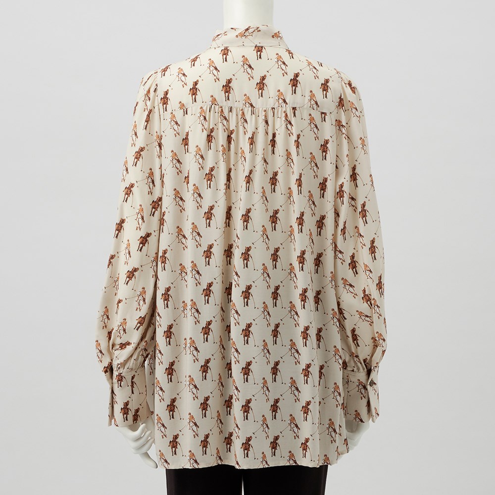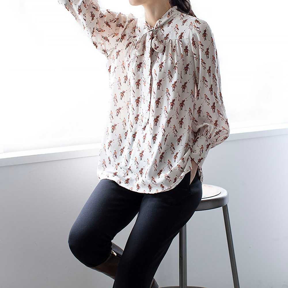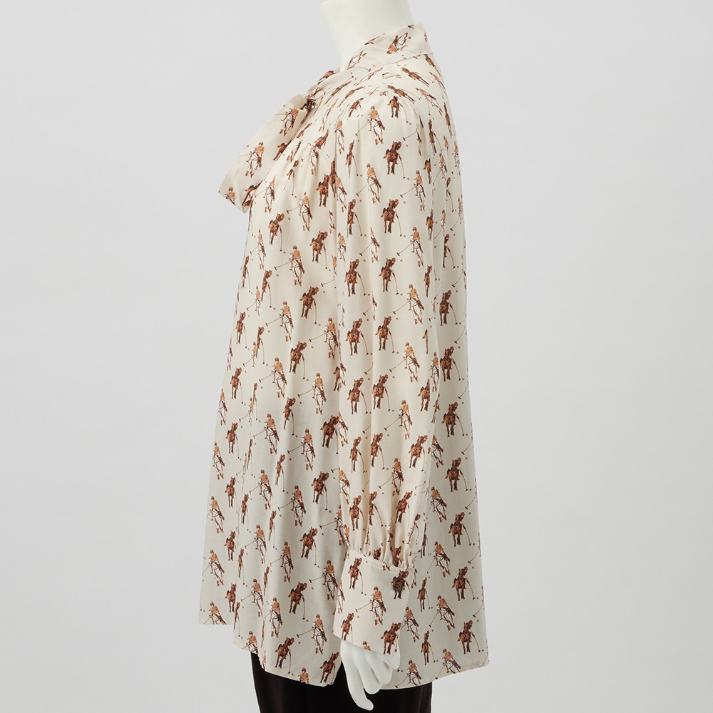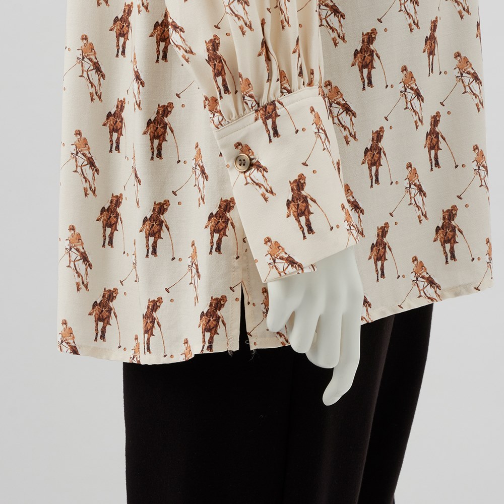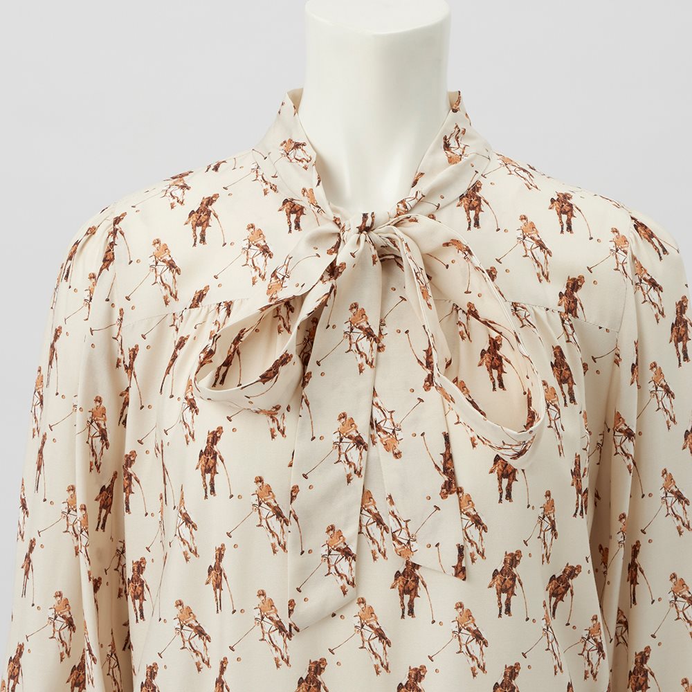 トルコのプリントメーカー「IPEKER(イペカ)」社の素材を使用したブラウスは、伝統あるポロ競技をモチーフとしたプリントがトラッドな印象。リボンのようなボウタイが映えるデザインです。セットインのたっぷりとしたパフスリーブは、そのままではもちろん、たくし上げて腕に留まり、カフスを折ると六分袖にもなる優れもの。身頃は前と後ろにヨーク切り替えで少しギャザーを入れて、たっぷりとした分量感が魅力です。両脇裾には小さなスリットを入れているので、インしなくても動きが生まれます。【IPEKER(イペカ)社】創業100年以上のトルコの老舗プリントメーカー。長い歴史の中で培われた技術に加え、織り・プリント・生産まで一貫工程の為安定した品質を保っています。またプリント溶剤や、汚水の削減加工時に出る廃液を利用した自家発電設備など、サスティナブルで環境にも配慮しています。特別な技術でソフトで軽やかに仕上げた生地の風合いを是非お楽しみください。