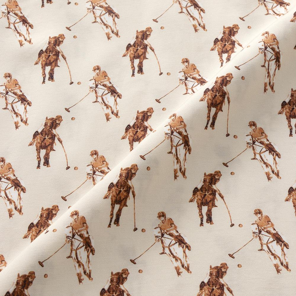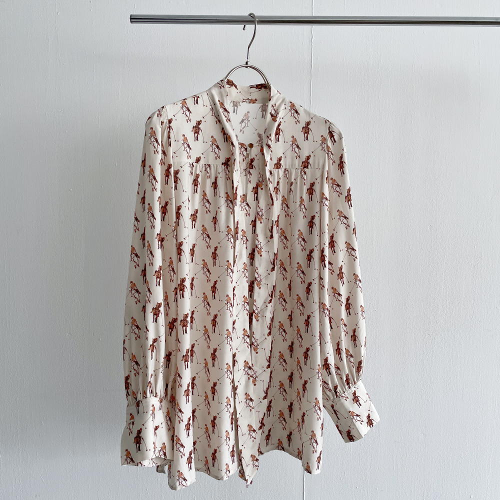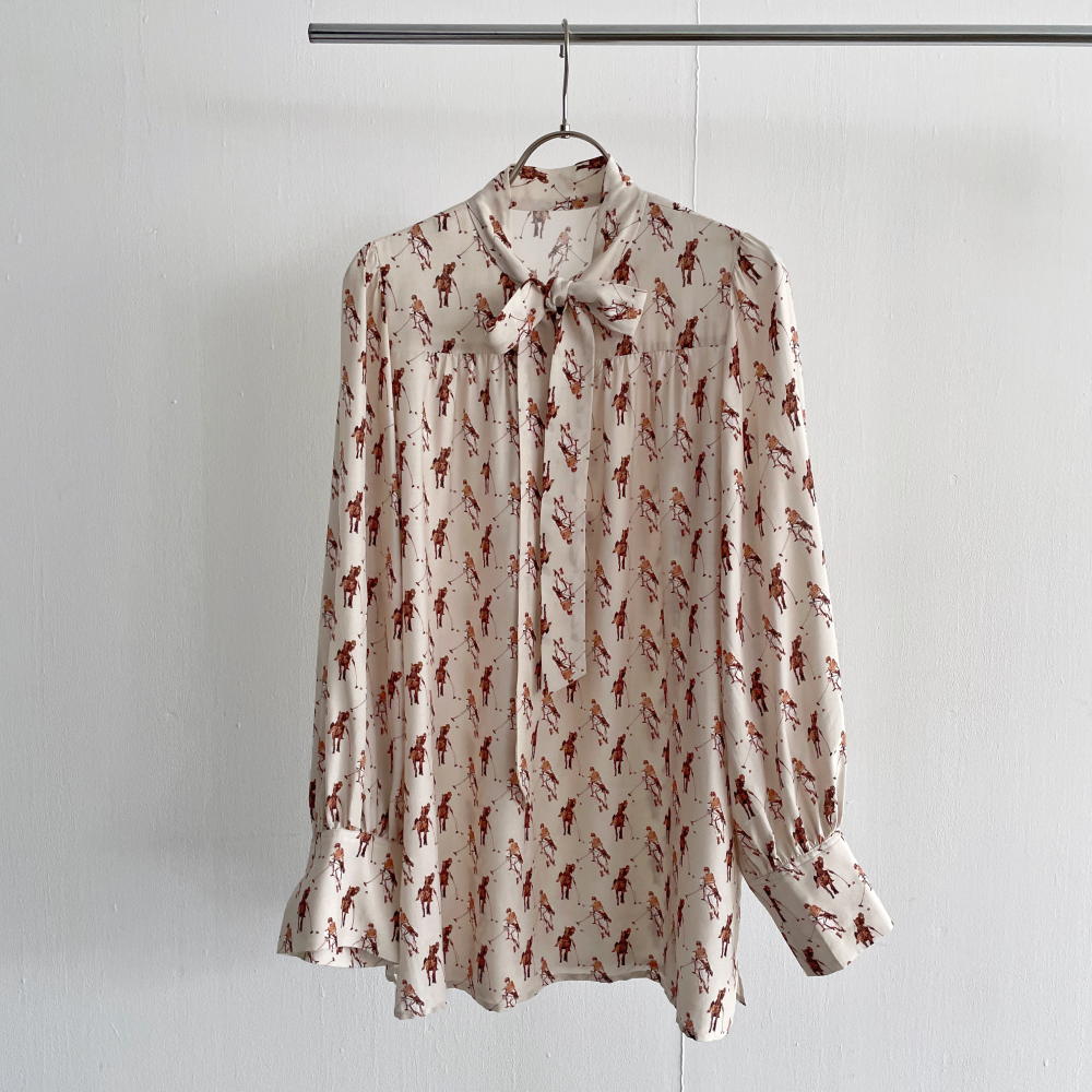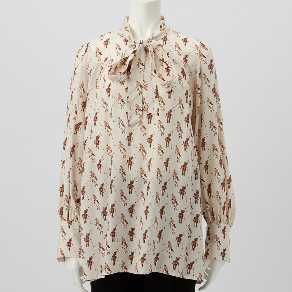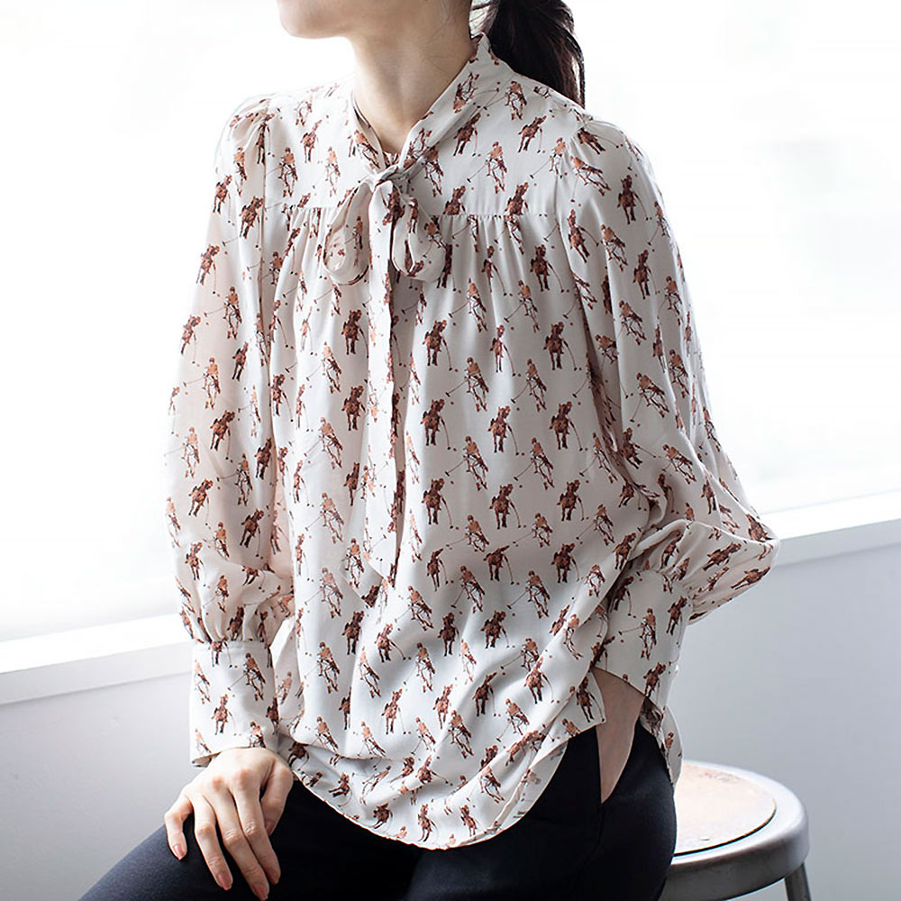 トルコのプリントメーカー「IPEKER(イペカ)」社の素材を使用したブラウスは、伝統あるポロ競技をモチーフとしたプリントがトラッドな印象。リボンのようなボウタイが映えるデザインです。セットインのたっぷりとしたパフスリーブは、そのままではもちろん、たくし上げて腕に留まり、カフスを折ると六分袖にもなる優れもの。身頃は前と後ろにヨーク切り替えで少しギャザーを入れて、たっぷりとした分量感が魅力です。両脇裾には小さなスリットを入れているので、インしなくても動きが生まれます。【IPEKER(イペカ)社】創業100年以上のトルコの老舗プリントメーカー。長い歴史の中で培われた技術に加え、織り・プリント・生産まで一貫工程の為安定した品質を保っています。またプリント溶剤や、汚水の削減加工時に出る廃液を利用した自家発電設備など、サスティナブルで環境にも配慮しています。特別な技術でソフトで軽やかに仕上げた生地の風合いを是非お楽しみください。